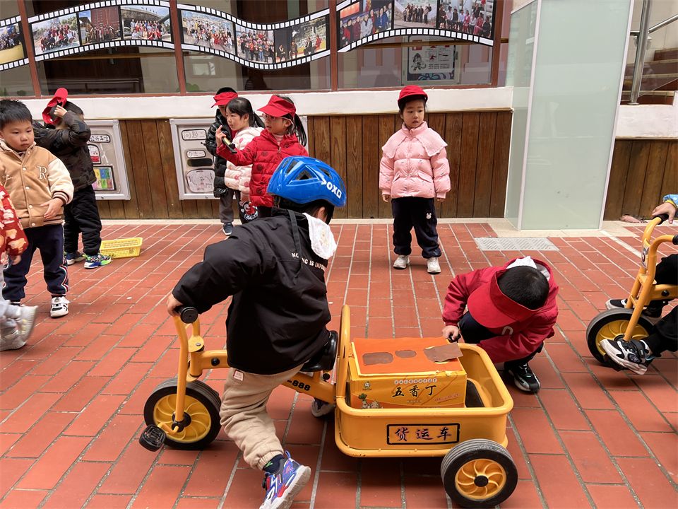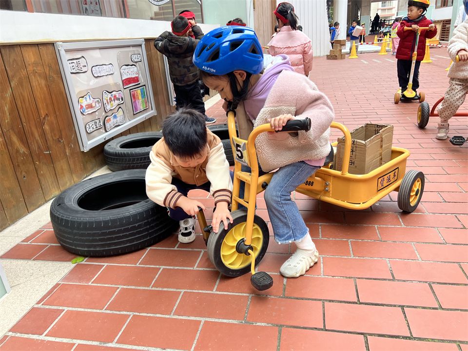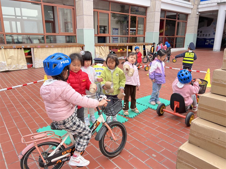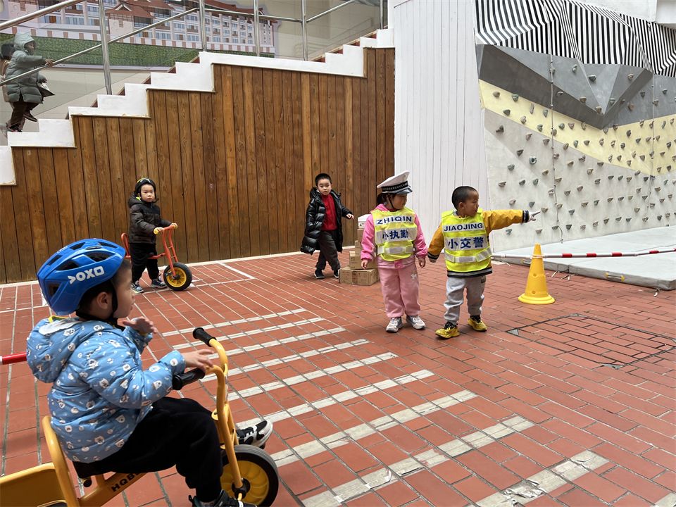 瞧!操场上,孩子们自由选择喜欢的出行车辆,三三两两地一起玩耍着。小警察正在路口维持秩序,保护行人;修车厂的小小修理员正在认真地修着车,更有“菜鸟驿站”的快递员为大家配送快递。