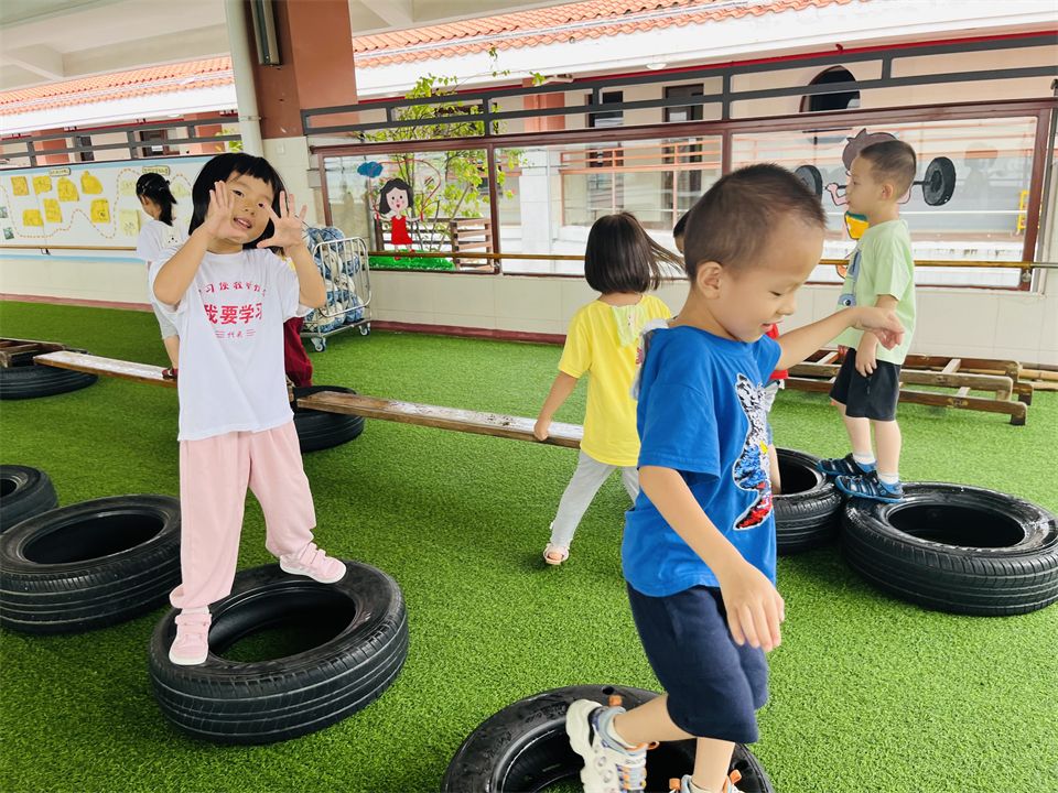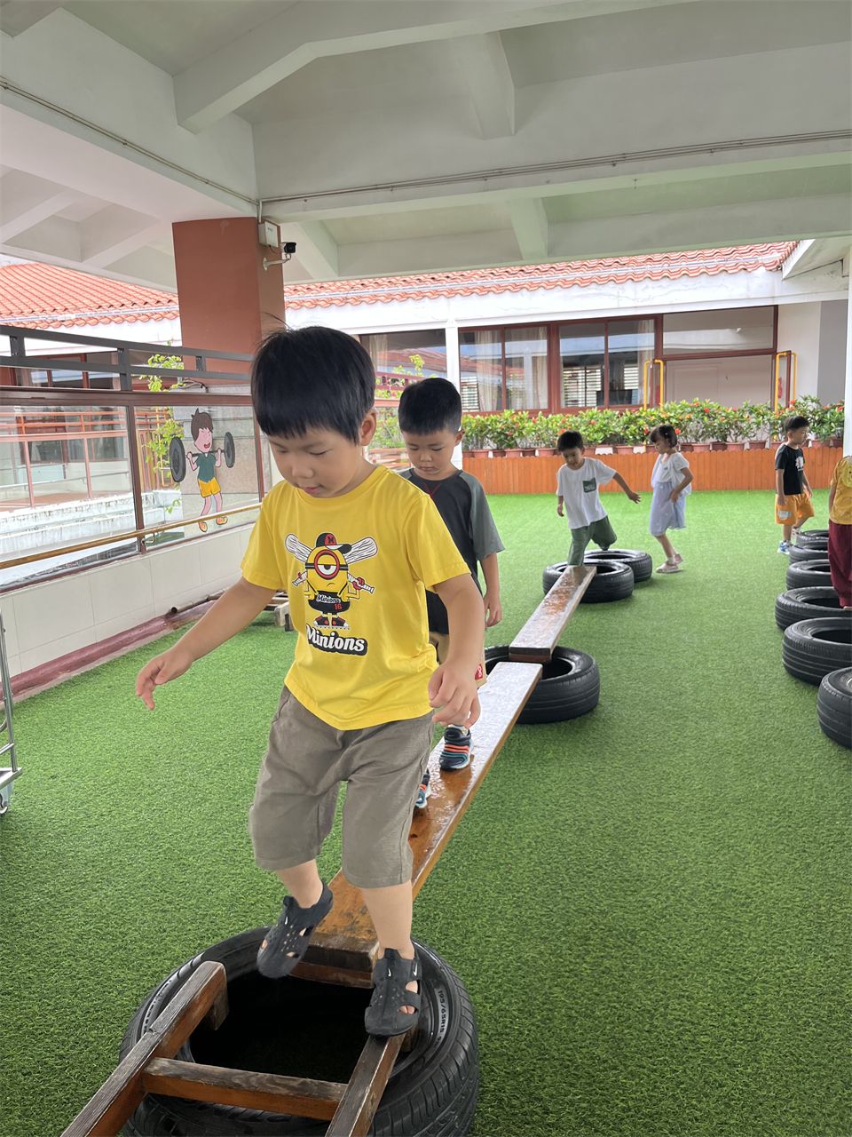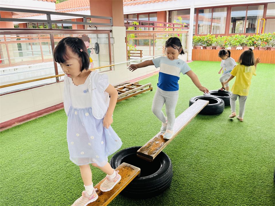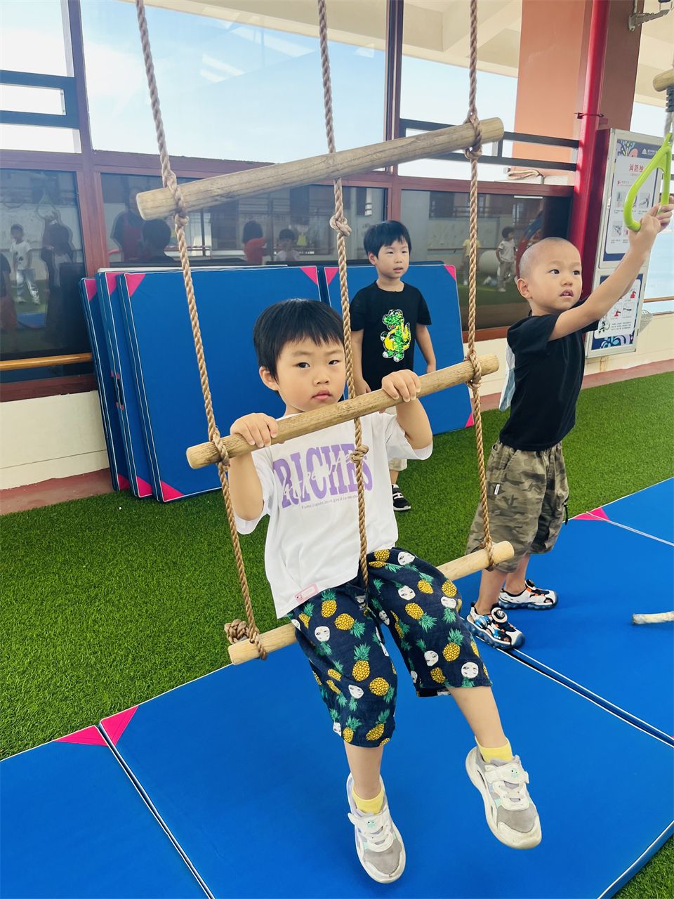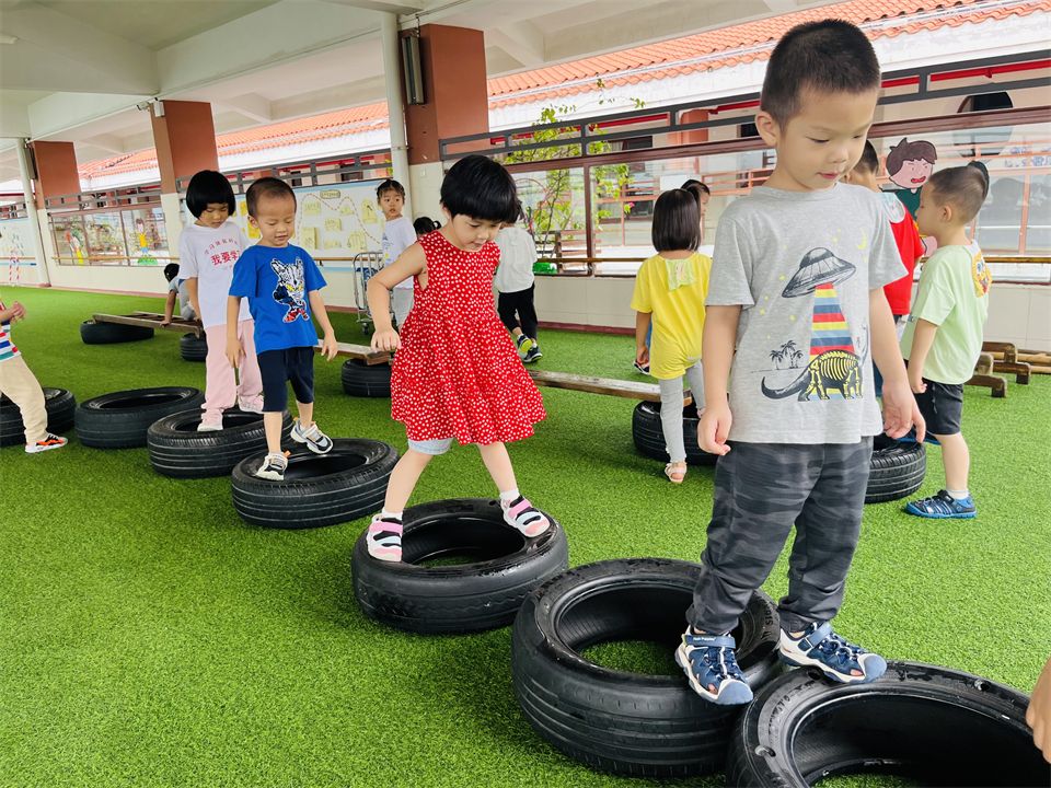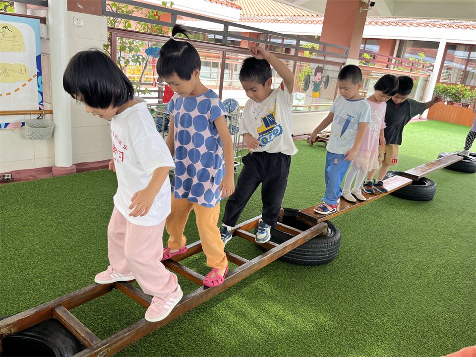 中班的孩子不仅更自主,更能干,而且还变得更勇敢了。瞧,中四班的孩子们在户外场地上驰骋着。简单的木板桥对孩子们丝毫没有挑战,于是将重重的轮胎和木板、梯子组成独木桥,增加游戏的挑战性。攀爬绳也不在话下,一个个跟小猴子似的,玩得不亦乐乎。