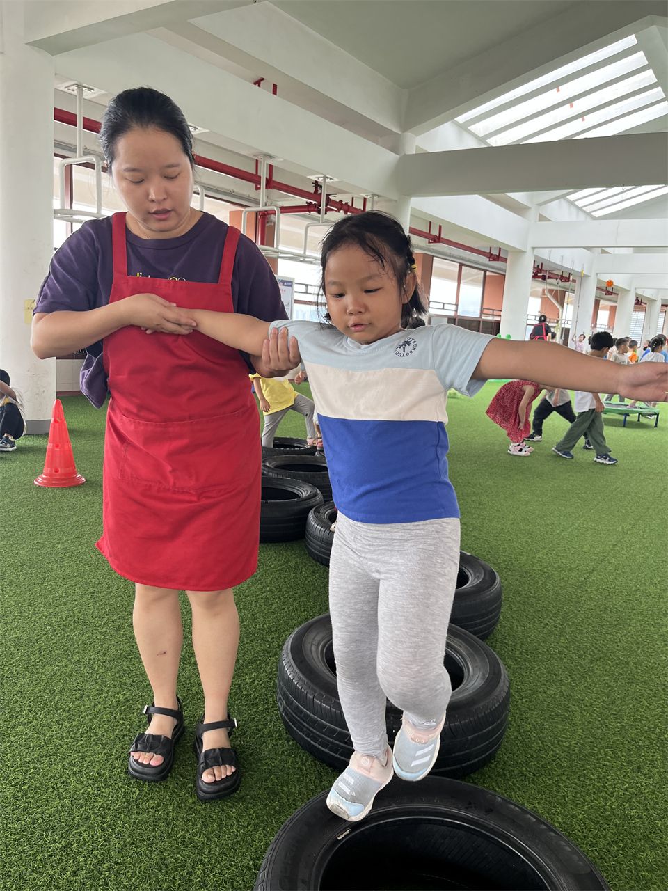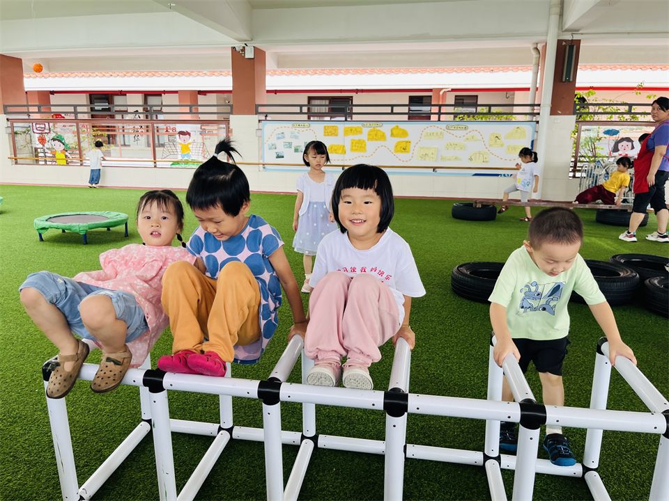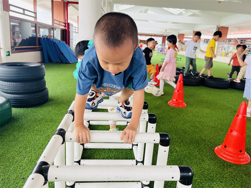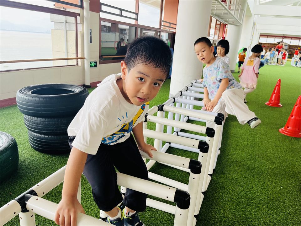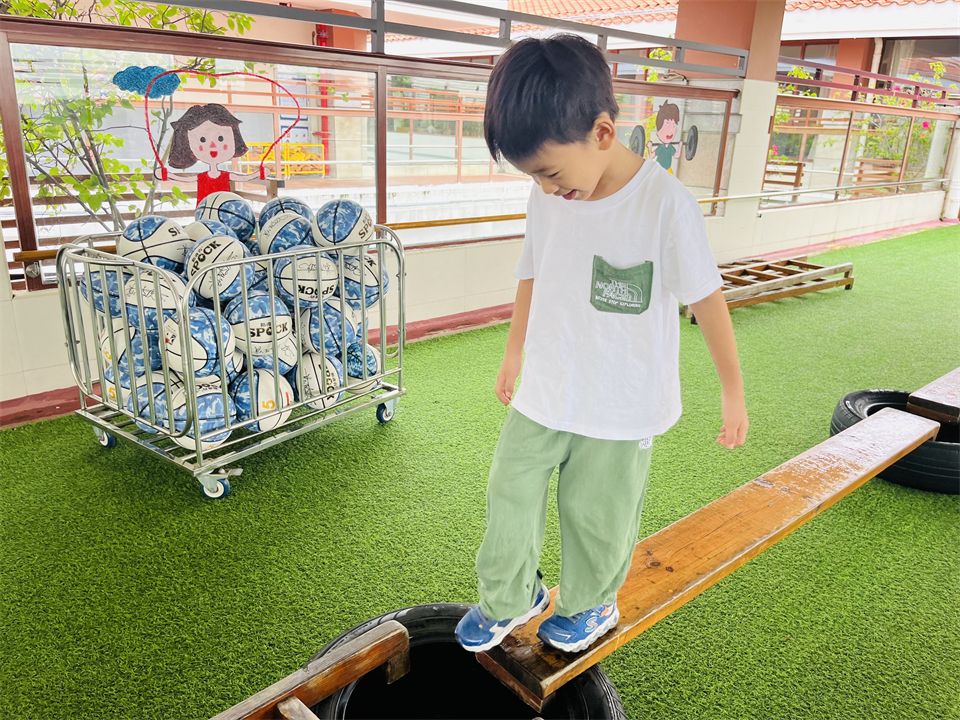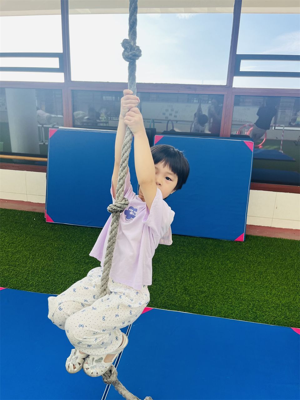 中班的孩子不仅更自主,更能干,而且还变得更勇敢了。瞧,中四班的孩子们在户外场地上驰骋着。简单的木板桥对孩子们丝毫没有挑战,于是将重重的轮胎和木板、梯子组成独木桥,增加游戏的挑战性。攀爬绳也不在话下,一个个跟小猴子似的,玩得不亦乐乎。