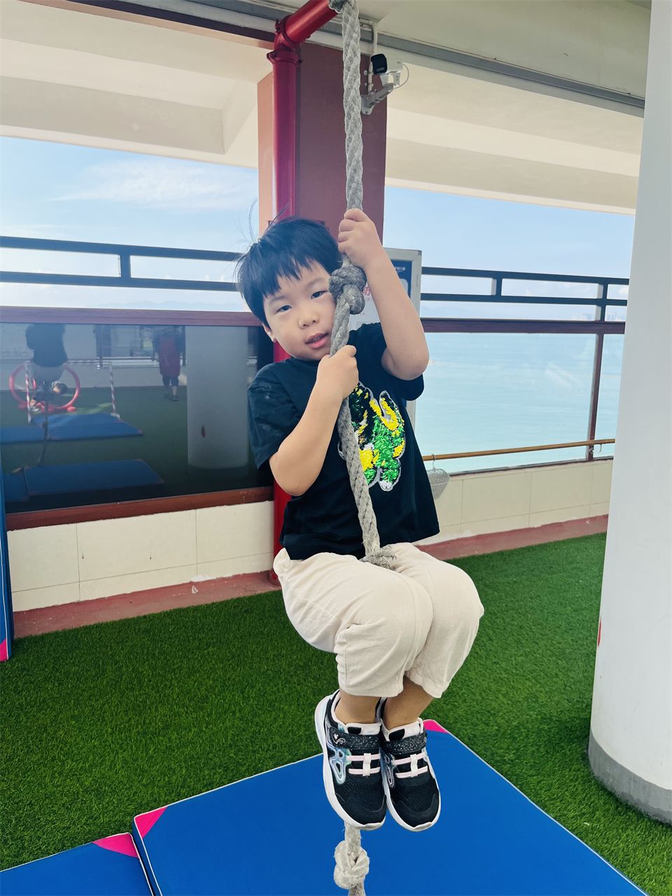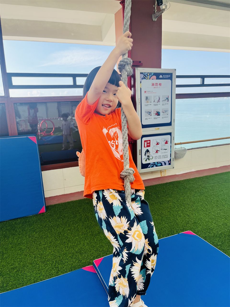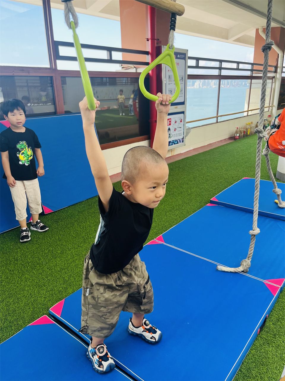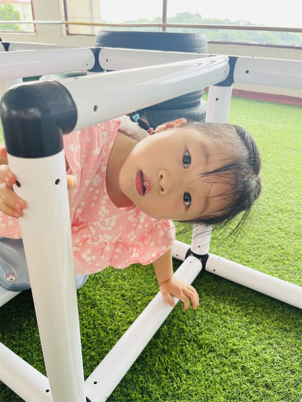 中班的孩子不仅更自主,更能干,而且还变得更勇敢了。瞧,中四班的孩子们在户外场地上驰骋着。简单的木板桥对孩子们丝毫没有挑战,于是将重重的轮胎和木板、梯子组成独木桥,增加游戏的挑战性。攀爬绳也不在话下,一个个跟小猴子似的,玩得不亦乐乎。