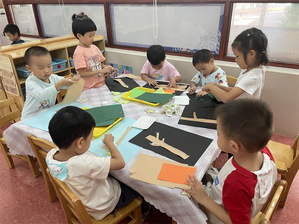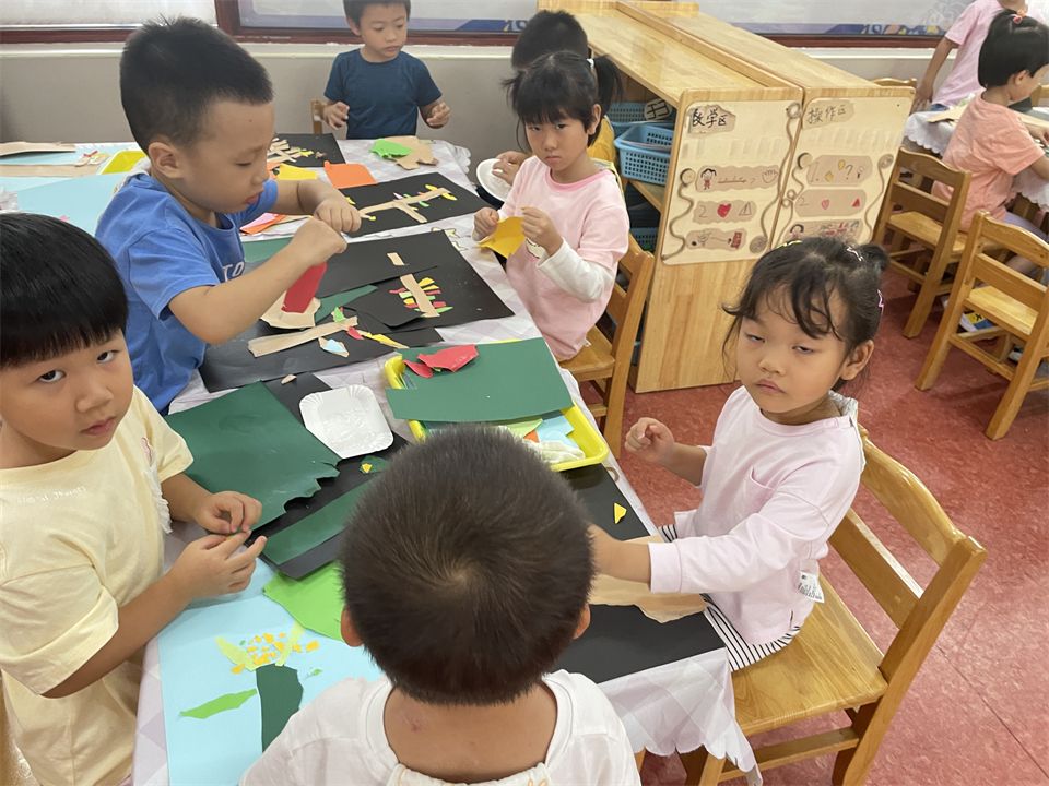 秋天来了,叶子变黄了,孩子们用各色彩纸贴出一片片小树林。