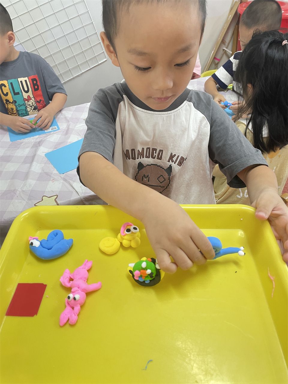 听说爸爸妈妈要来幼儿园了,孩子们就开始给爸爸妈妈一个小惊喜。看,孩子们用超轻粘工边制作边讨论“我妈妈最害怕蛇了,我要粘一个蛇送给她。”“我妈妈喜欢花,我做一朵花送给它。”“我要做一只特别的蜗牛给我爸。”不一会儿工夫,一个个可爱的小礼品新鲜出炉了。