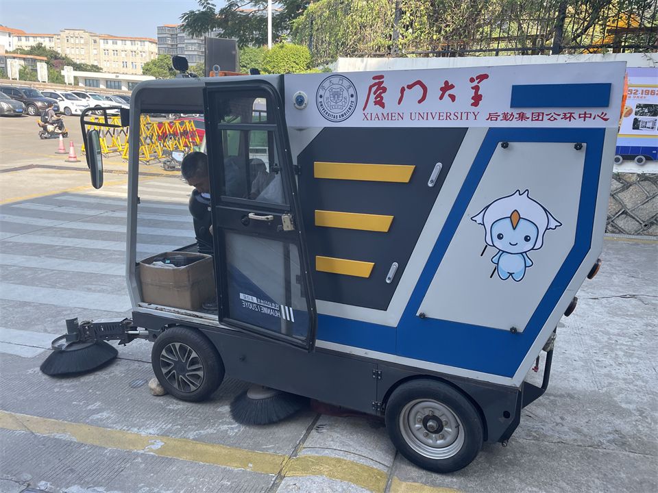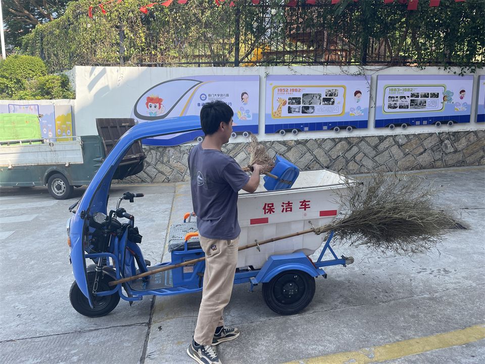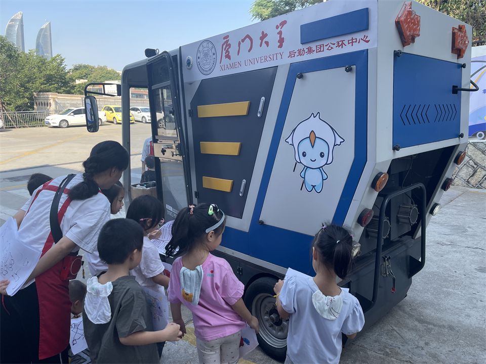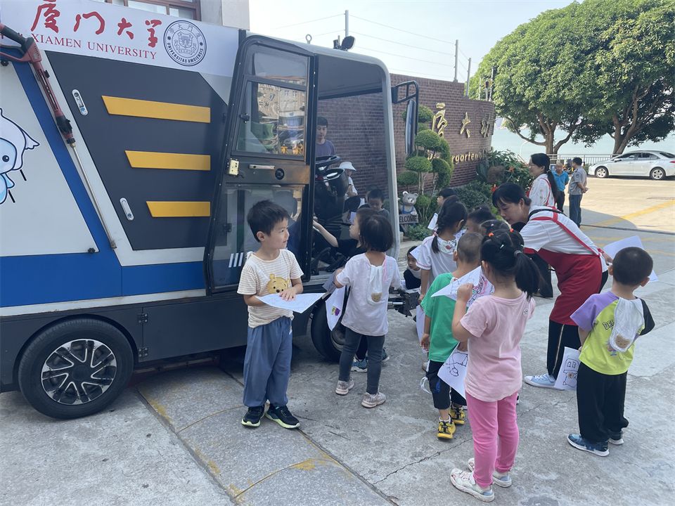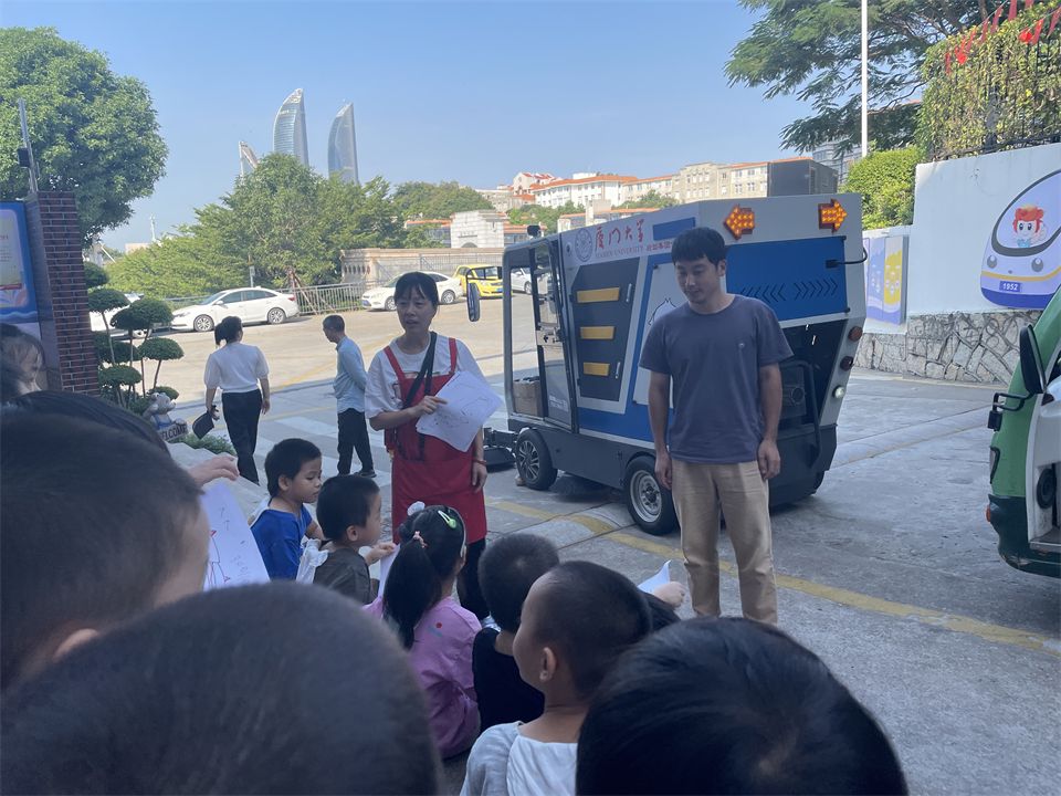 在湉言妈妈的支持下,我们联系了厦大学生公寓与环境服务中心,帮助中五班小朋友实现了愿望——近距离地观察了解了校园里道路清扫车、厨余垃圾转运车以及清洁车。瞧!它们来到了幼儿园门口。