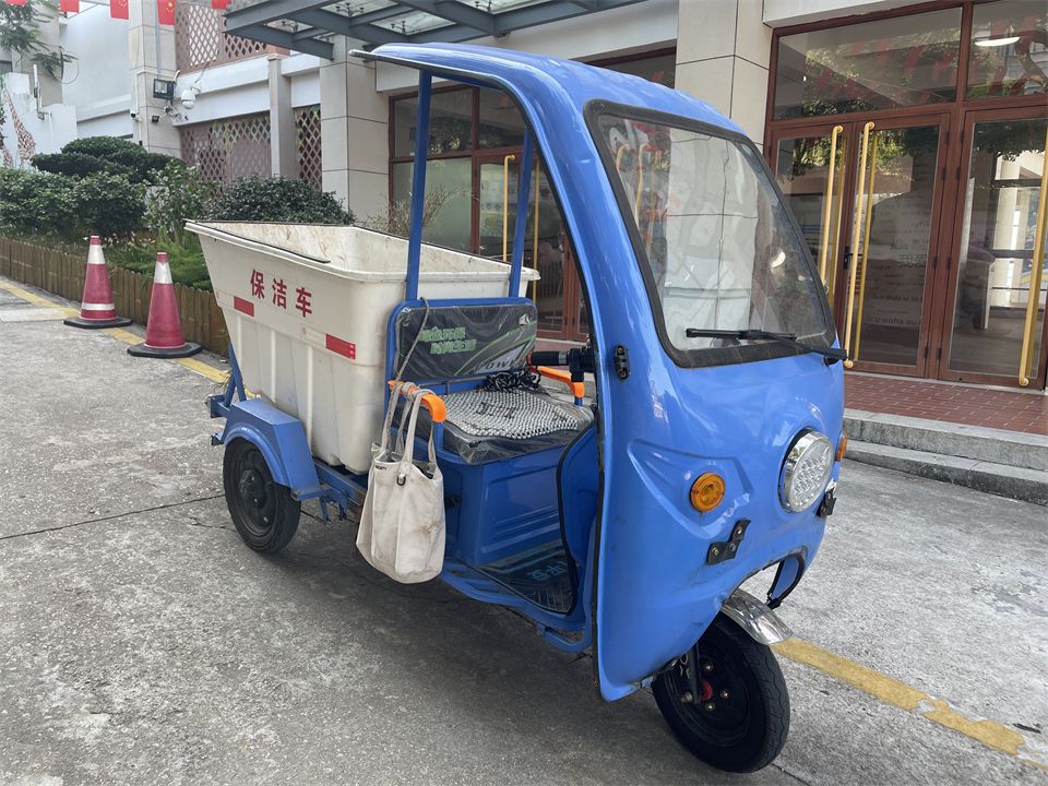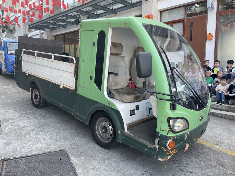 最后登场的是小巧的保洁车。车斗里的秘密由叔叔揭开了。车旁的大竹扫把能把垃圾扫起来,再用小扫地扫把扫到畚斗里,这个车也是即走即停,非常方便。