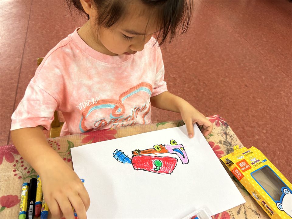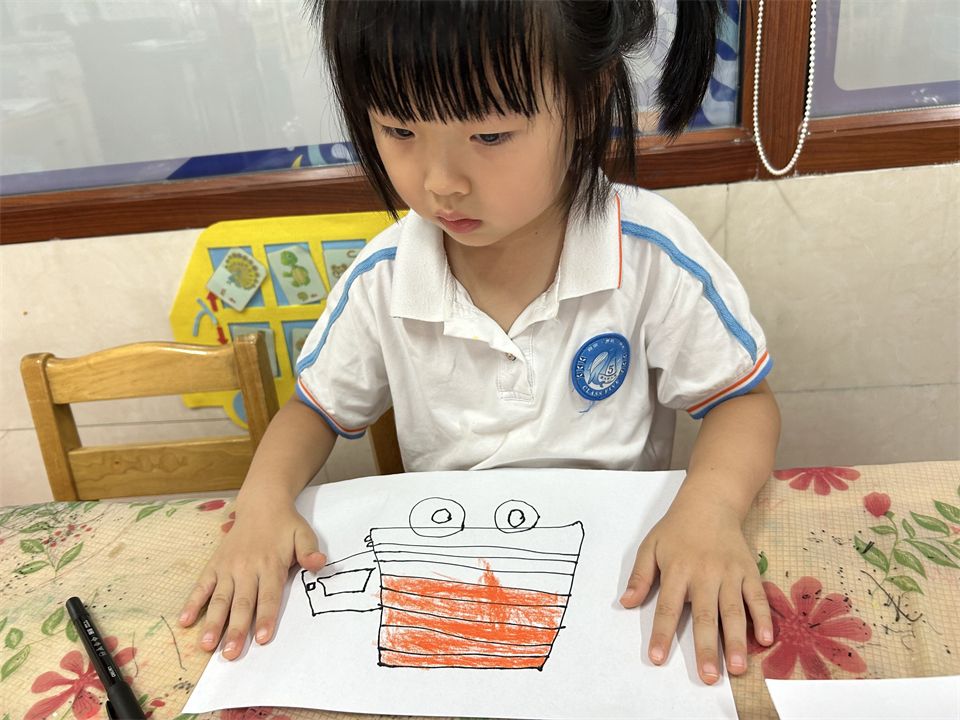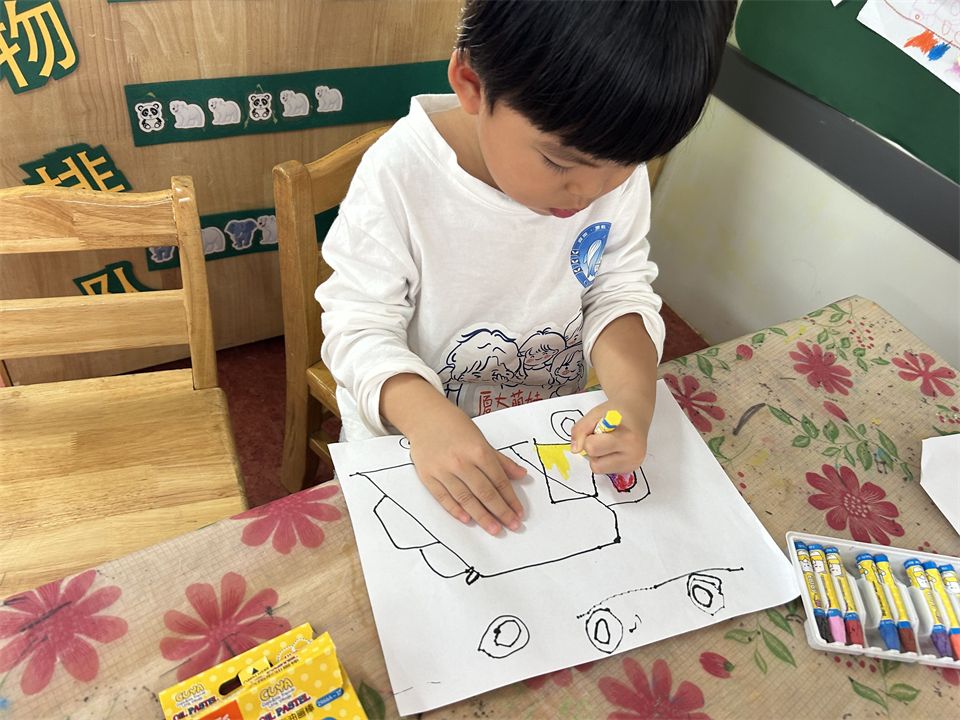 在班级里,我们让幼儿画出“眼中的垃圾车”,有的选择画清扫车,有的画垃圾转运车,五颜六色的卡通垃圾车在孩子稚嫩的笔下显得尤为可爱。这些画我们是要带着和真正的垃圾车比较的哦,我要认真点画。