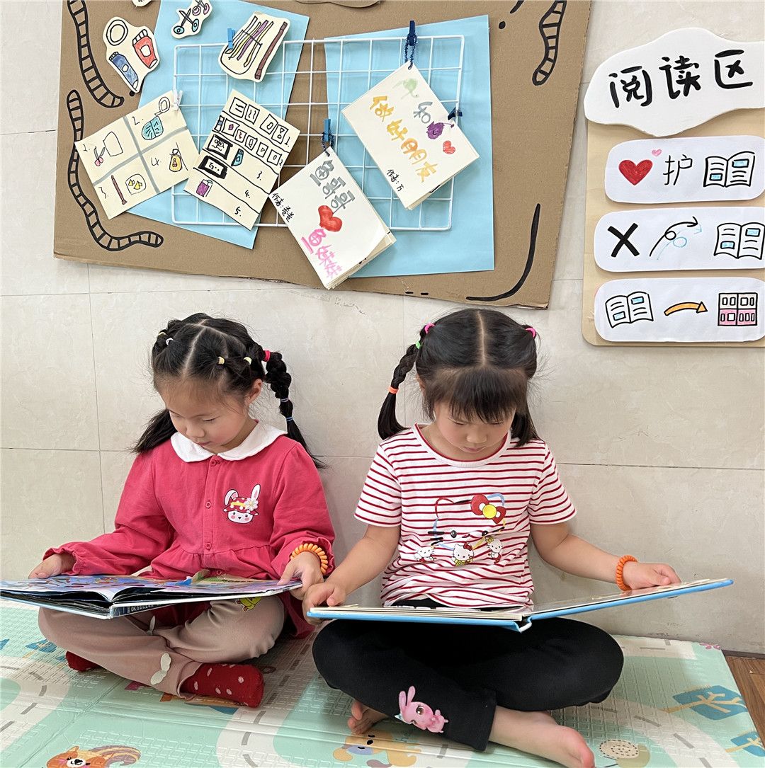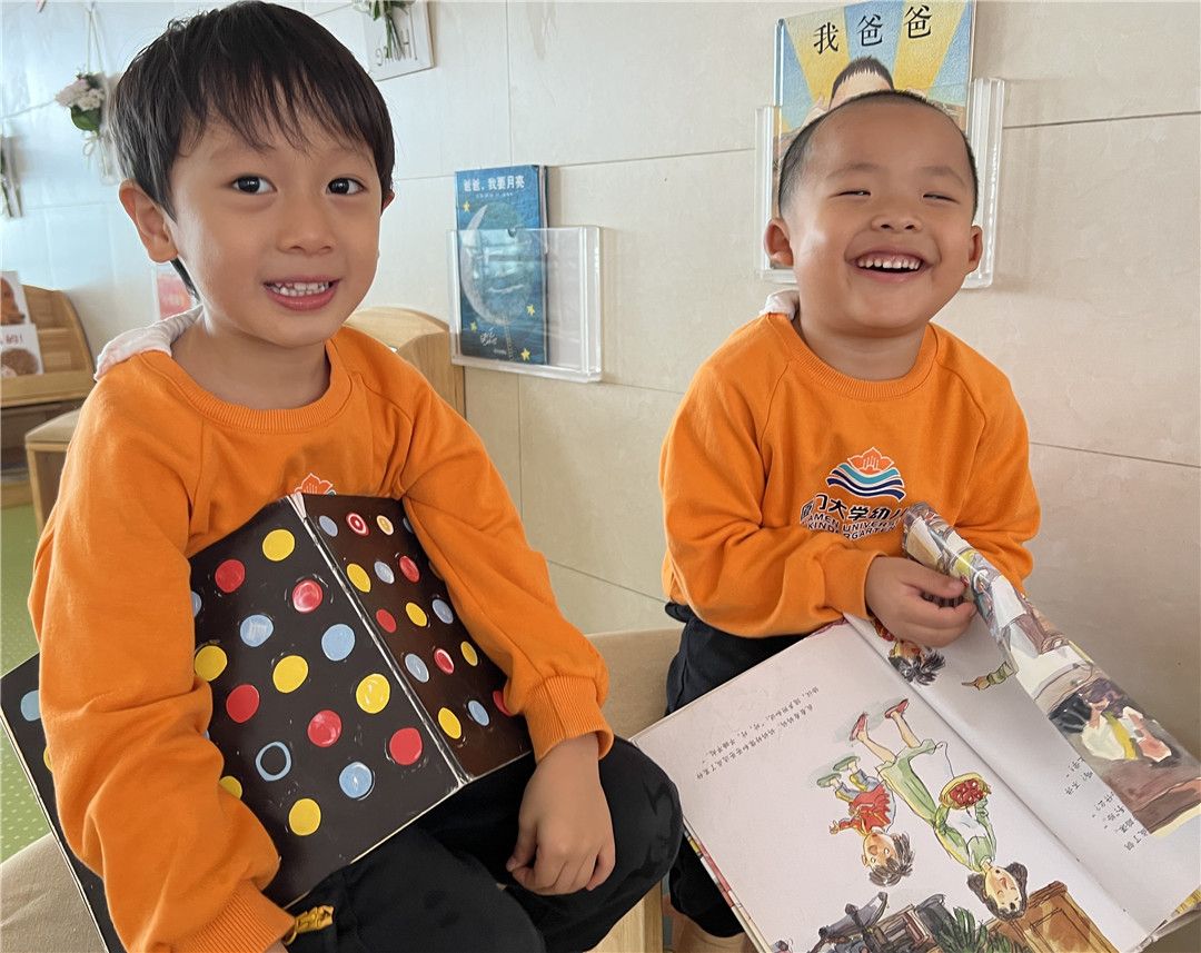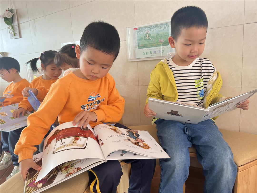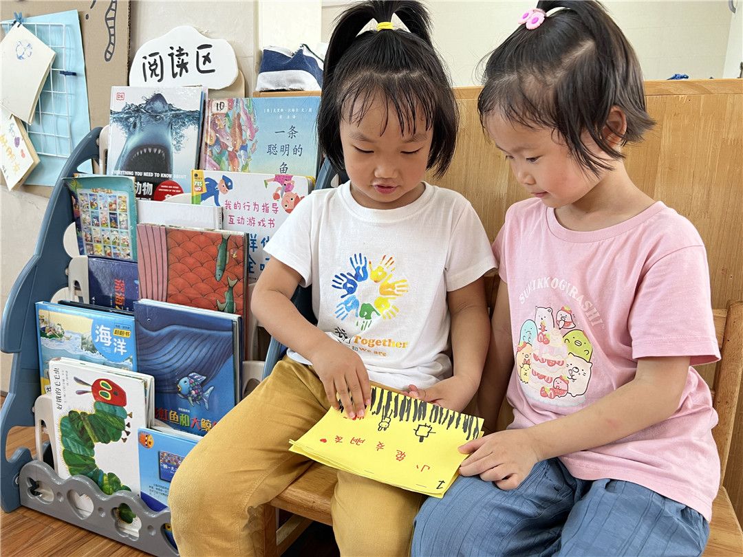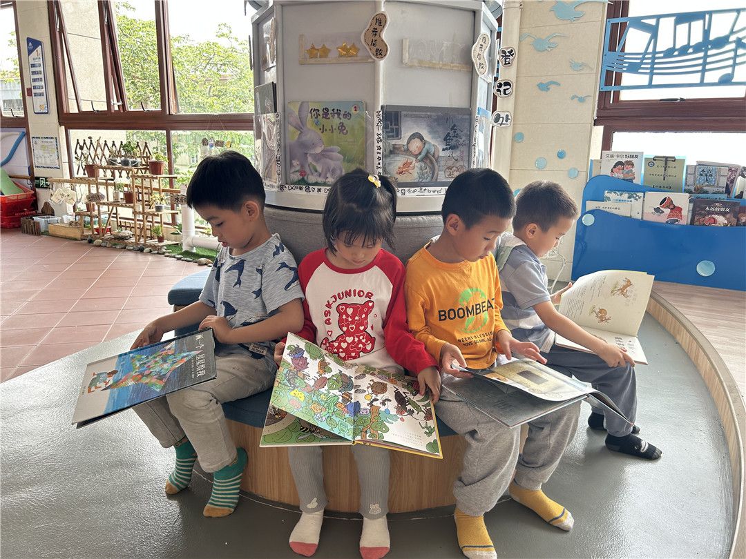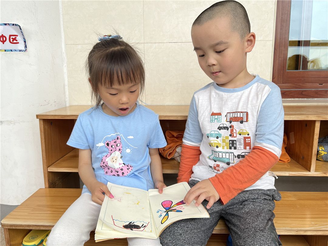 在班级活动室里、长廊上,孩子们把自己制作的绘本,和小伙伴们一起共同分享、阅读。这种共同阅读、相互分享的阅读方式,不仅让孩子有了“看”的机会,还给了孩子“讲”的机会,在朋友之间,对话会更轻松、更自然、更有利于表达内心的想法。窗外,小鸟在自由歌唱,其优美的旋律伴随着书香,流淌在孩子们纯净的心灵世界里......