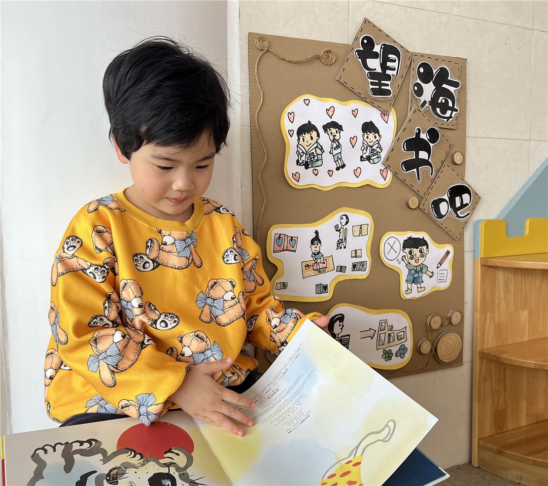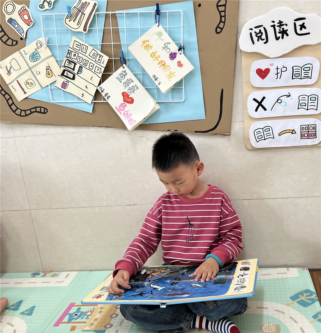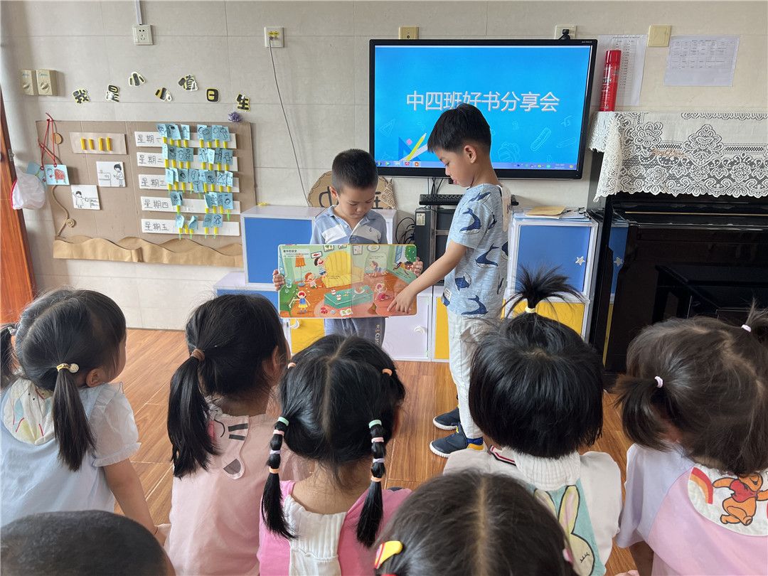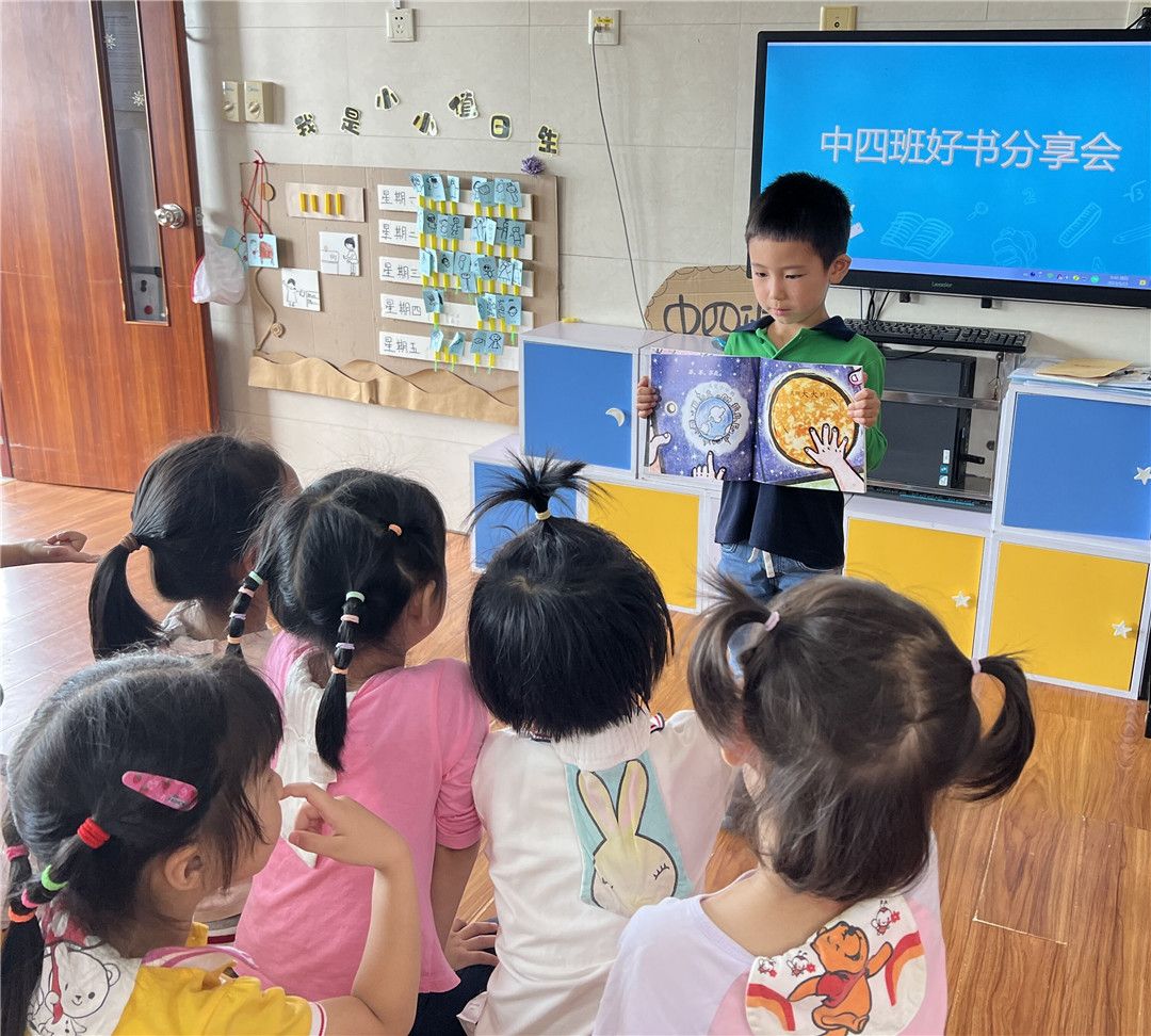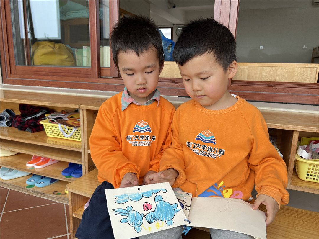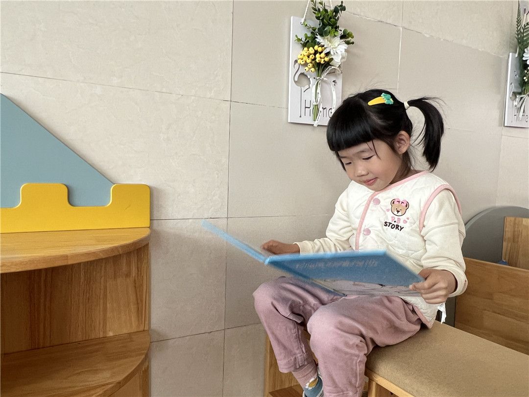在班级活动室里、长廊上,孩子们把自己制作的绘本,和小伙伴们一起共同分享、阅读。这种共同阅读、相互分享的阅读方式,不仅让孩子有了“看”的机会,还给了孩子“讲”的机会,在朋友之间,对话会更轻松、更自然、更有利于表达内心的想法。窗外,小鸟在自由歌唱,其优美的旋律伴随着书香,流淌在孩子们纯净的心灵世界里......