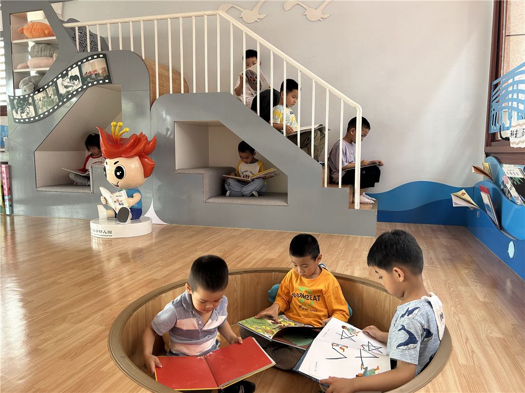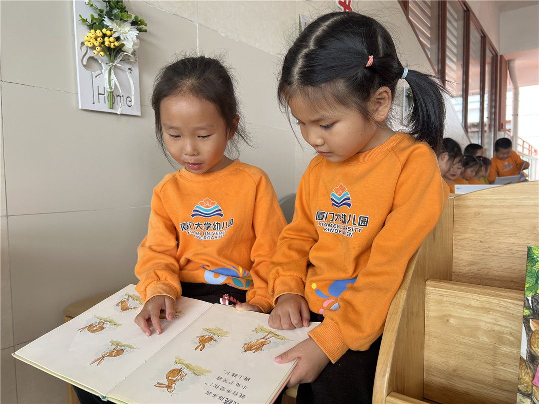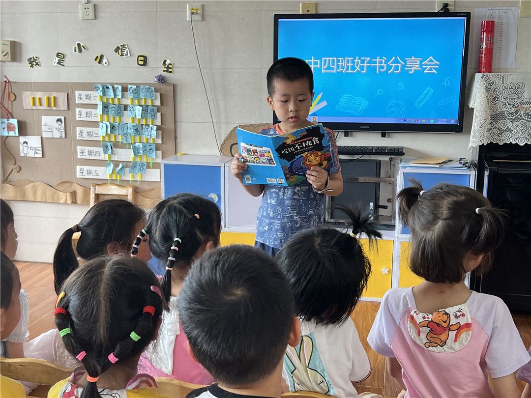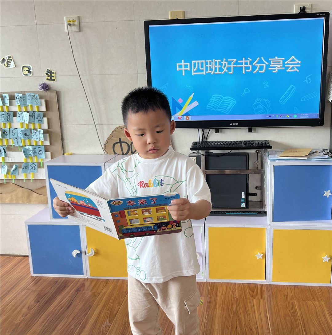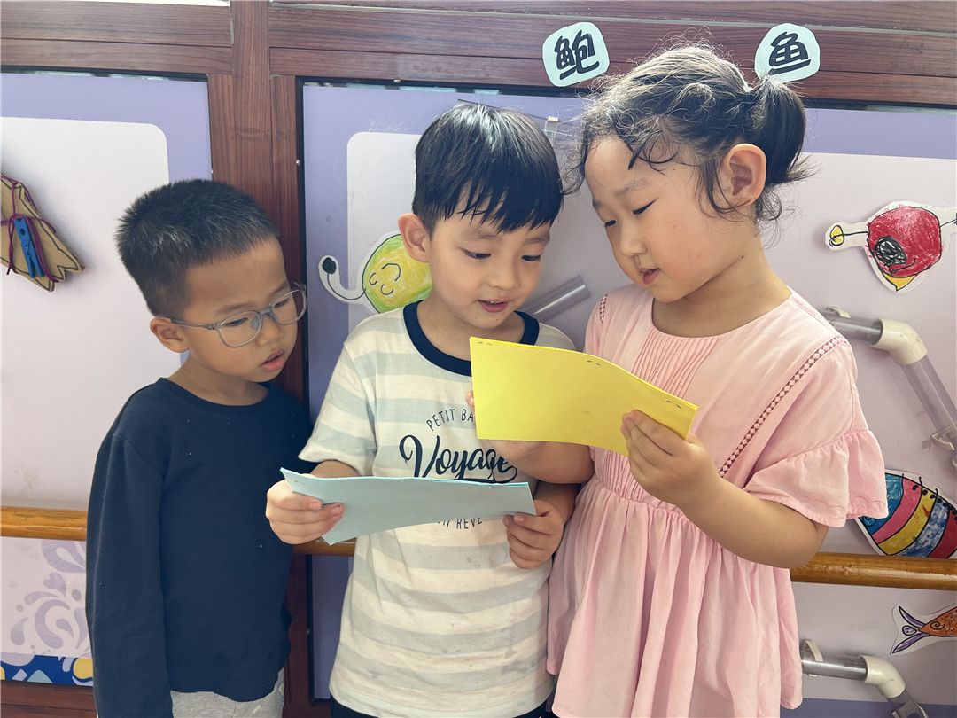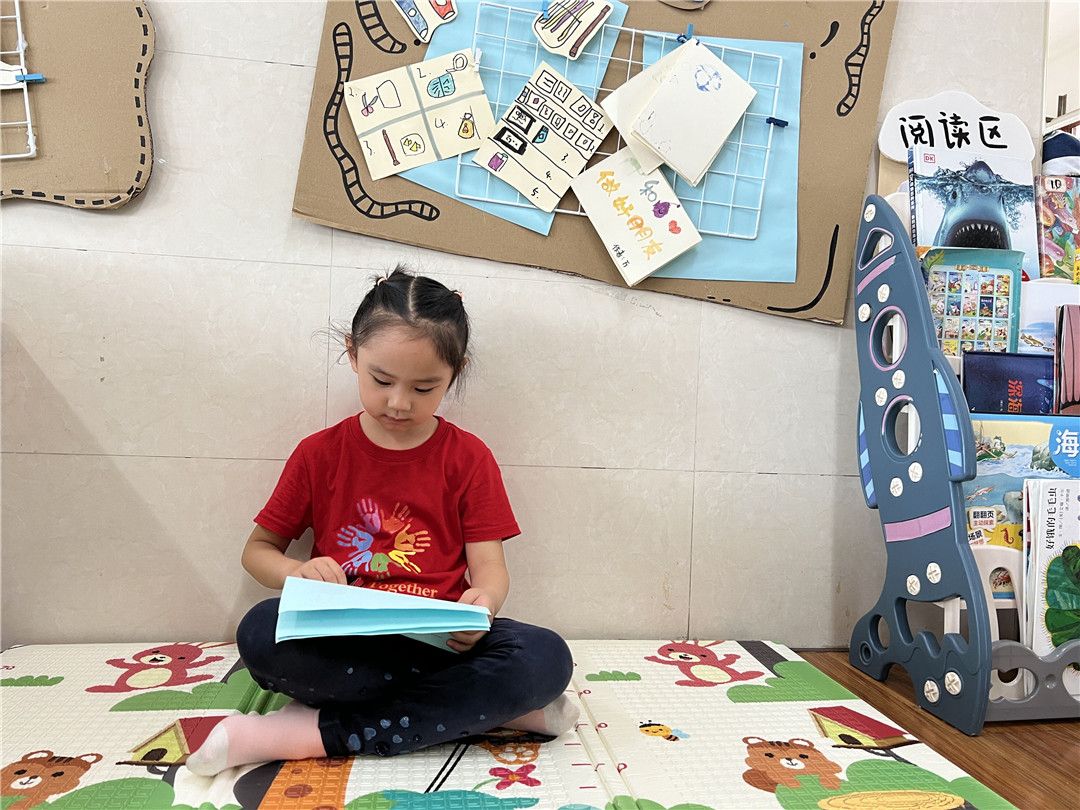 在班级活动室里、长廊上,孩子们把自己制作的绘本,和小伙伴们一起共同分享、阅读。这种共同阅读、相互分享的阅读方式,不仅让孩子有了“看”的机会,还给了孩子“讲”的机会,在朋友之间,对话会更轻松、更自然、更有利于表达内心的想法。窗外,小鸟在自由歌唱,其优美的旋律伴随着书香,流淌在孩子们纯净的心灵世界里......