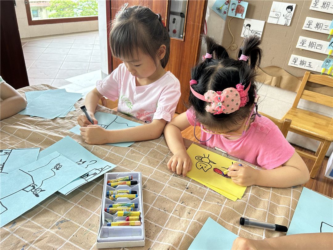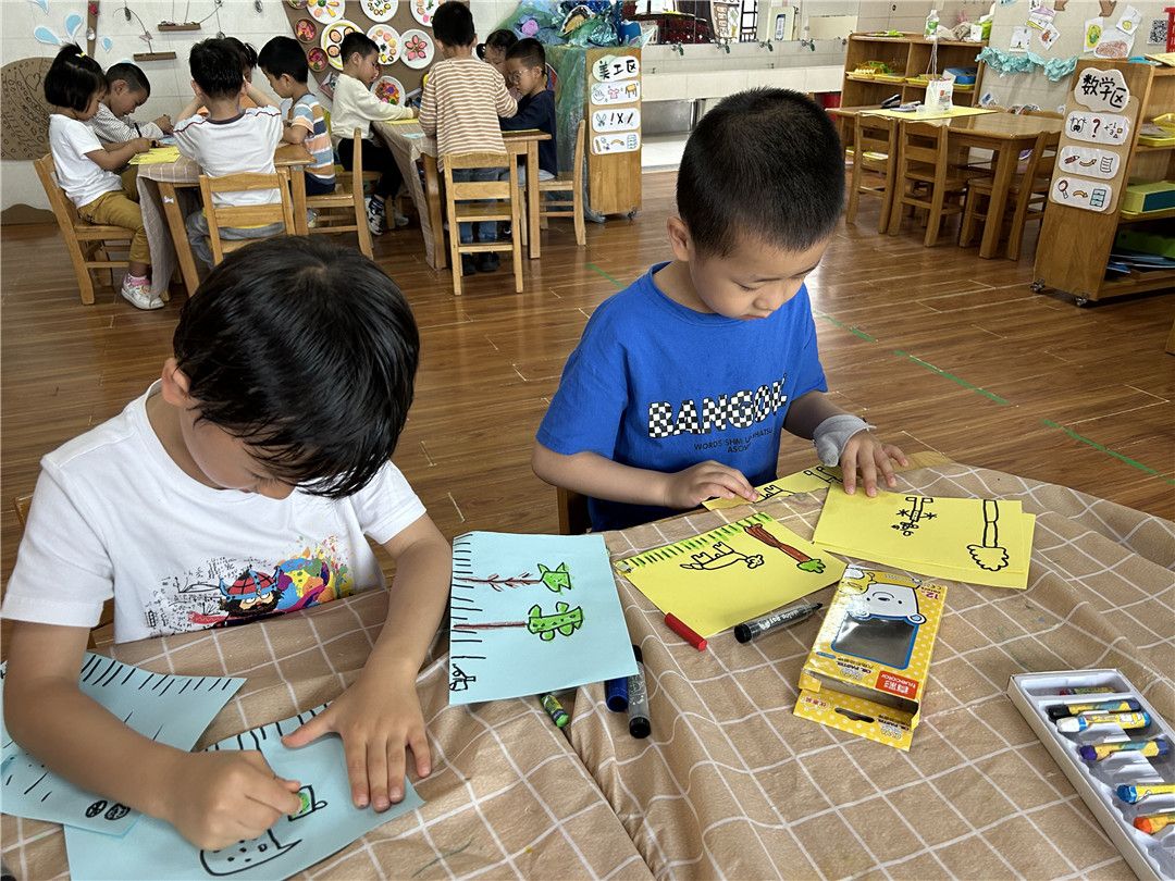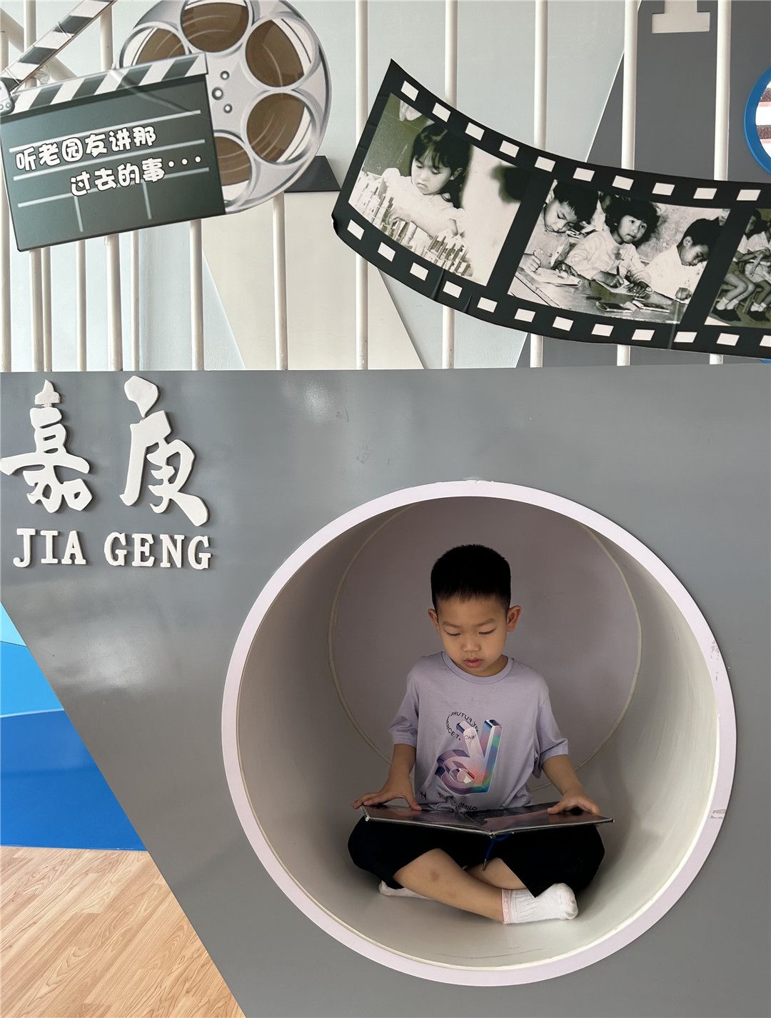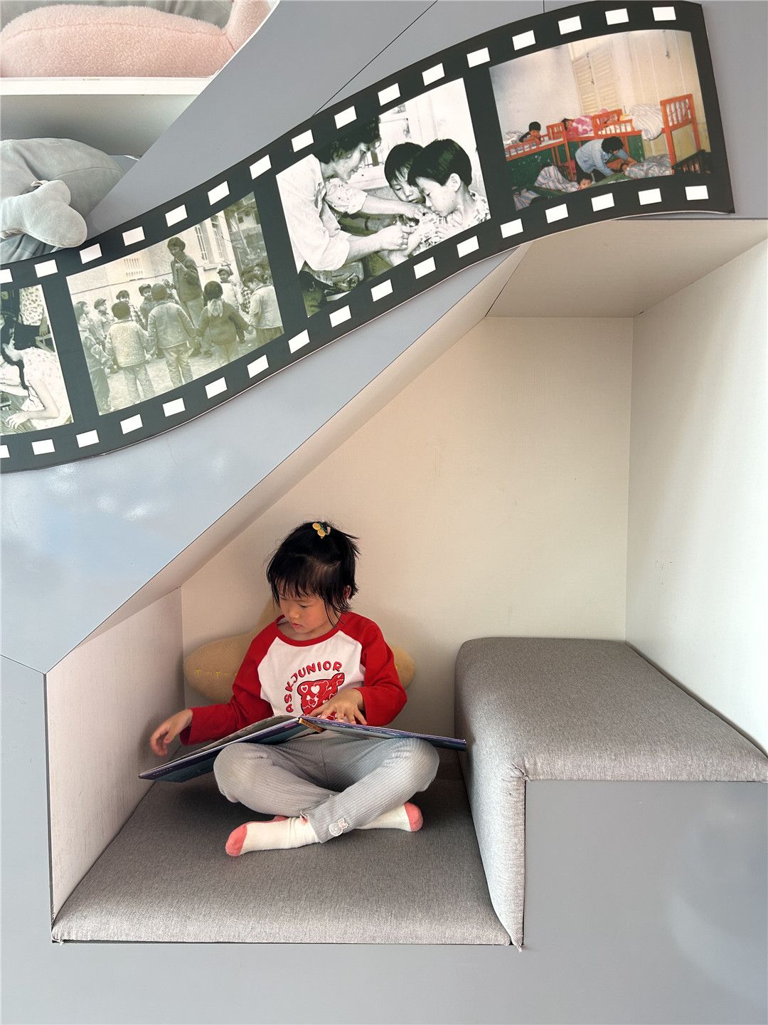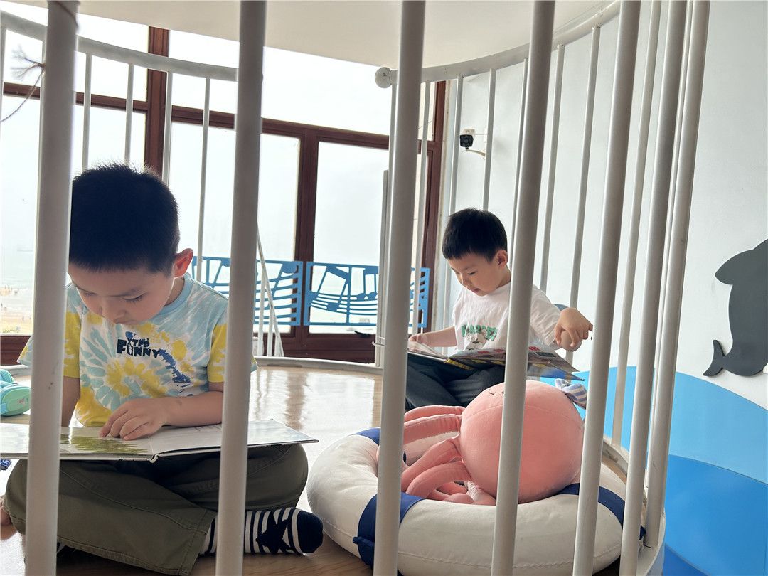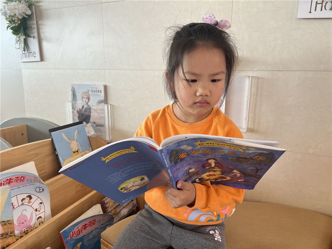 在班级活动室里、长廊上,孩子们把自己制作的绘本,和小伙伴们一起共同分享、阅读。这种共同阅读、相互分享的阅读方式,不仅让孩子有了“看”的机会,还给了孩子“讲”的机会,在朋友之间,对话会更轻松、更自然、更有利于表达内心的想法。窗外,小鸟在自由歌唱,其优美的旋律伴随着书香,流淌在孩子们纯净的心灵世界里......