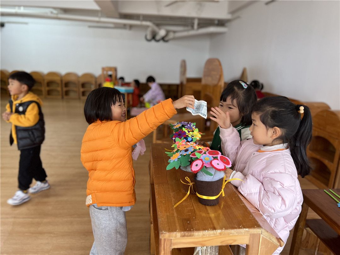 “快来买花呀!我们彩虹店里有很多漂亮的花哟!”熙熙拿着小喇叭卖力宣传,思思拿着宣传图在给搭建金字塔的小朋友介绍。