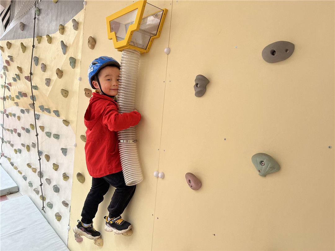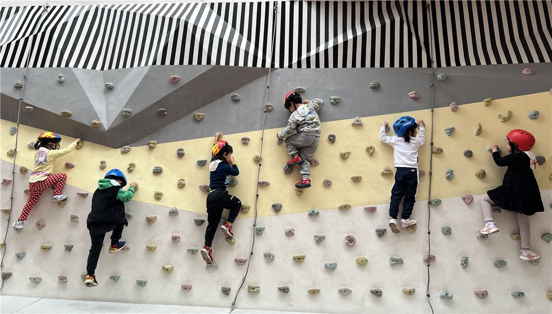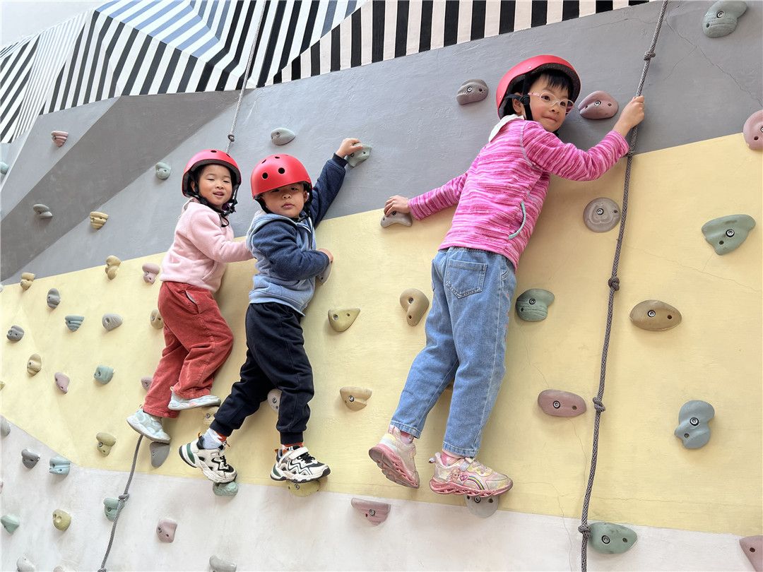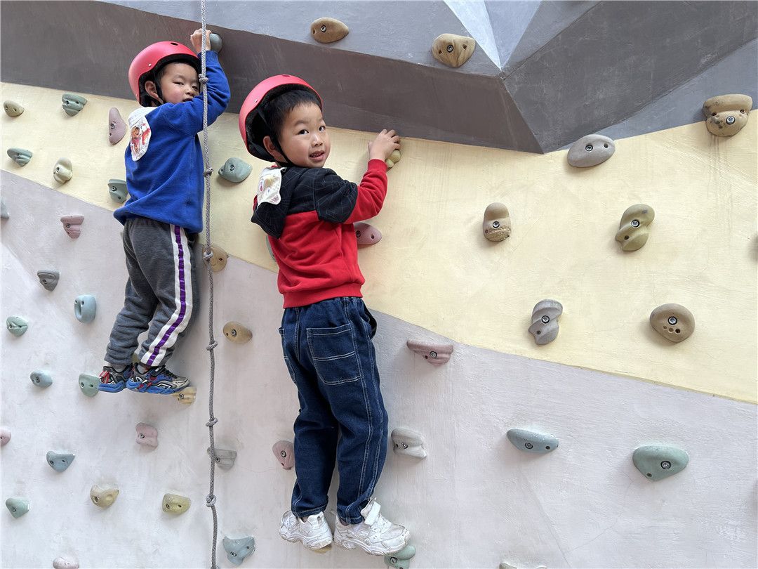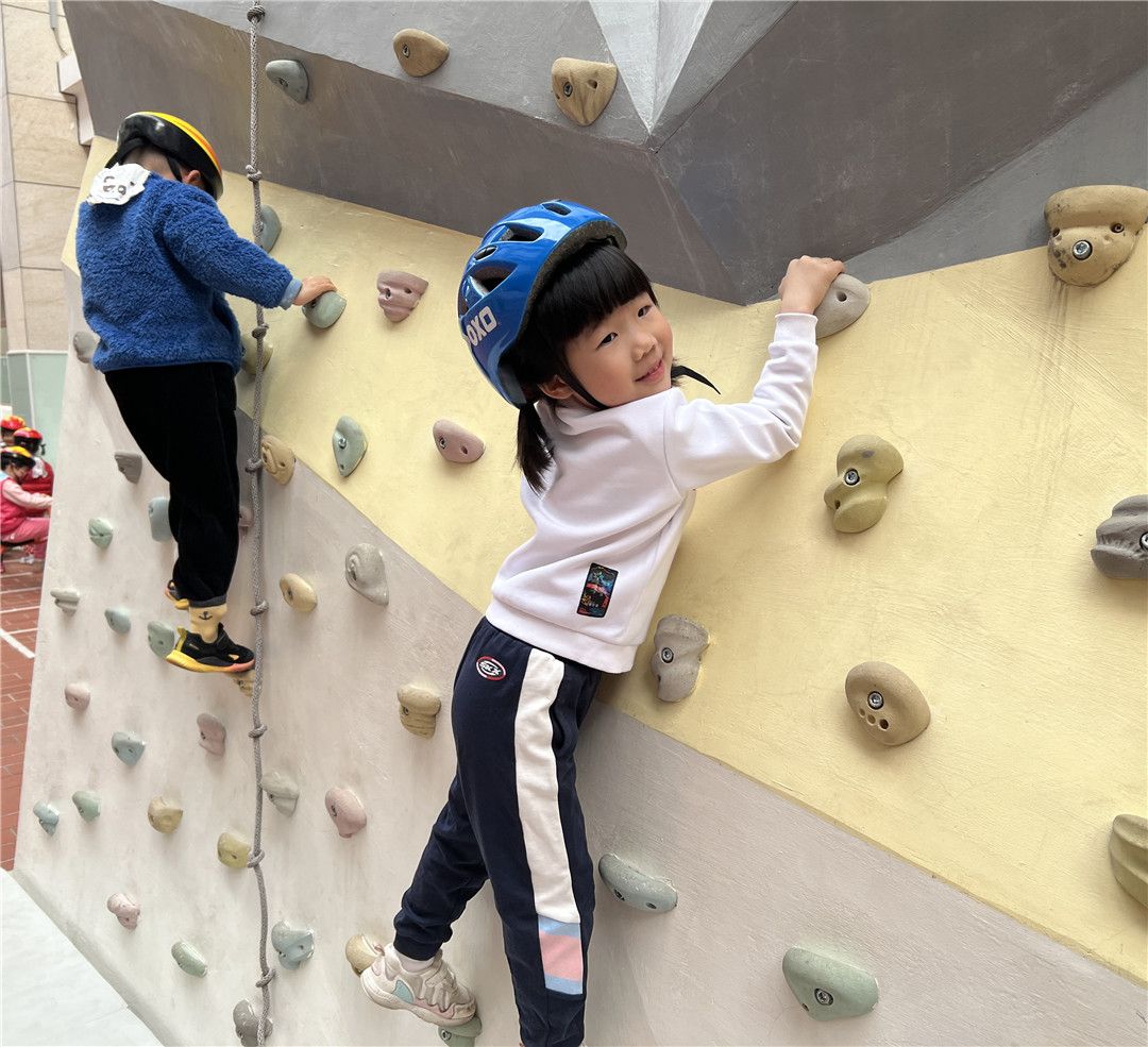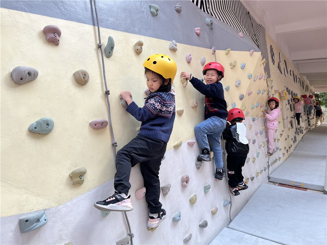 瞧!操场上,孩子们自由选择喜欢的自行车,三三两两地一起玩耍着。快来看看我们是怎么玩攀爬墙的,是不是很厉害呀?!