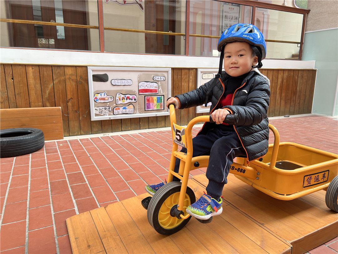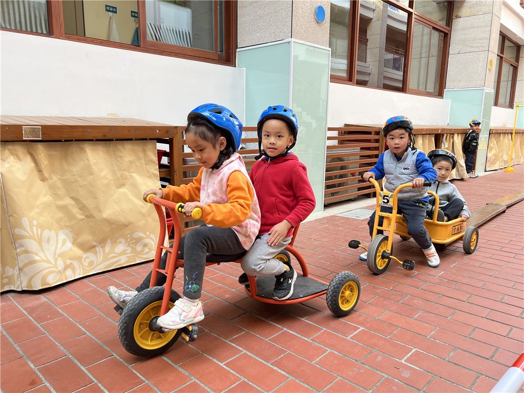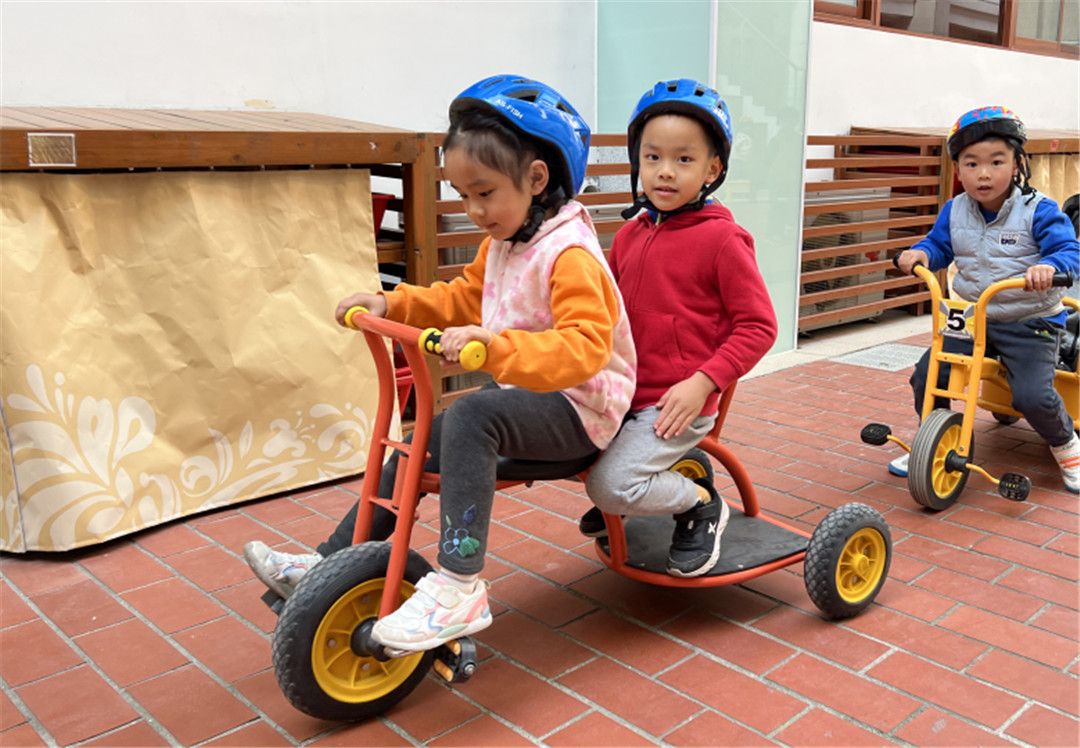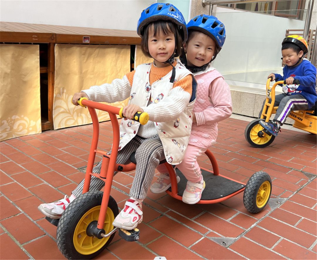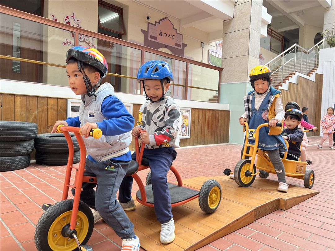 瞧!操场上,孩子们自由选择喜欢的自行车,三三两两地一起玩耍着。快来看看我们是怎么玩攀爬墙的,是不是很厉害呀?!
