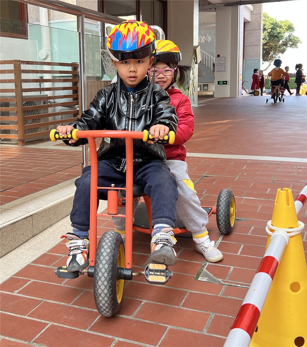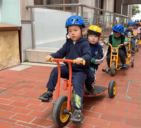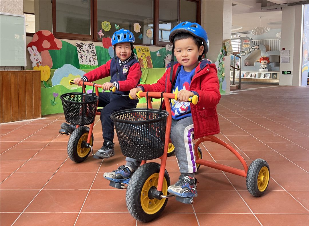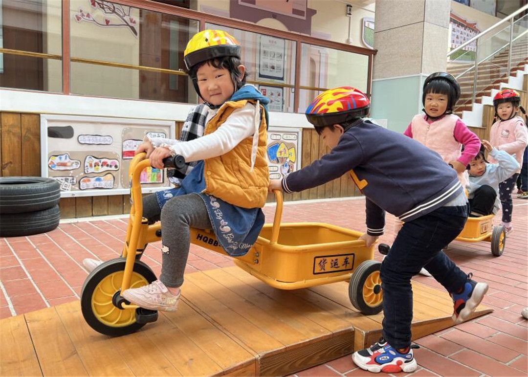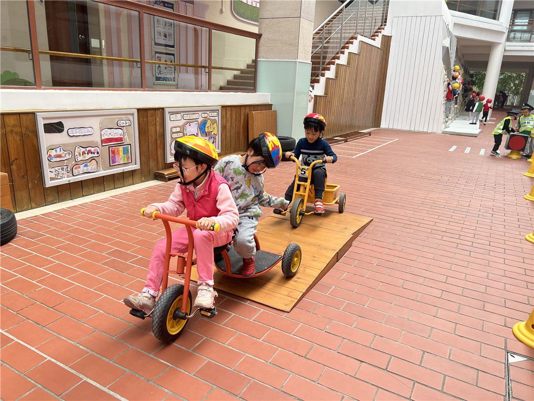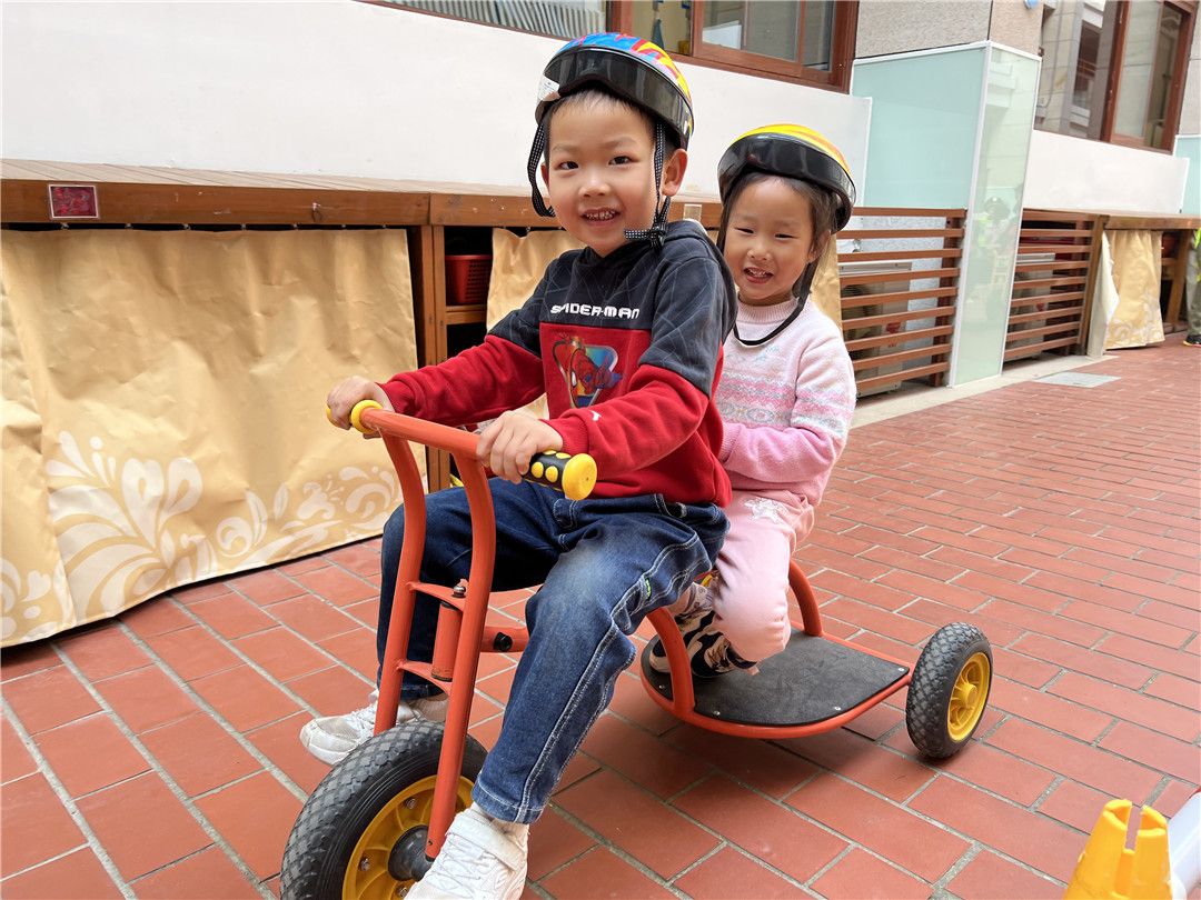 瞧!操场上,孩子们自由选择喜欢的自行车,三三两两地一起玩耍着。快来看看我们是怎么玩攀爬墙的,是不是很厉害呀?!