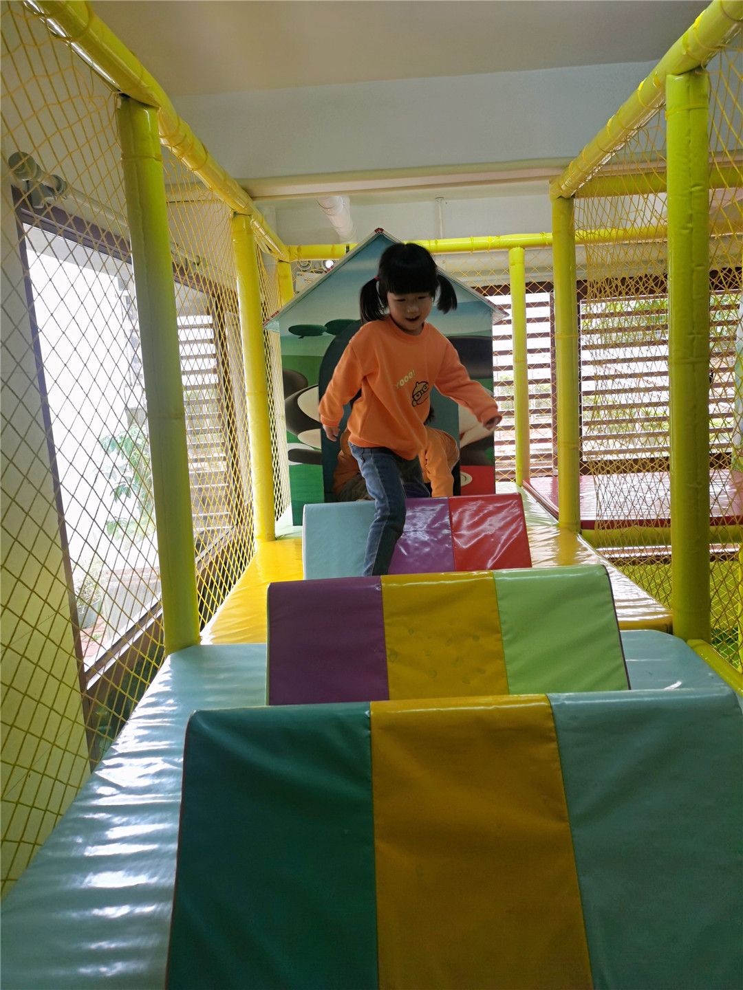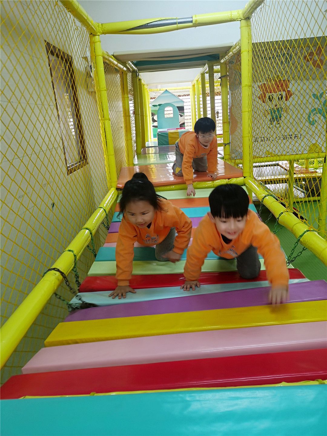 淘气堡里汇集了走、跑、跳、钻、爬、攀登等技能的游戏活动,小朋友们根据游戏规则,爬过荡荡桥、走过障碍物、钻过隧道……最后到达终点,真是玩得太开心了!
