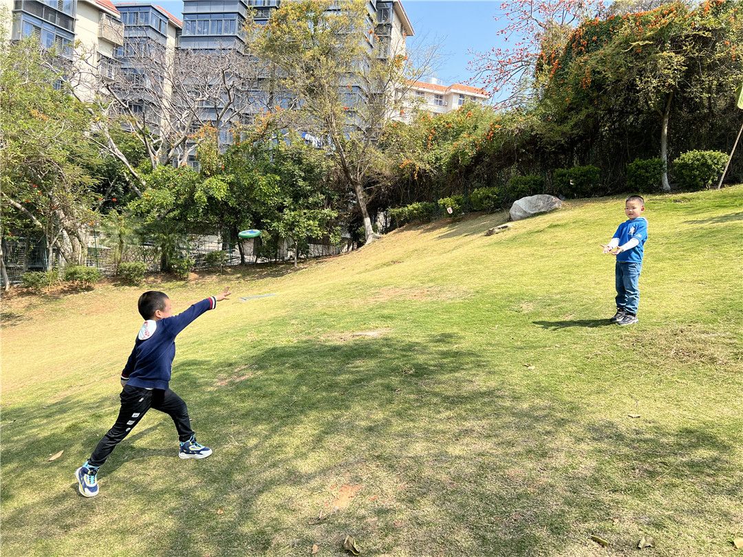 绿油油的山坡总是深受孩子们的喜爱,“我喜欢在小山坡玩降落伞的游戏。”“我们来比一比谁的降落伞飞得高!”还有的宝贝带着飞盘,站到高处,一起比着“看谁飞盘飞得远”。还有的宝贝甚至就是那么简单地迎风奔跑而下,满脸的灿烂笑容,他们一起找寻着山坡的秘密……