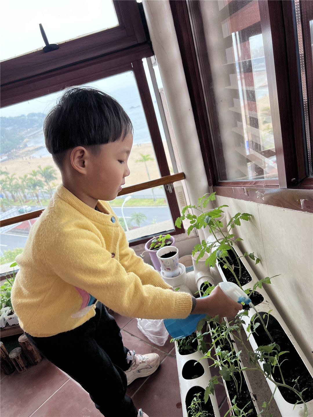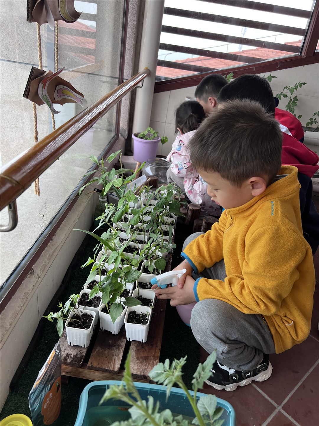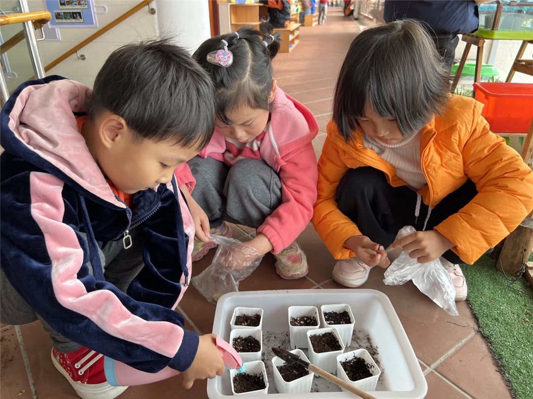 他们在种植盆子里放入一颗颗“希望”的种子,一起想象着:它会开出美丽的向日葵吗?它会长成一颗西红柿吗?真期待它们发芽呀!快看呀!