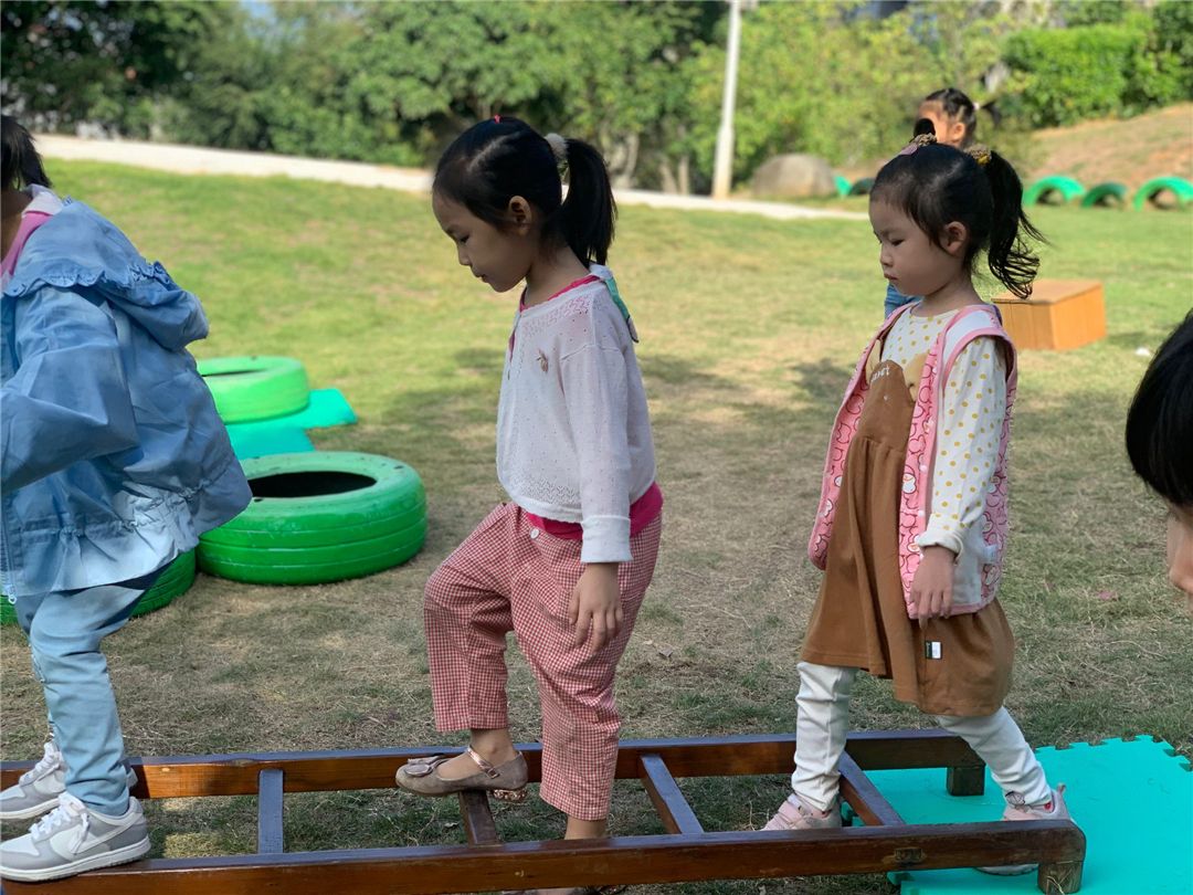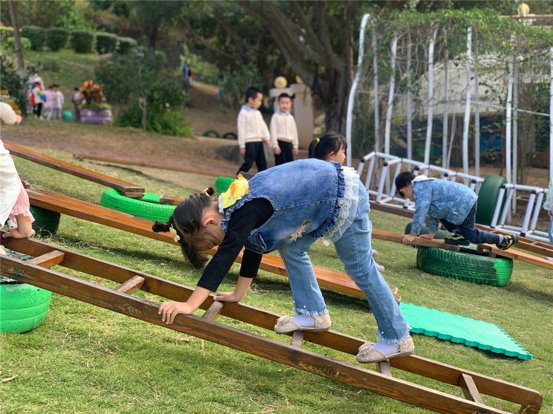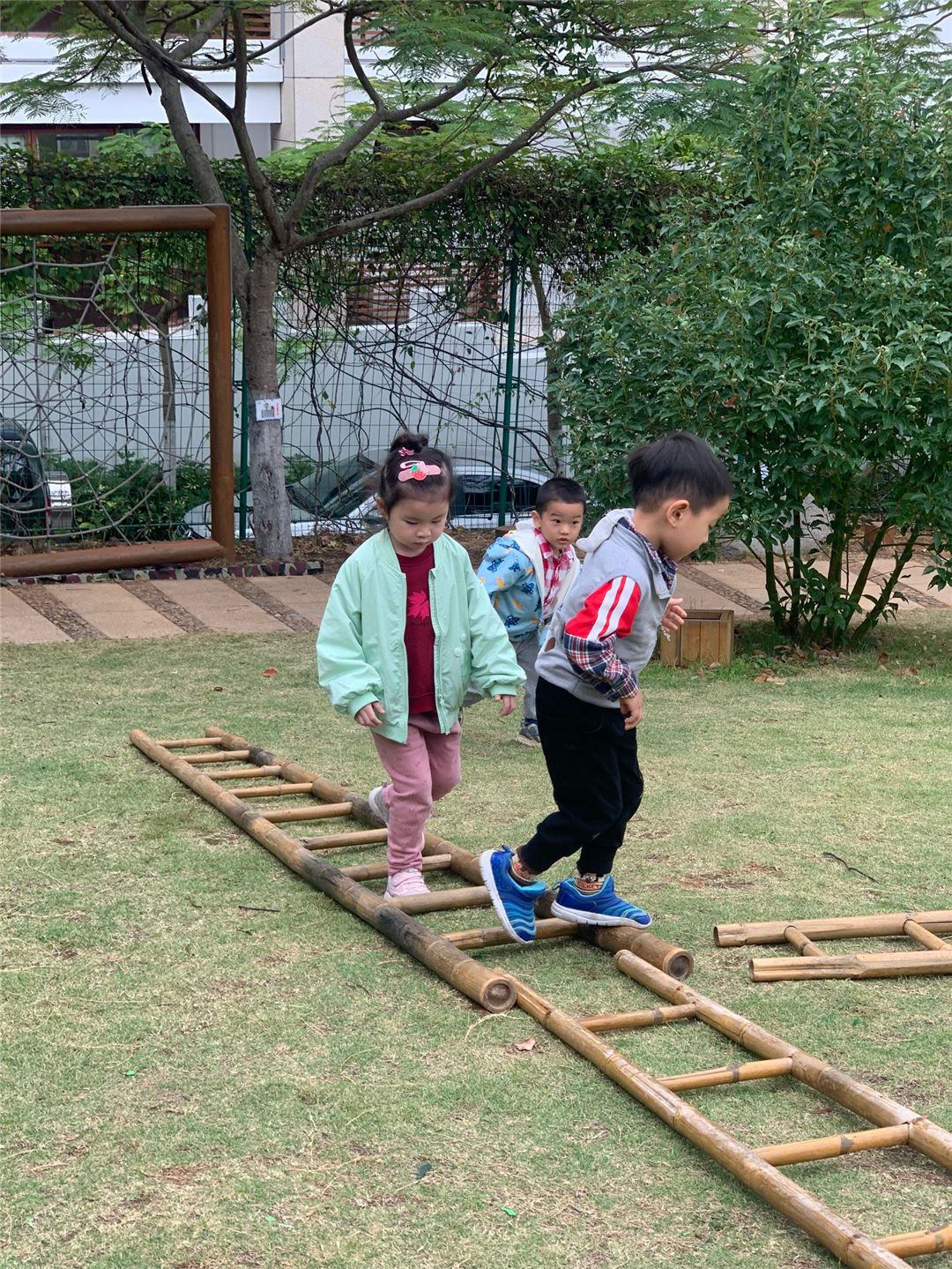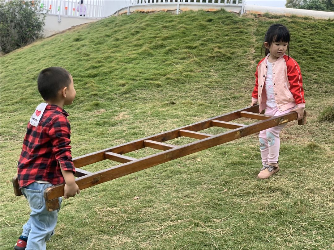 “把很滑的竹梯放在平坦的地方,当做我们的迷宫 ,就可以开始探险啦!”