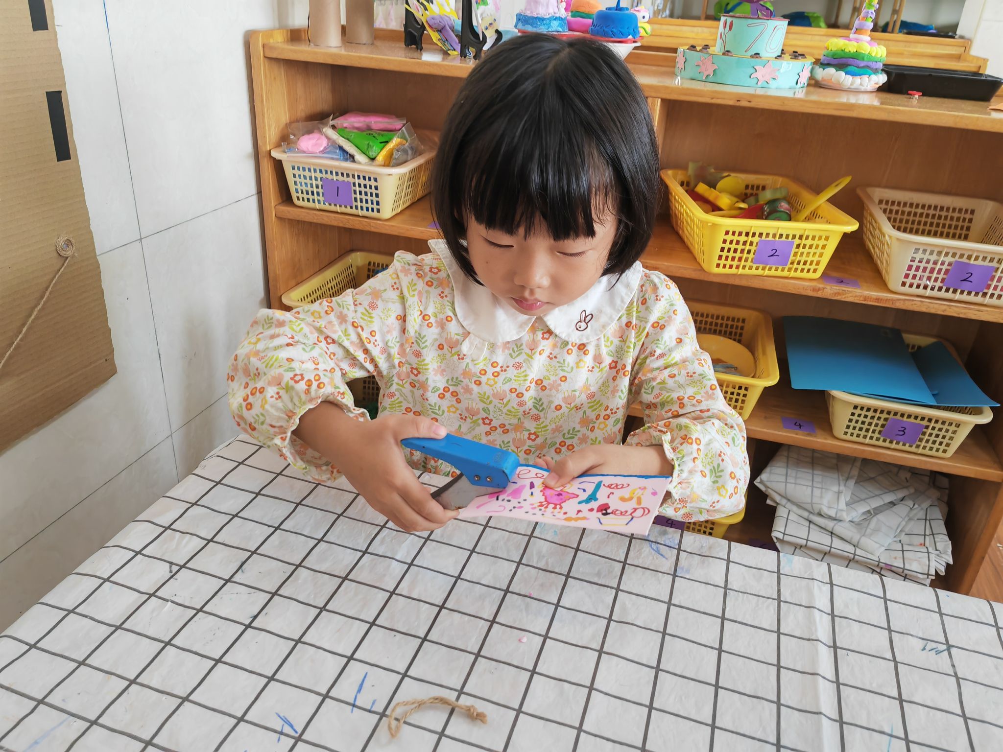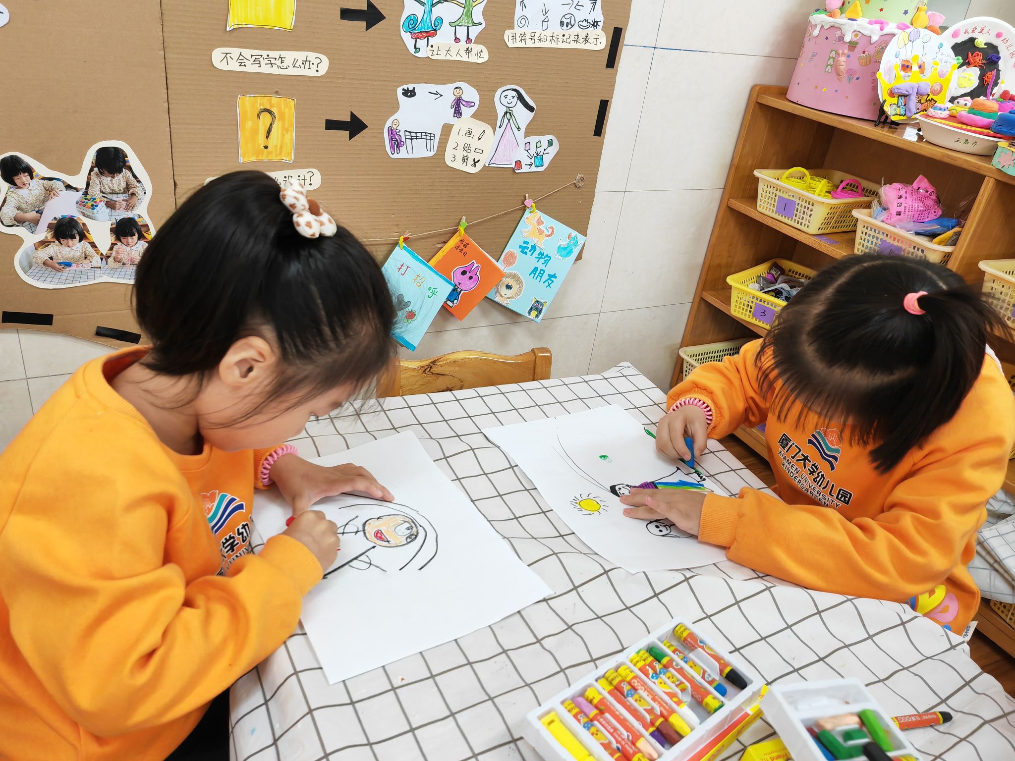 美工区的小朋友们正在绘画和做手工呢。