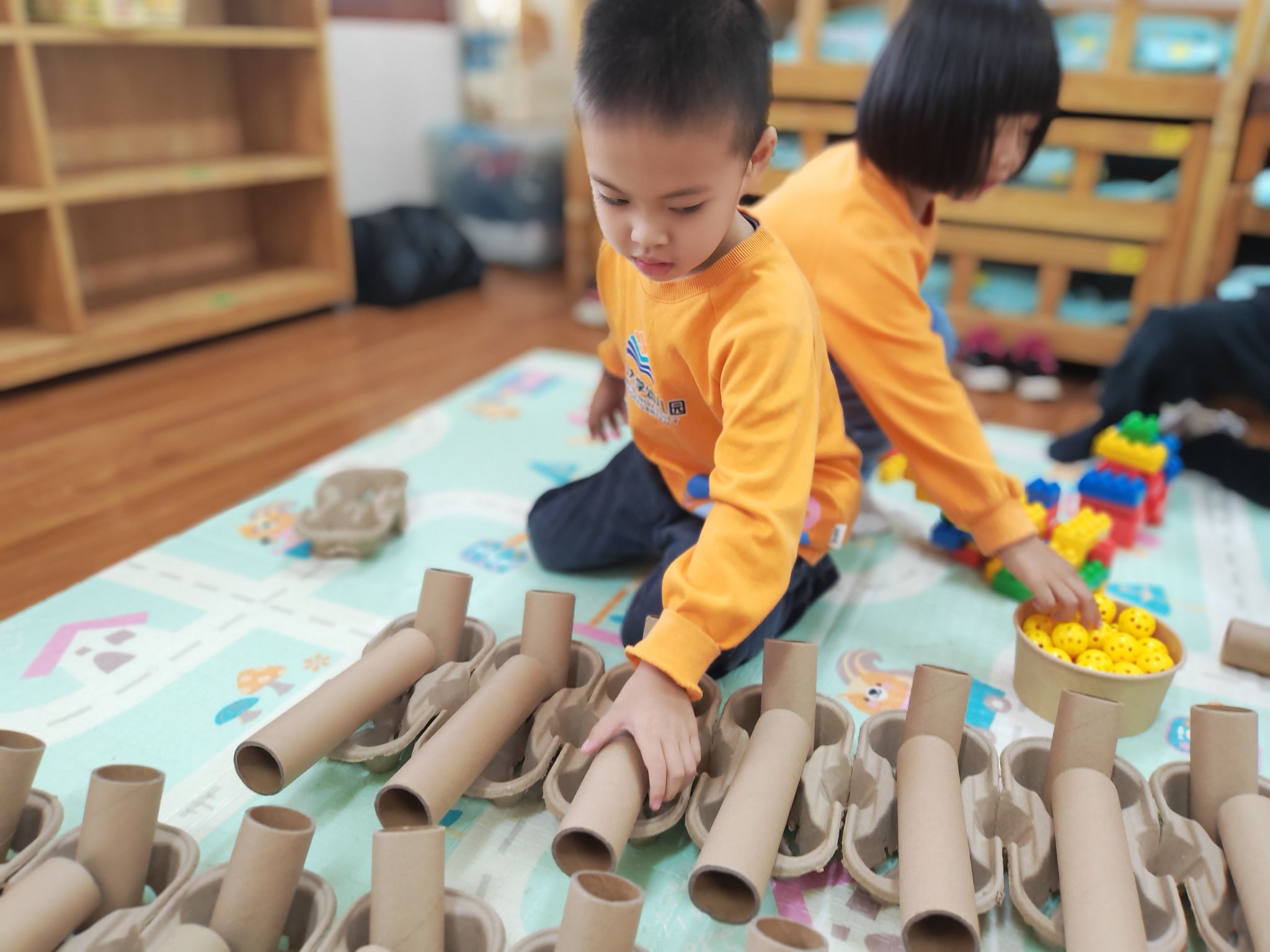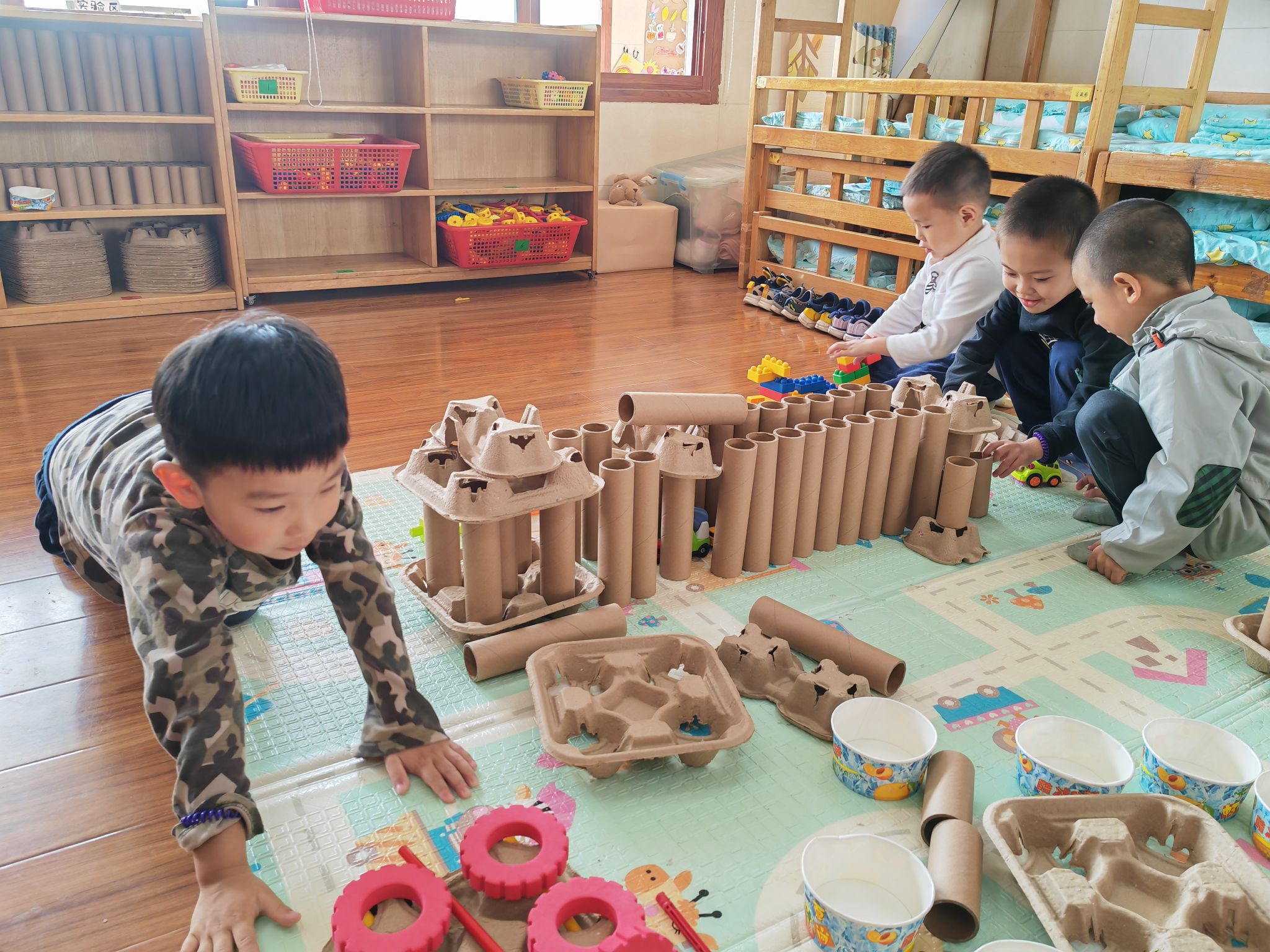 快来看看建构区里面有什么好玩的!我们的建构区投放了各种积木,还有纸芯筒、纸杯等材料。小小工程师来到了建构区,一会就建起了乐园。