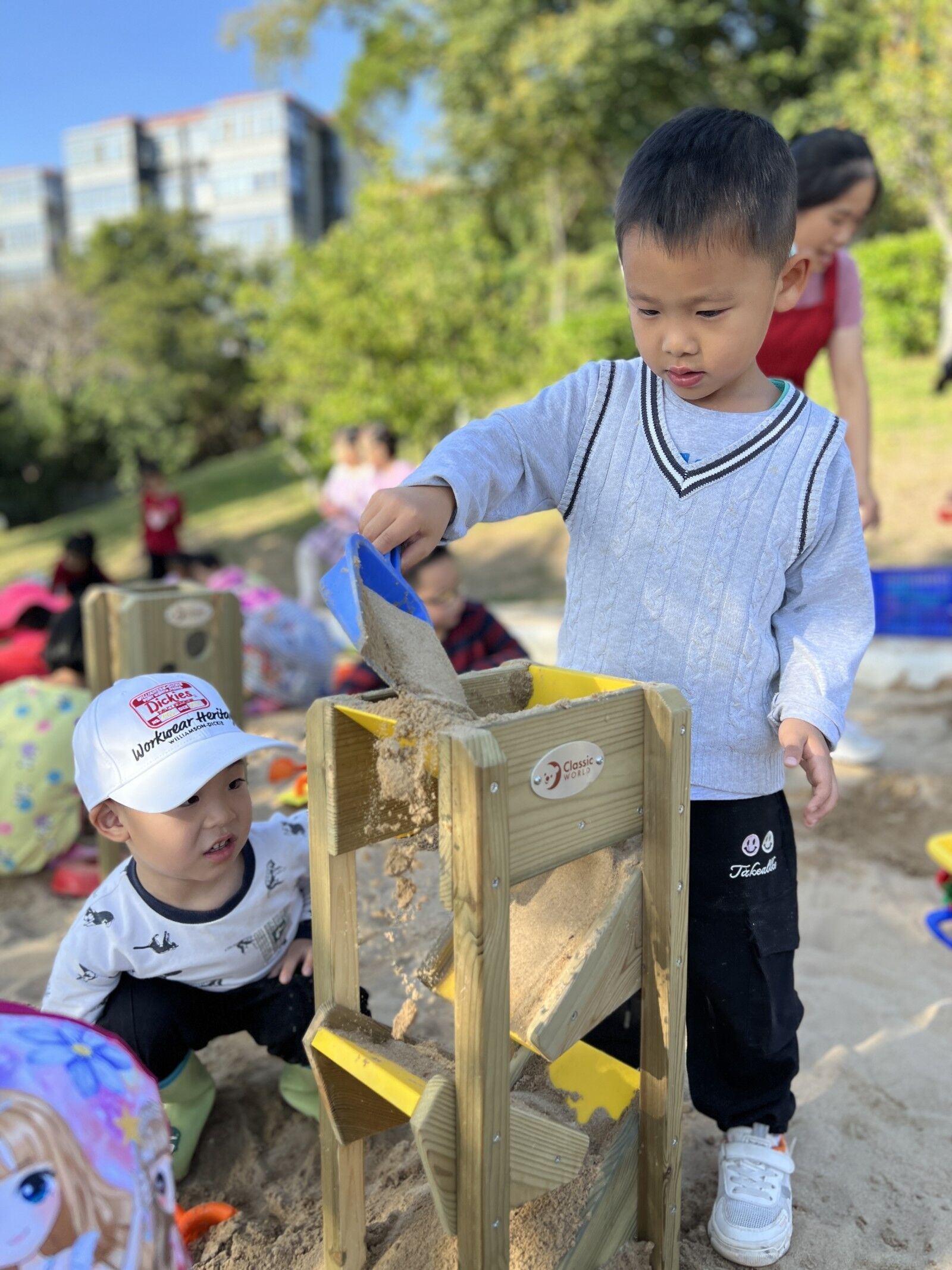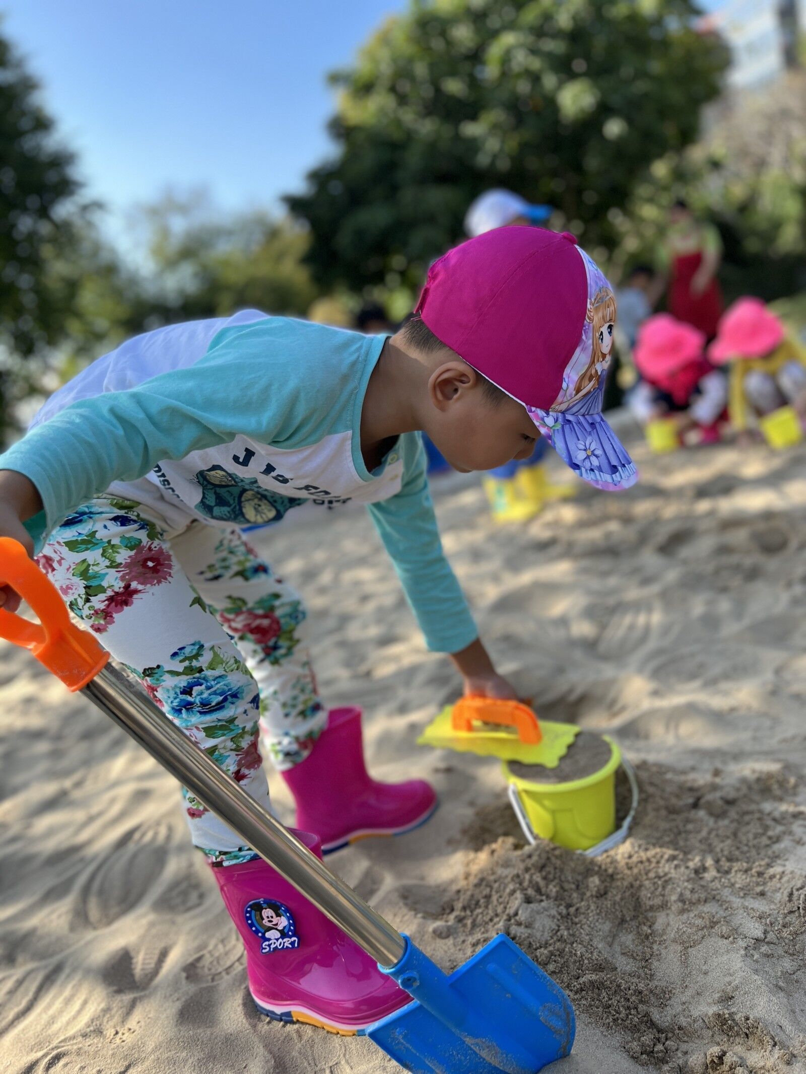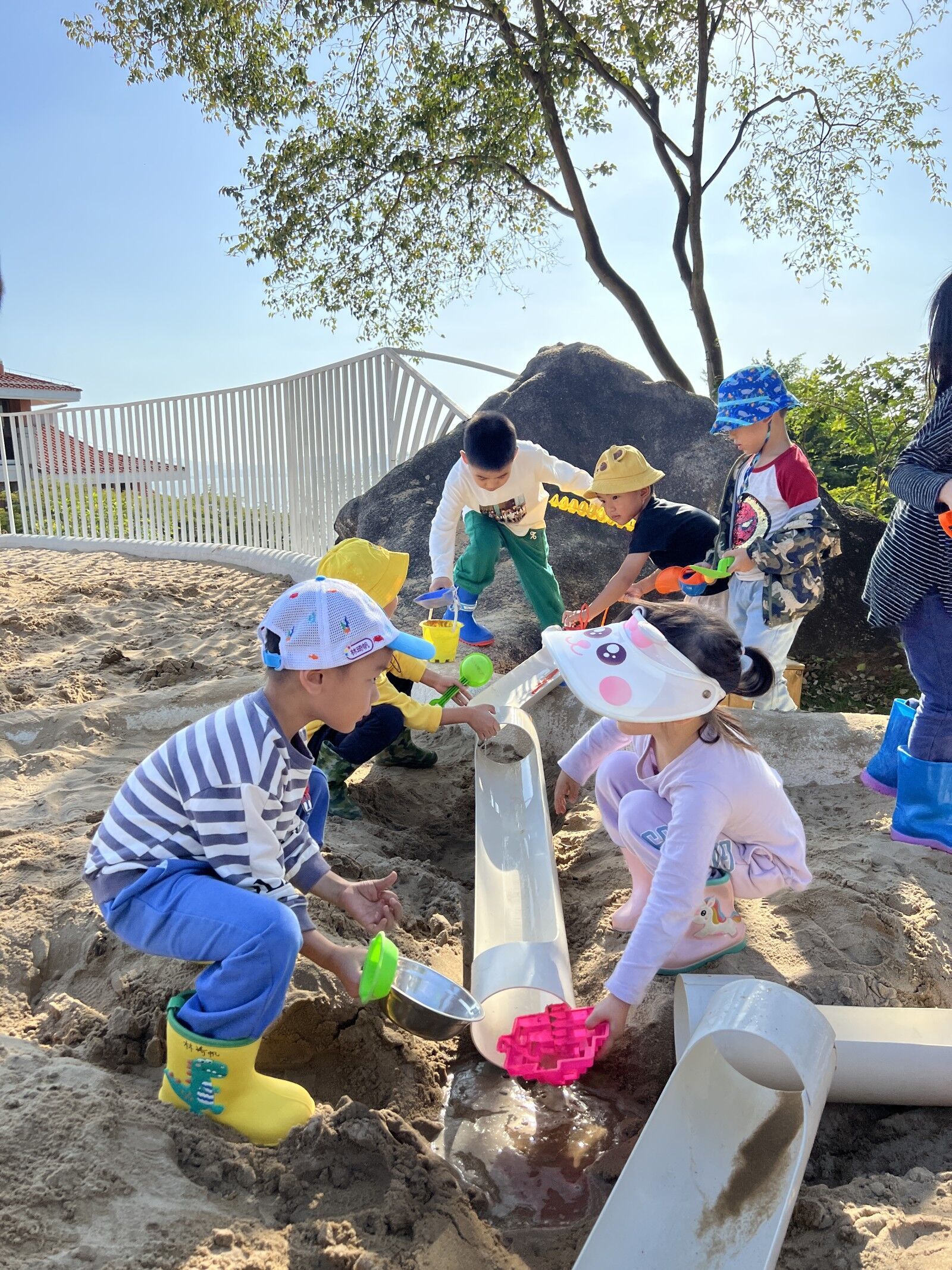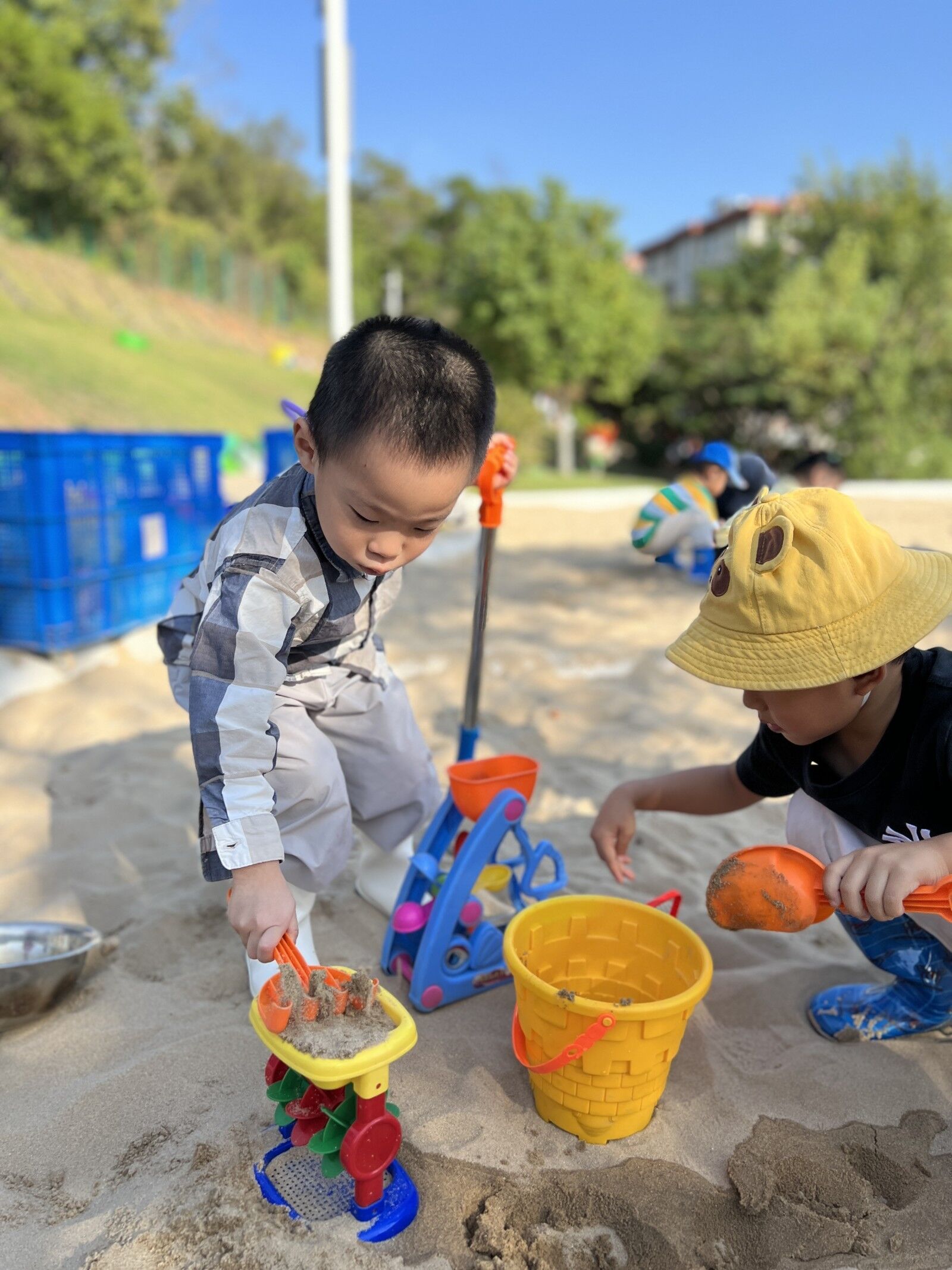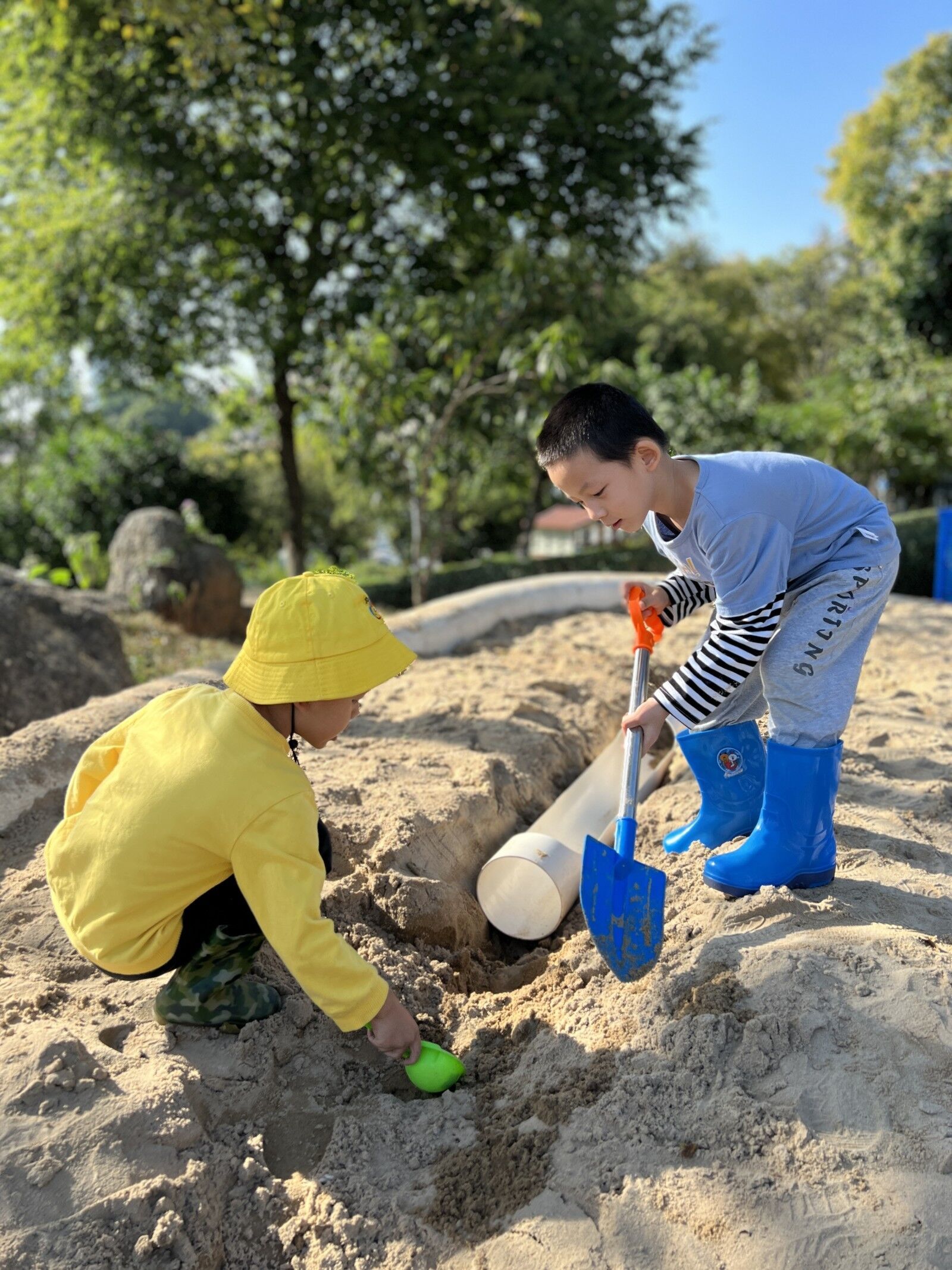 “玩沙”是极受孩子们喜欢的一项游戏。瞧,孩子们穿上雨鞋,带上丰富的工具来到了沙池。三个一群、两个一伙地,有的用铲子挖沙、有的把沙拍平、有的在建桥、有的挖隧道……津津有味地建构着自己的乐园。
