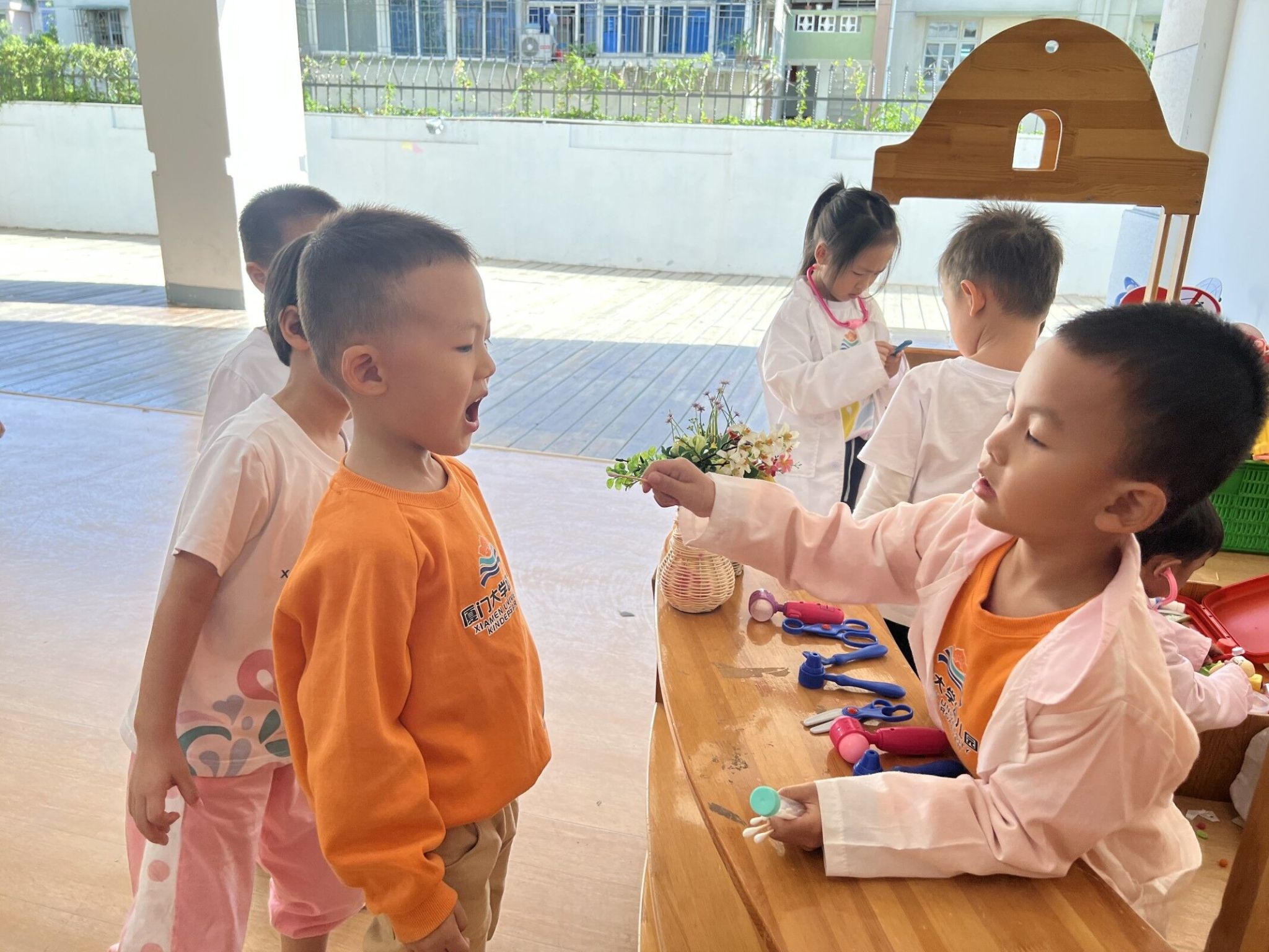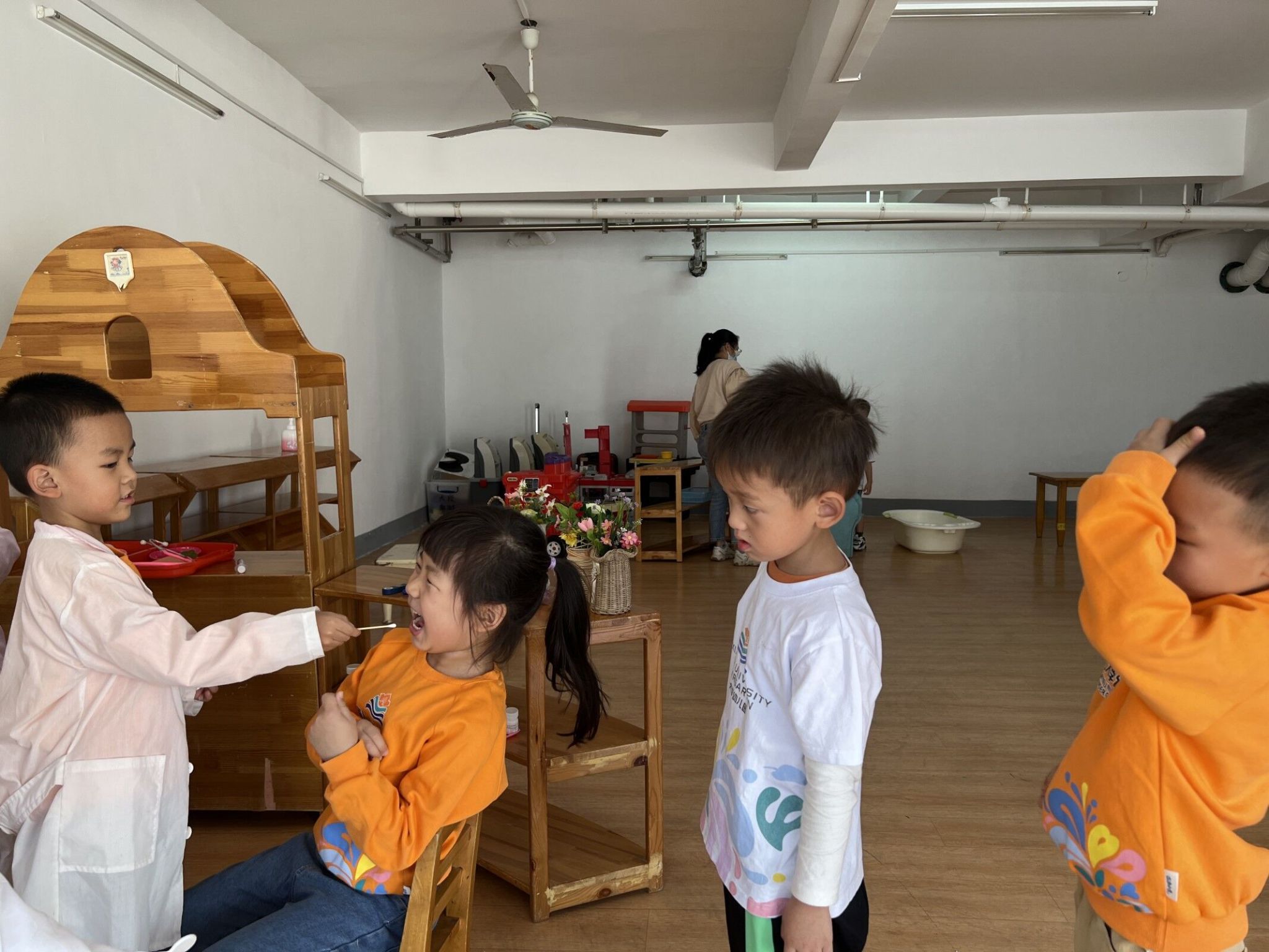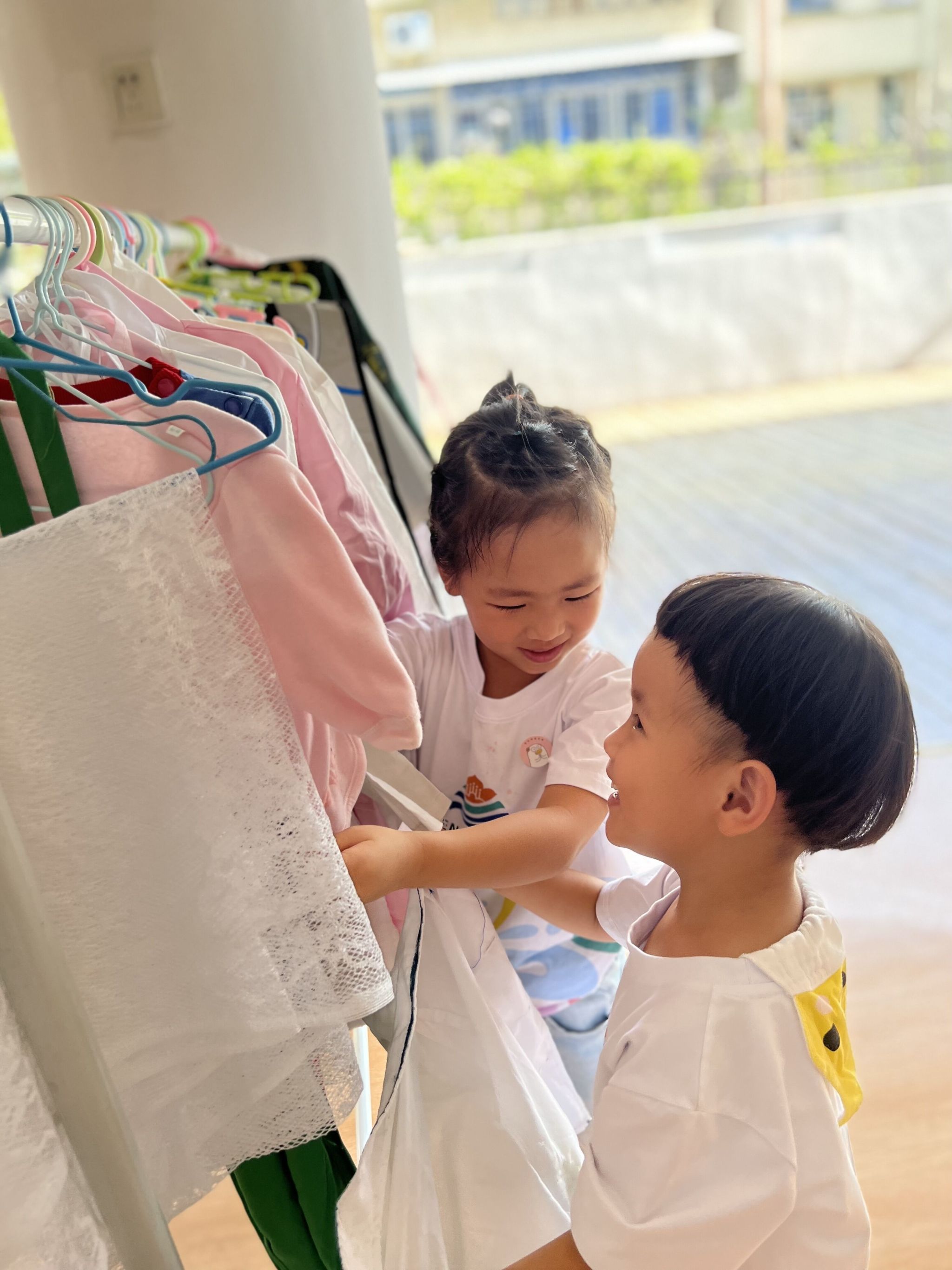 孩子们在角色游戏中,模拟扮演生活中的各种角色,共同布置场地,在合作游戏中体验快乐。