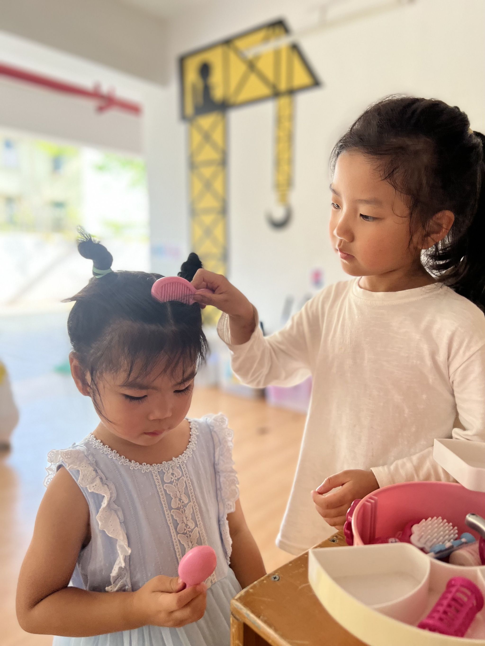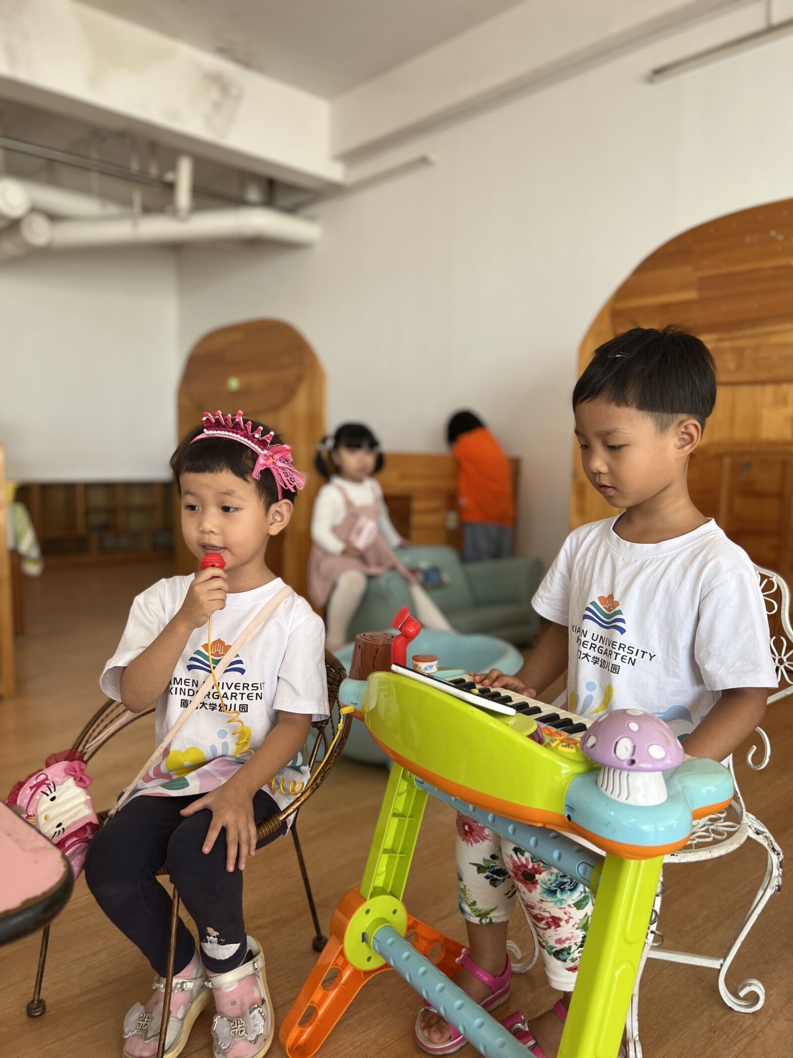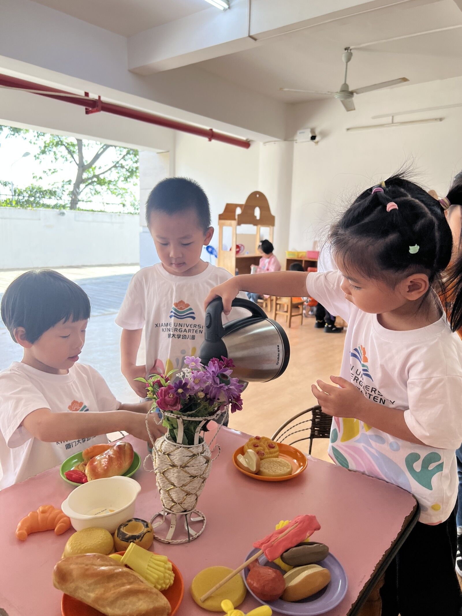 孩子们在角色游戏中,模拟扮演生活中的各种角色,共同布置场地,在合作游戏中体验快乐。