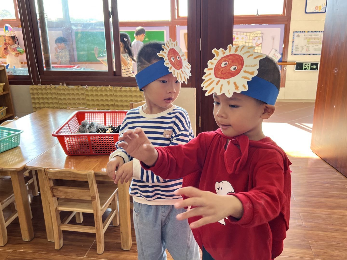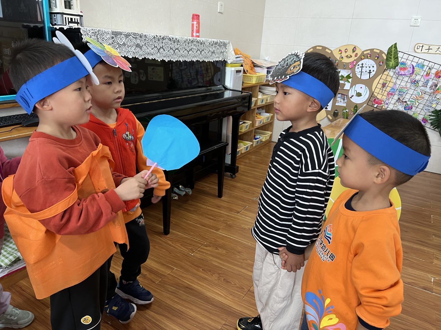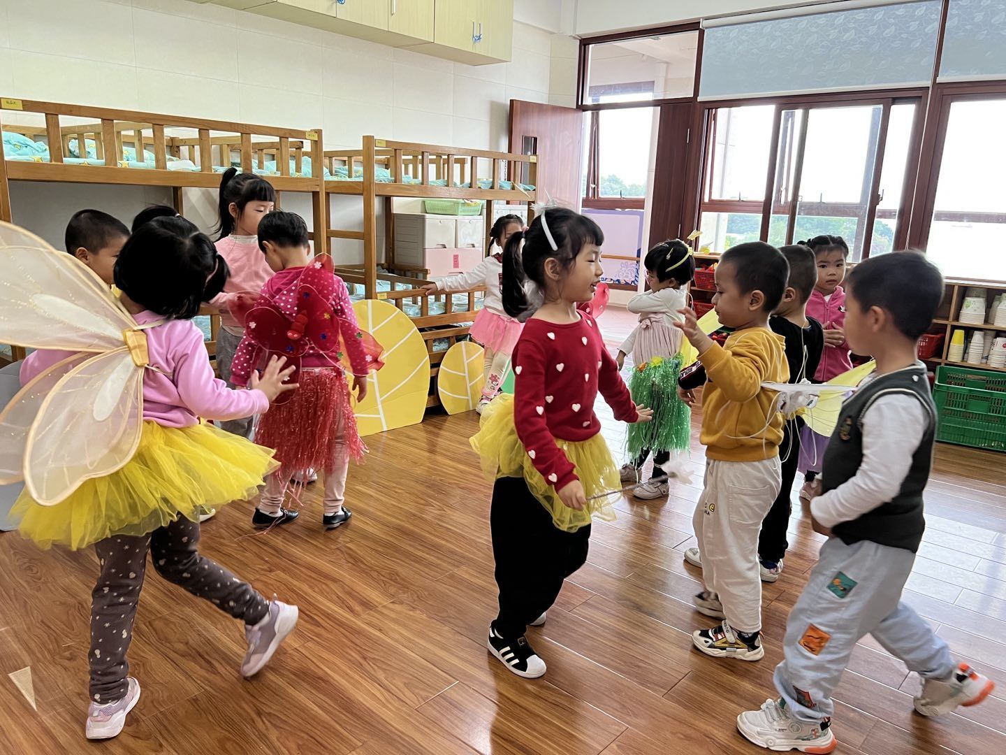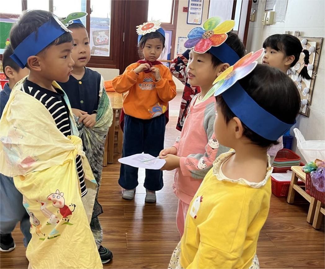 “我要扮演红蝴蝶。”“我能到黄花下面躲躲雨吗?”……原来,这是孩子们自己布置环境玩表演游戏,用动作和语态表现动物特征,与同伴合作将故事完整表现出来。