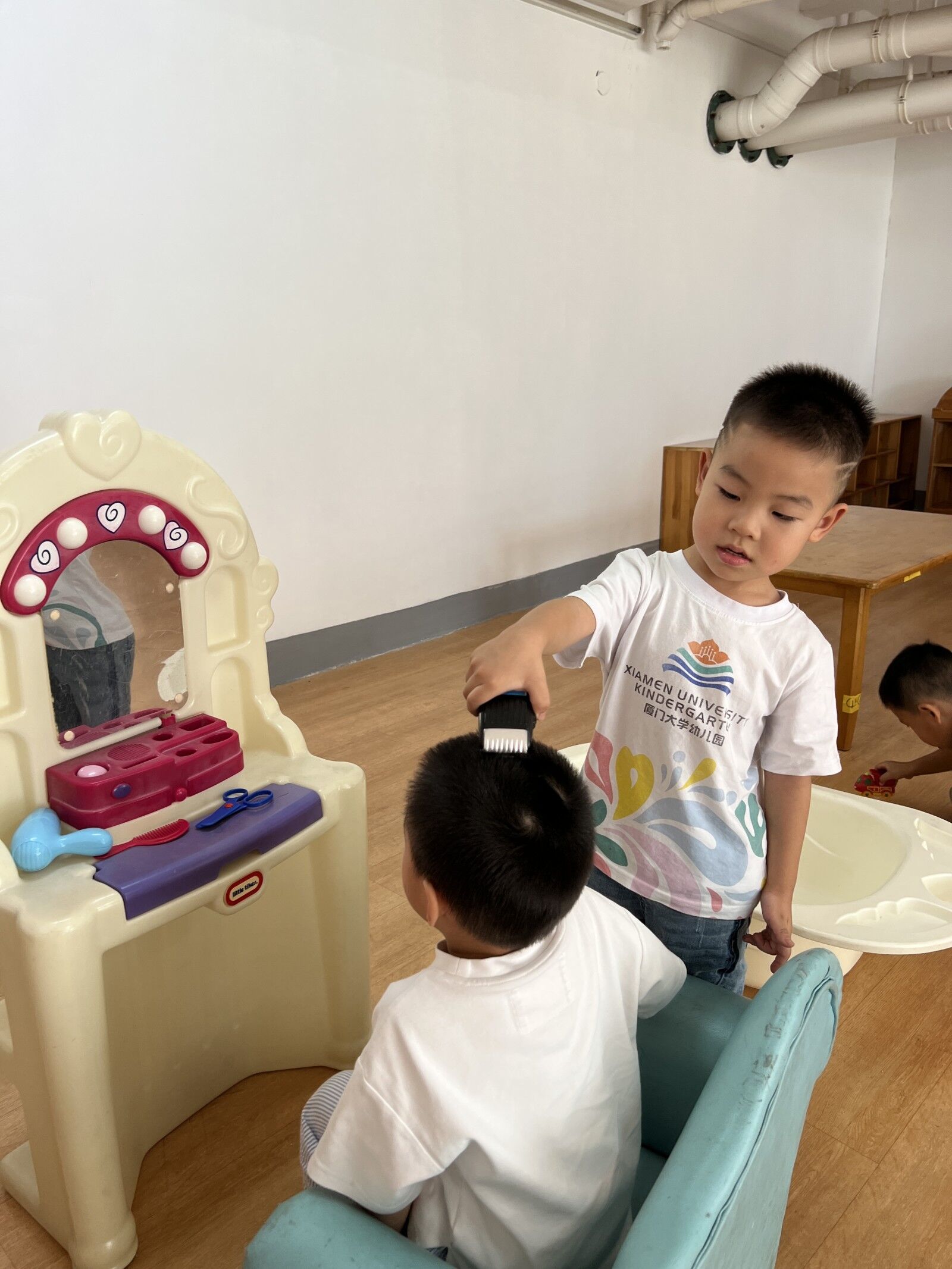 “理发店开业了,快来理发吧!”“照照镜子,今天我漂亮吗?”