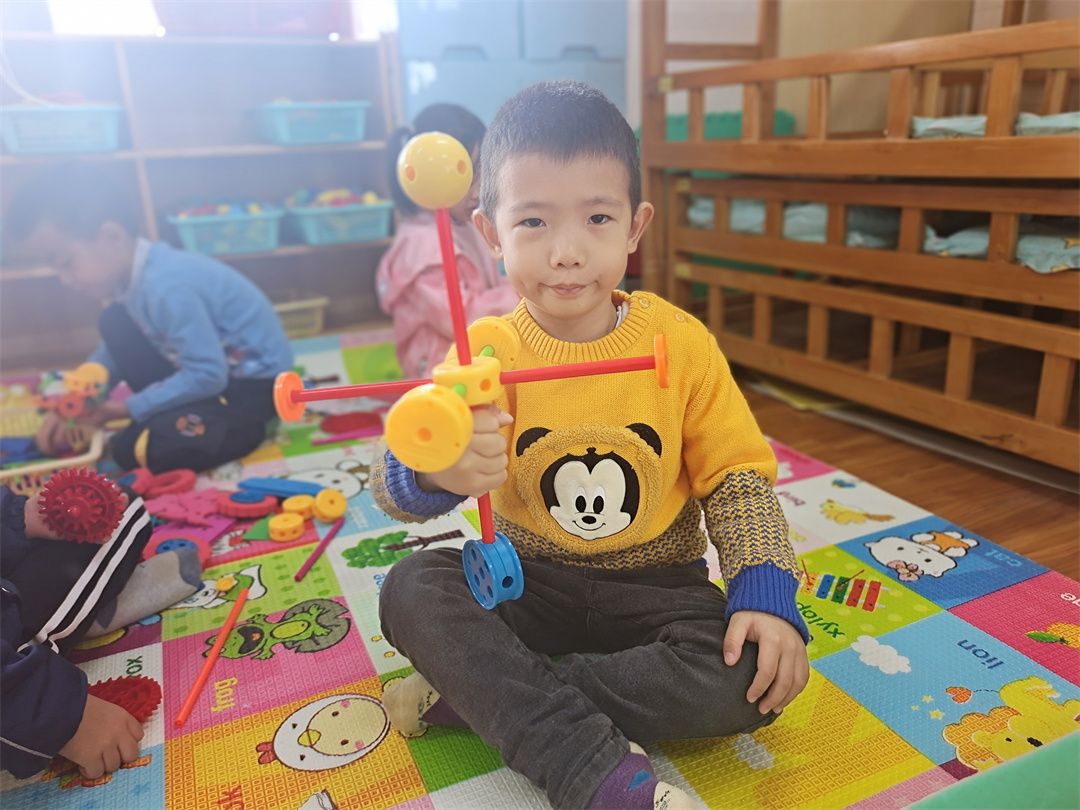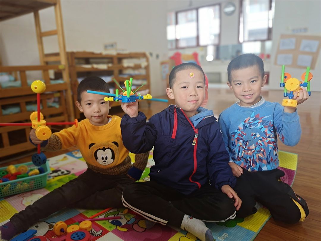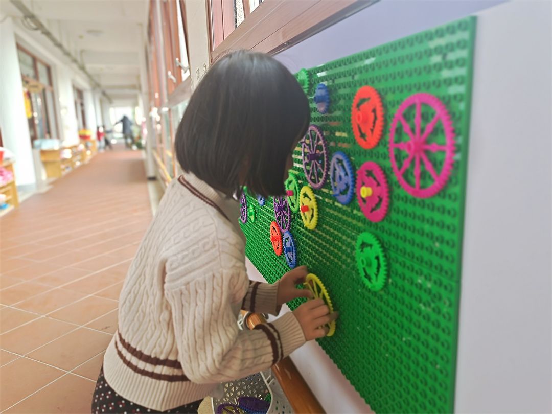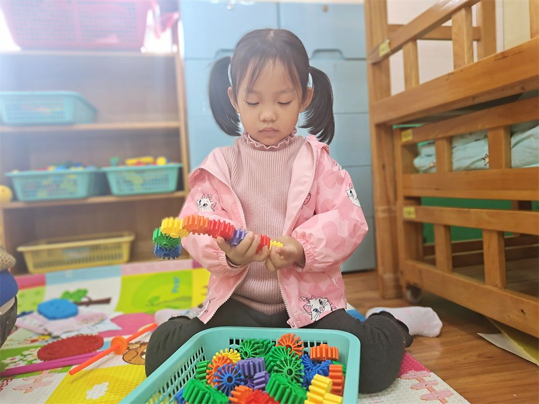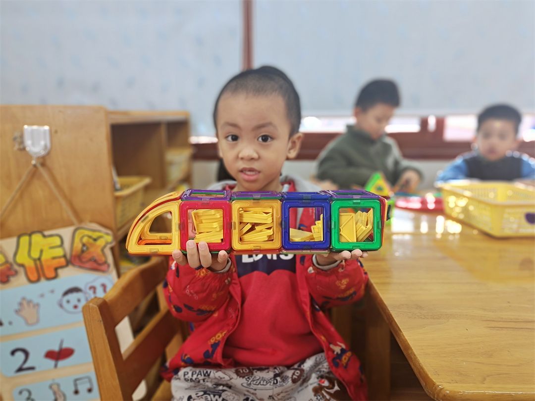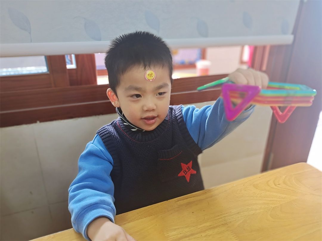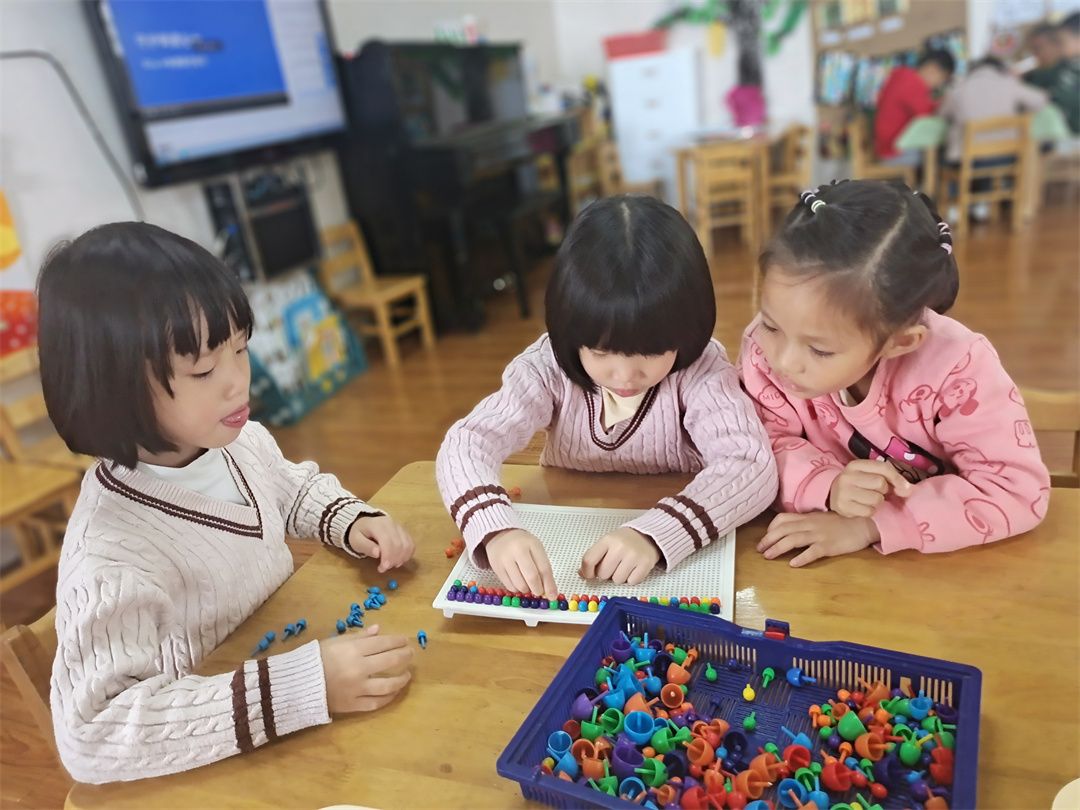 操作区的小朋友有的在摆弄着磁力片,有的正在用蘑菇钉拼出喜欢的图形。