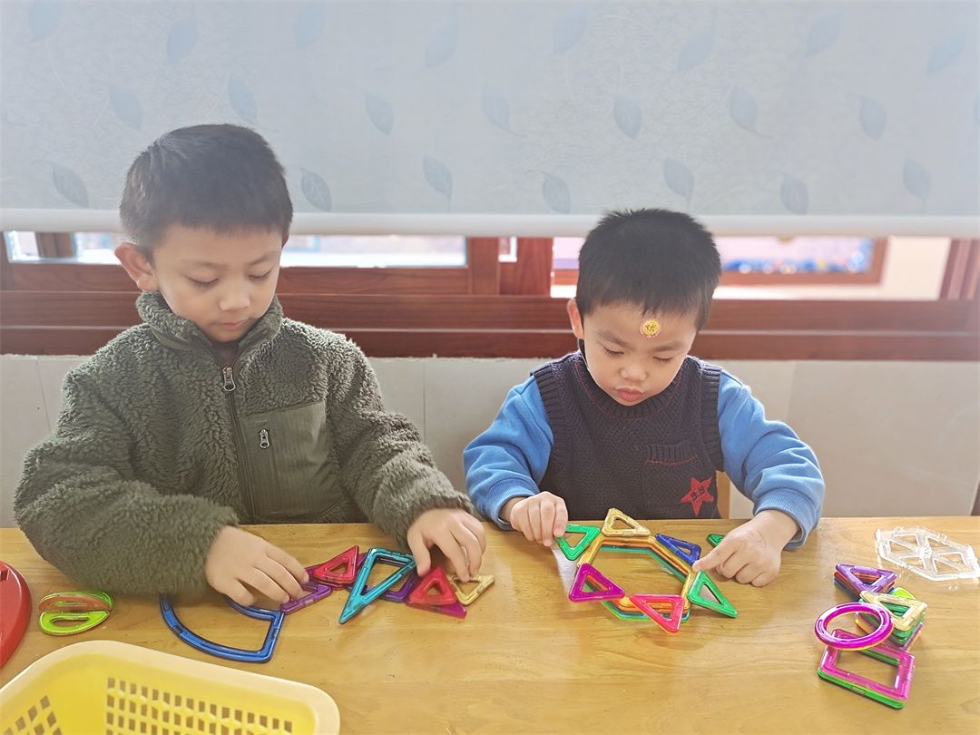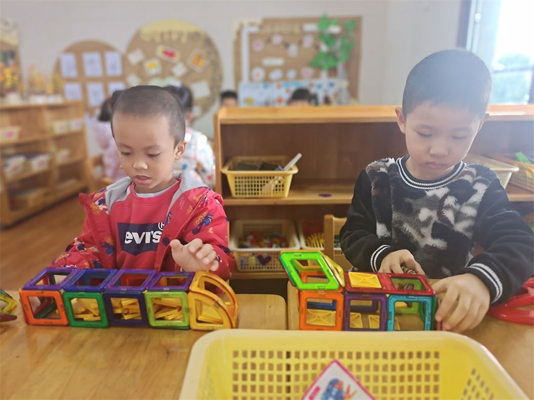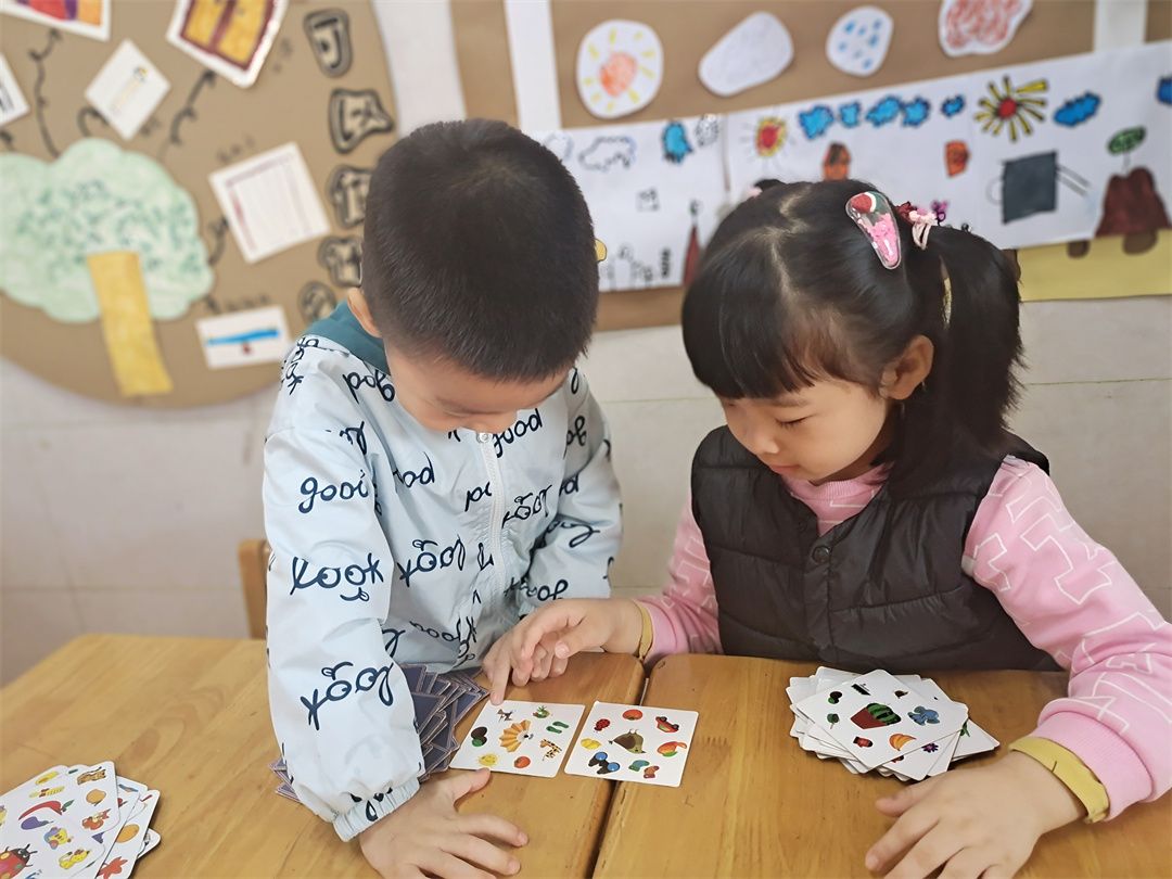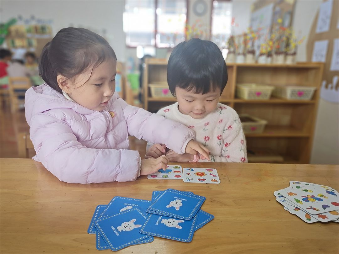 数学区的小朋友正在进行头脑风暴,发挥在即的想象力用七巧板拼出好看的图案,有的小朋友用纸牌在比赛。