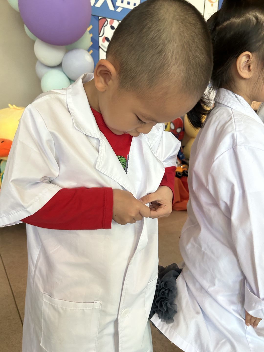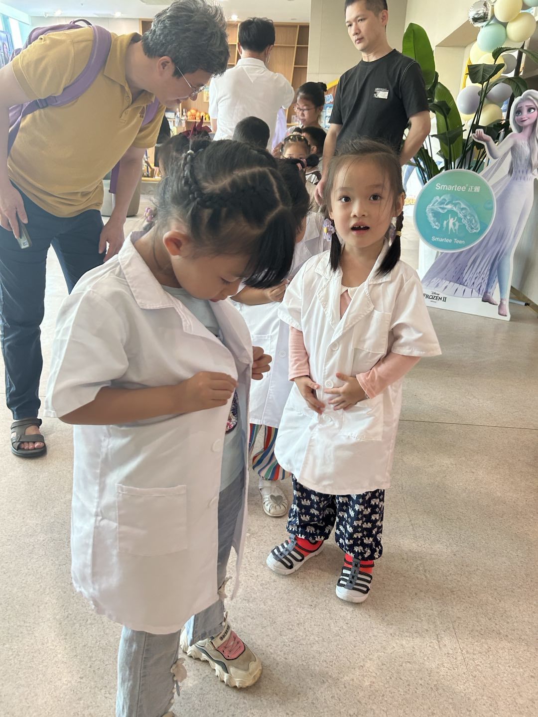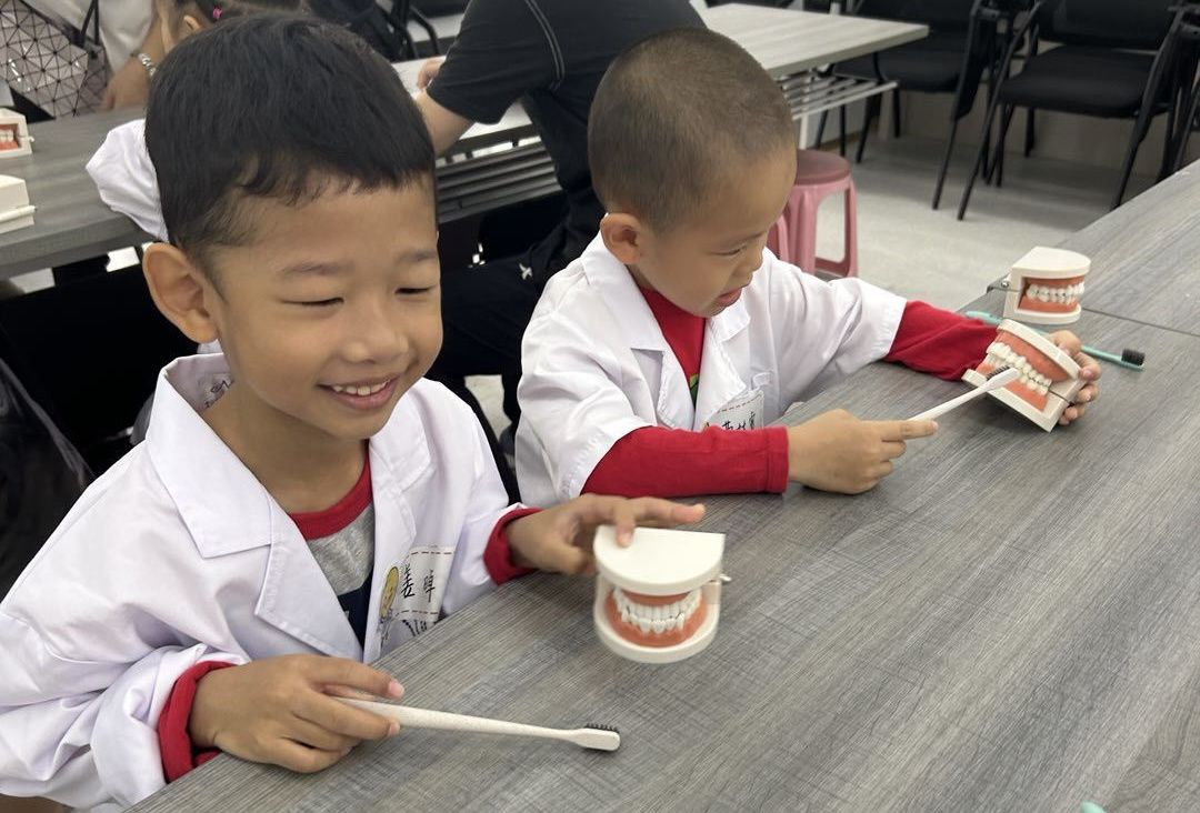 穿戴好小白褂,宝贝们立马变成了小牙医的模样。