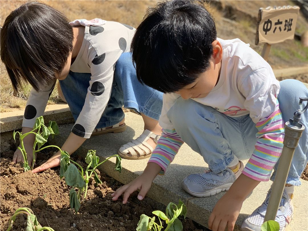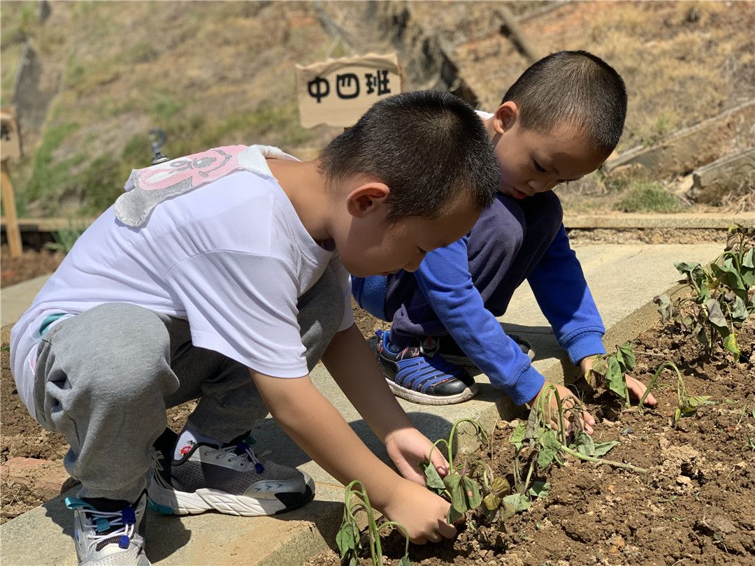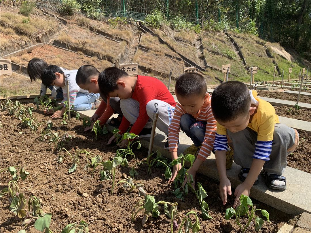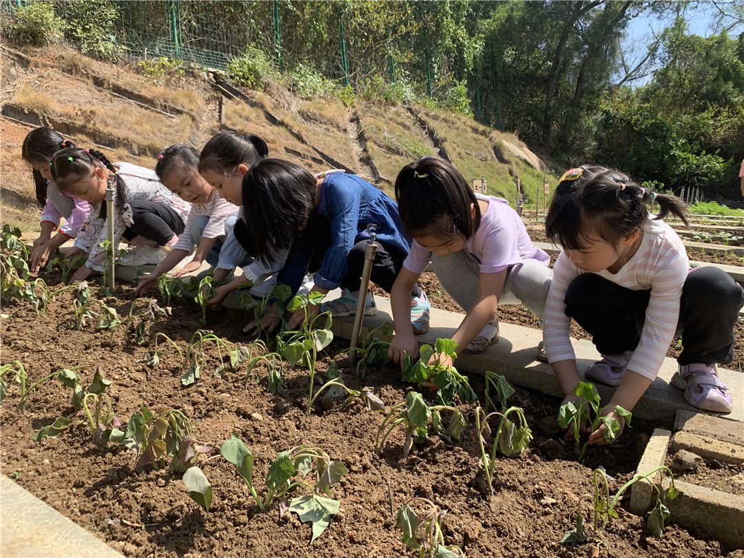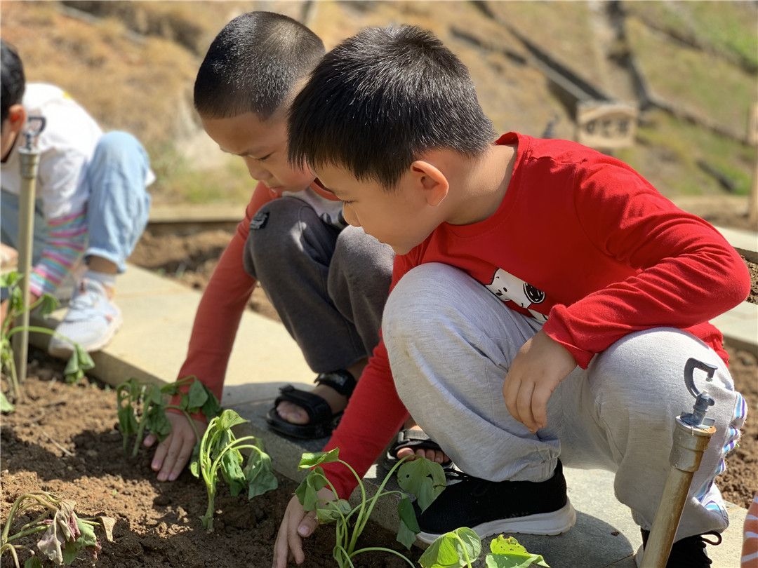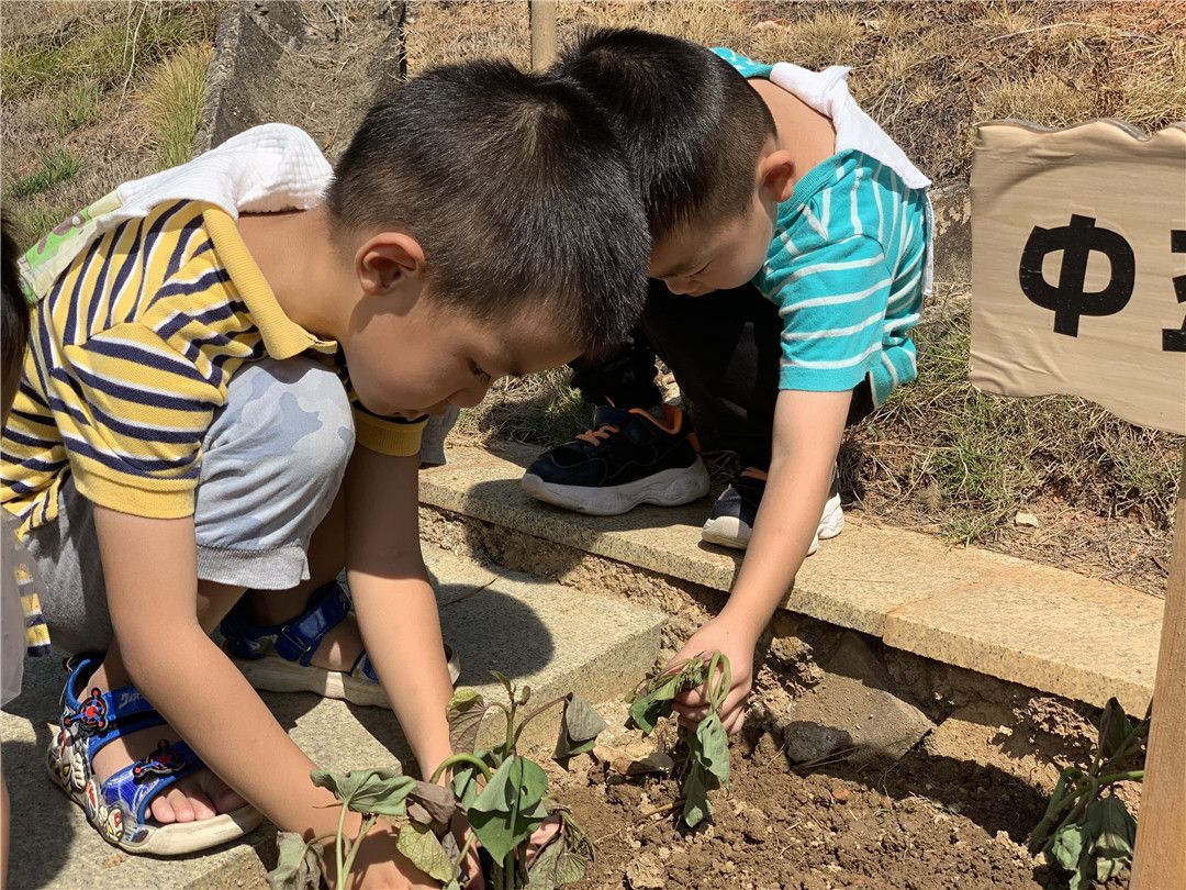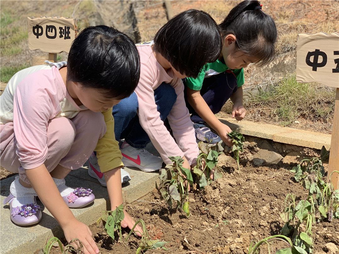我们中五班的山坡上有一块种植区还空着,可以种植什么蔬菜呢?有的孩子说:“奶奶在家种了地瓜叶,可好吃了,我还帮忙浇水施肥了。”有些孩子也跟着说到自己家里也种了一些地瓜,叶子不能吃,但它会在地底下长出香甜可口的地瓜,还有的小朋友说地瓜是能补充能量的蔬菜,吃了会长高身体更棒。那我们一起种两种地瓜,一起观察它们怎么样?孩子们纷纷表示同意。于是,我们班开启了一场地瓜种植之旅。