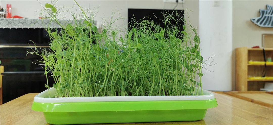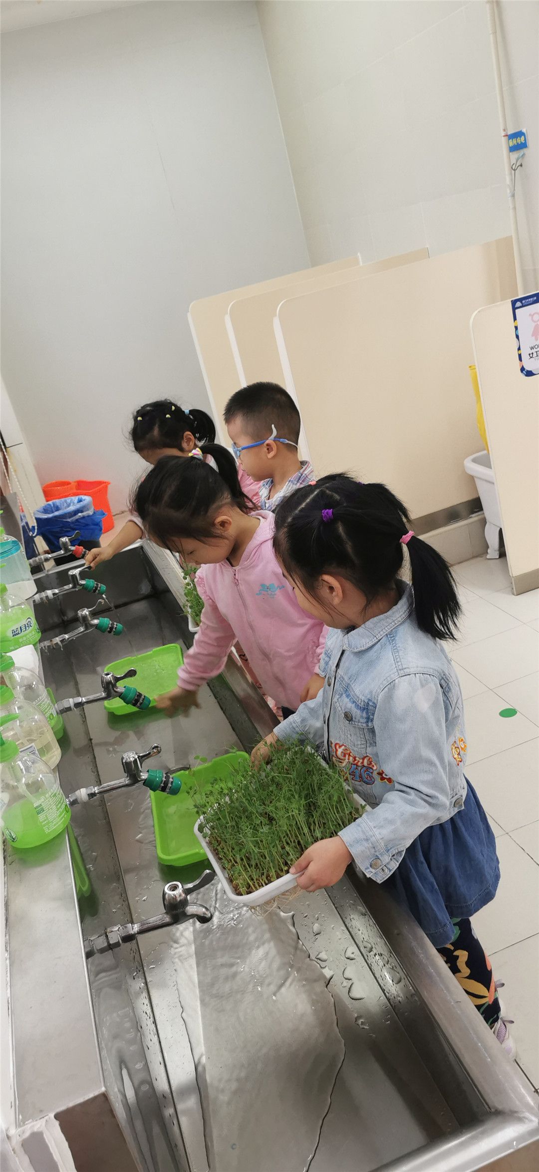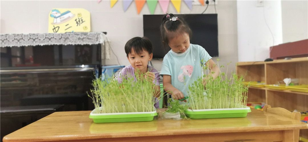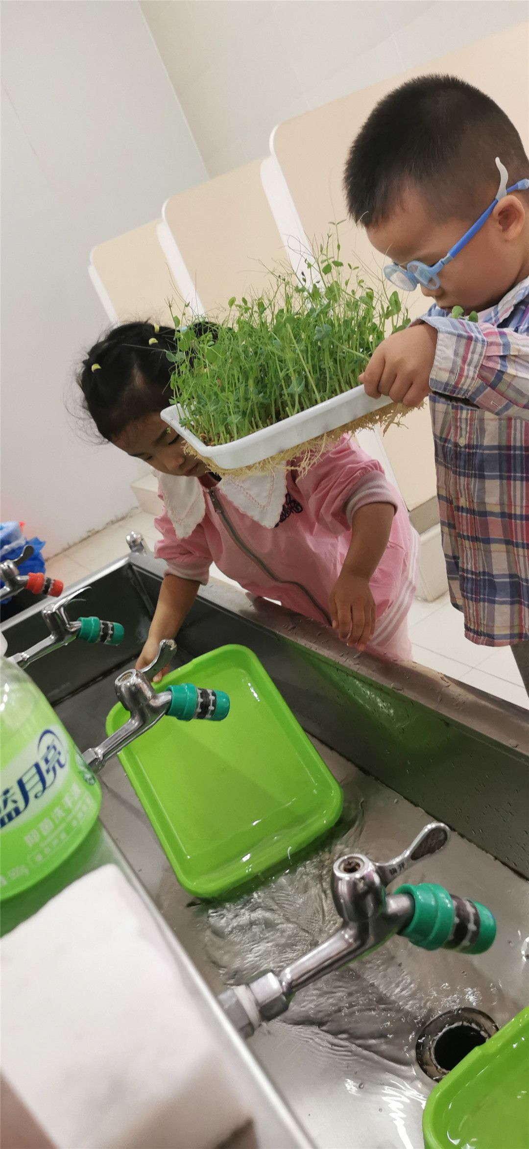 你瞧,宝贝们用育苗盘种下了黄豆,刚刚播种的头几天要先盖上一层育苗纸,在纸上喷上水,让种子保持湿润,等待小种子的发芽。每天清晨来园,宝贝们都会先到种植角看看豆芽有没有又长高了,给它们换换水……经过宝贝们的细心照顾,黄豆冒出了小豆芽,小种子发芽了,长出了绿色的小叶子……成了植物角里一片靓丽的“春意”。在收割时刻,宝贝们洋溢快乐的笑容,小心翼翼地收获嫩绿的豆芽。