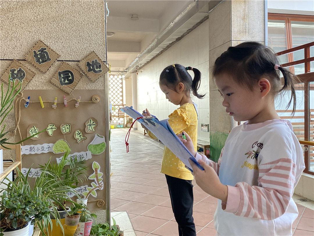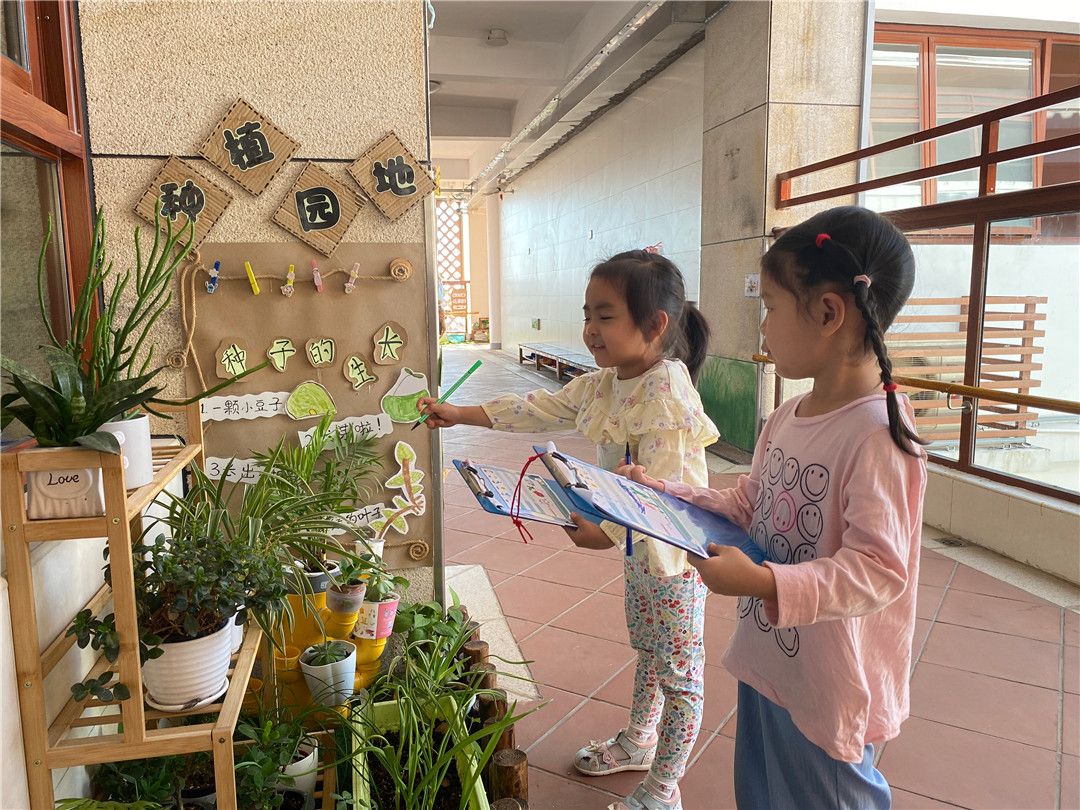 “你们看,这些是喜欢阳光的植物,这些是不喜欢阳光的植物。”“看,我发现种在土壤中的种子发芽了……”“老师,它们为什么会朝着这些小洞里钻出来呢?”……瞧,宝贝们是那么专注,那么好奇!在老师的带领下宝贝们每天细心地照顾着它们,并用简单的图画记录植物的生长过程。一个小小的植物角成了一道生机勃勃的风景线,同时也让宝贝们在小角落里发现了大自然的奥秘,成了宝贝们亲近自然的开始。