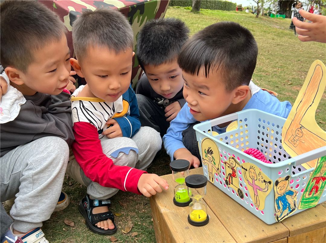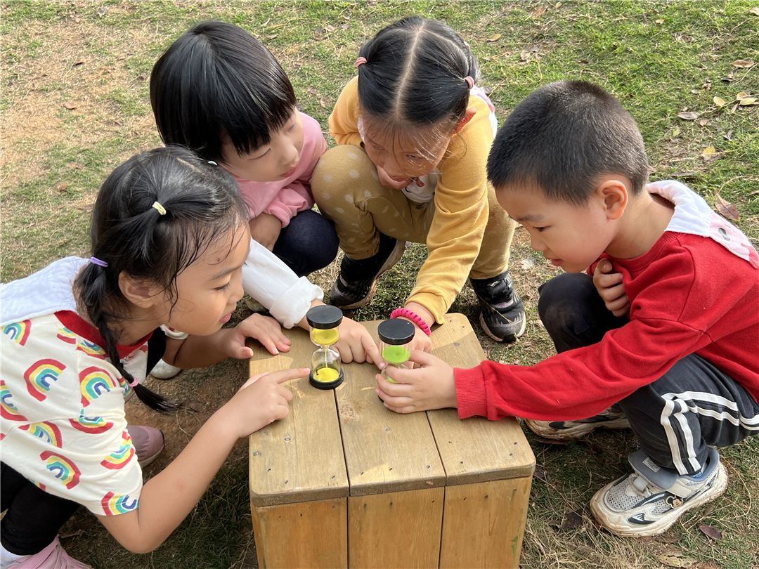 滑草板、彩虹滑溜布、木板、垫子、纸箱、泡沫板等,小朋友们选择不同材料,自己创设游戏,用沙漏计时可有趣啦!
