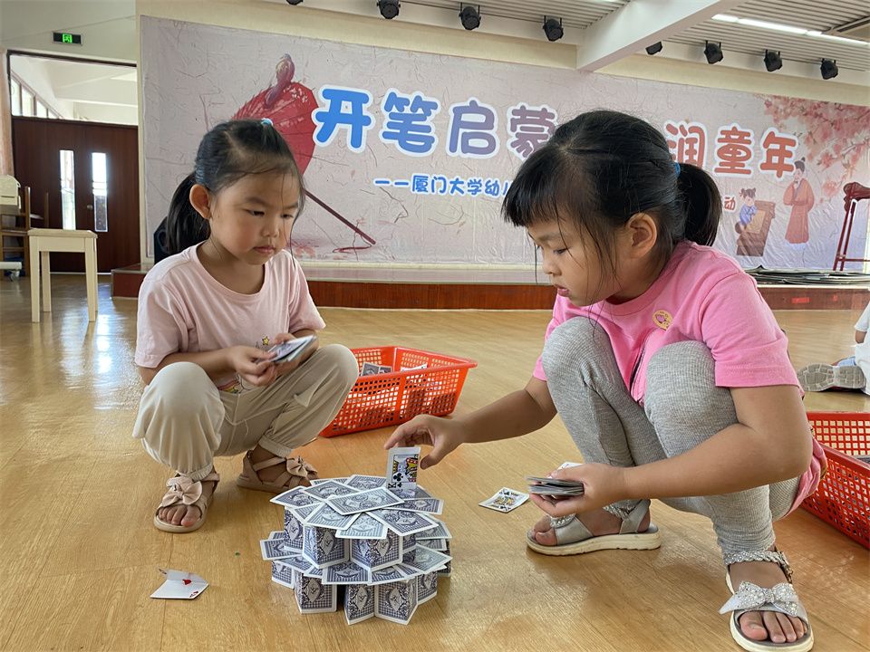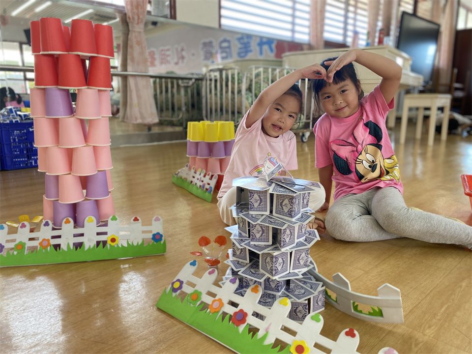 建构开始啦!我们用的是扑克牌和纸杯还有的是各色的纸砖噢。