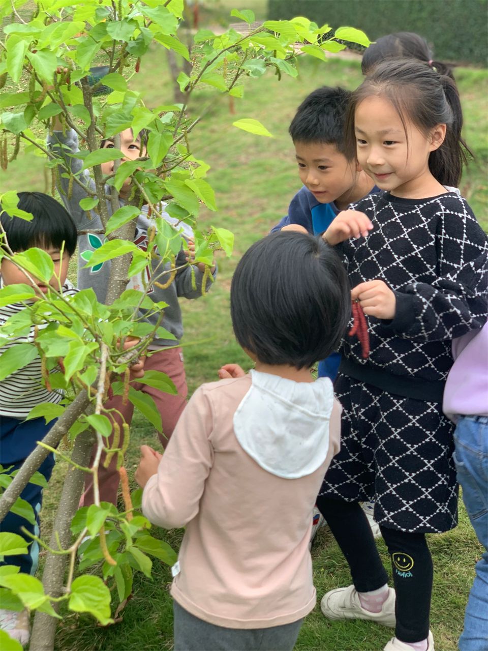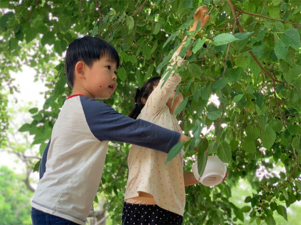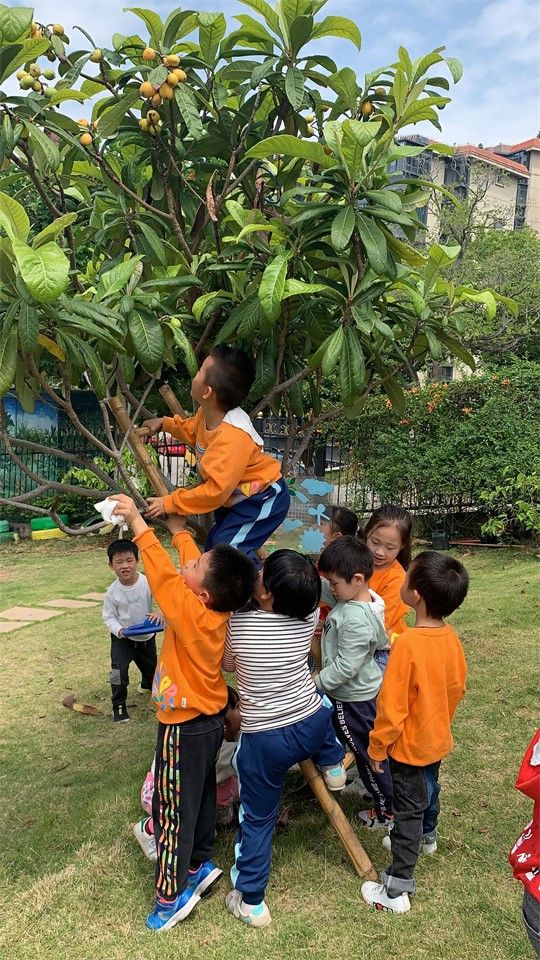 在一次户外活动中,中七班的小朋友意外的发现小山坡的桑葚和枇杷成熟啦!要怎么才能吃到美味的桑葚和枇杷呢?矮的可以直接摘到,那高高的树要怎么办呢?小朋友们开动脑筋想到了好办法!找来了户外活动的小梯子,在确保安全稳固的情况下,大家齐心协力把成熟的果子摘下啦!自己采摘的果然好吃,嘻嘻!