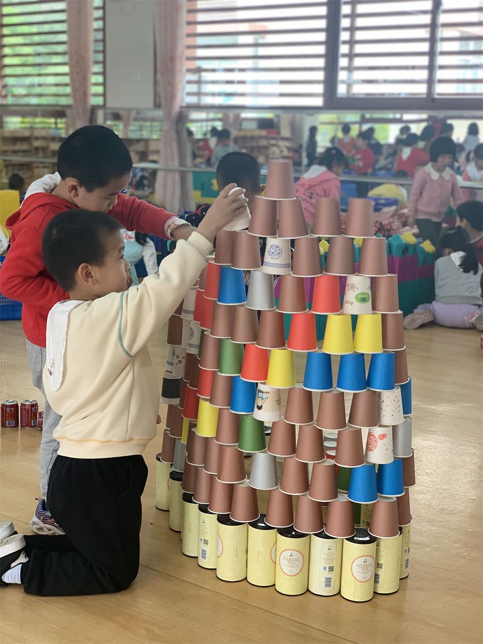 中七班的小朋友还是建构小能手,他们经过协商分工和多次的尝试。用各种积木、大花片、茶叶罐和纸杯合作搭建了芙蓉湖和勤业餐厅,美丽的厦大校园终于完工啦!