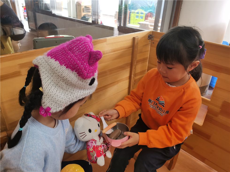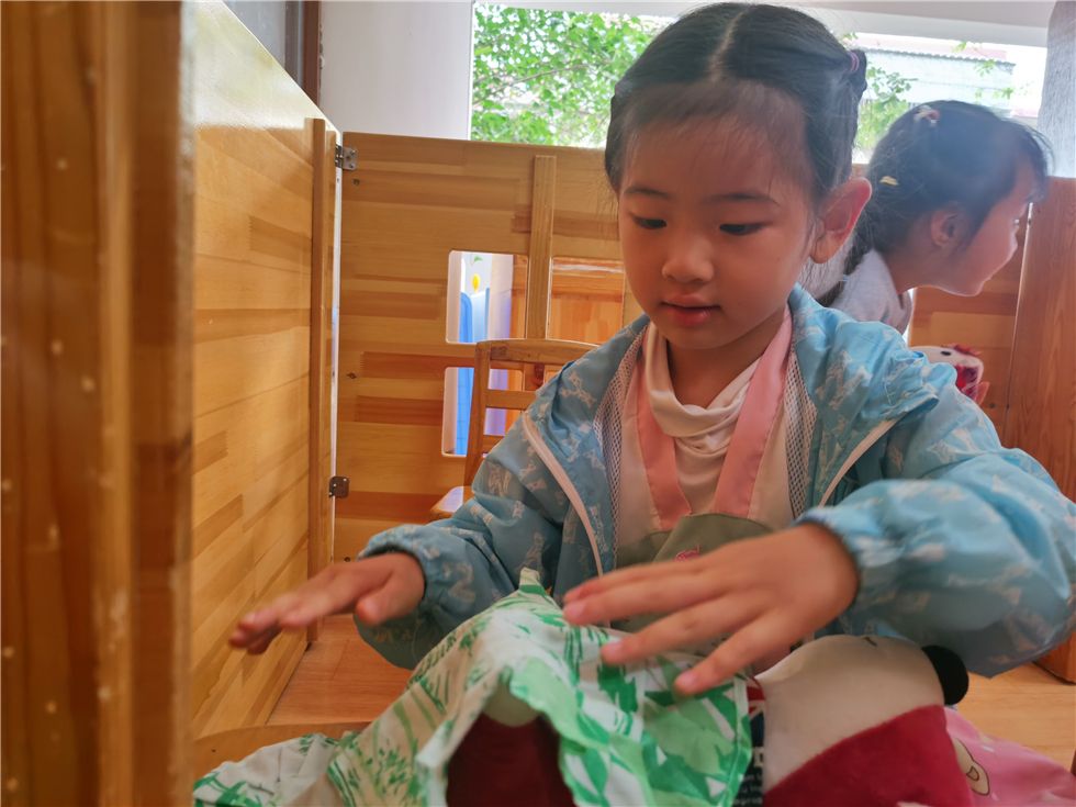 “我来当妈妈喂宝宝。”“我来当姐姐,帮宝宝盖被子。”“我们一起带宝宝去超市吧。”……
