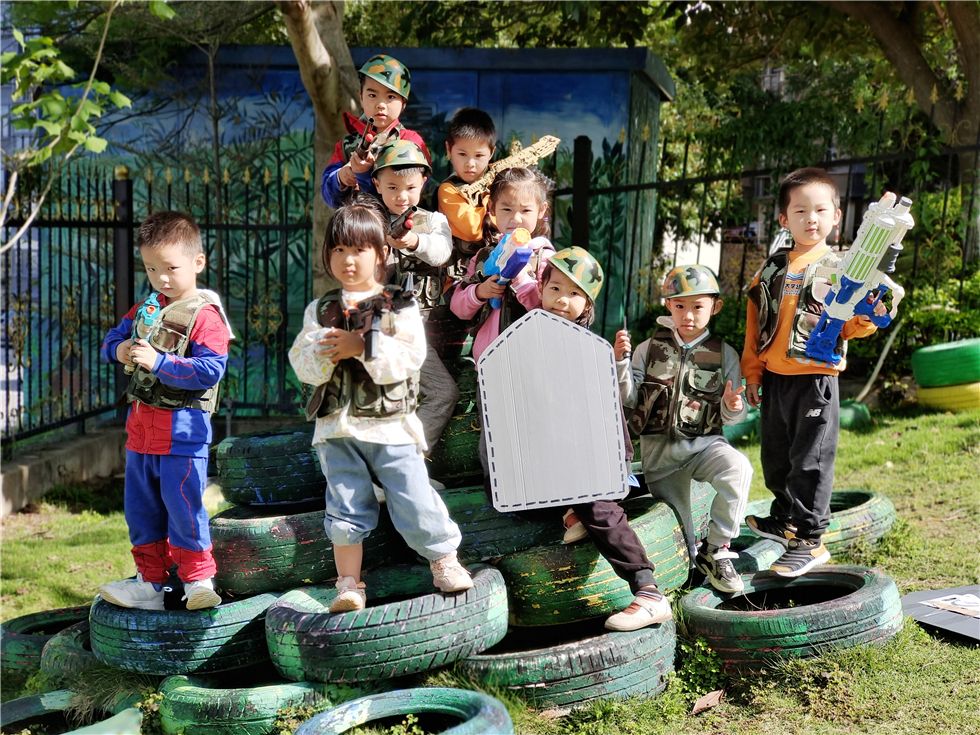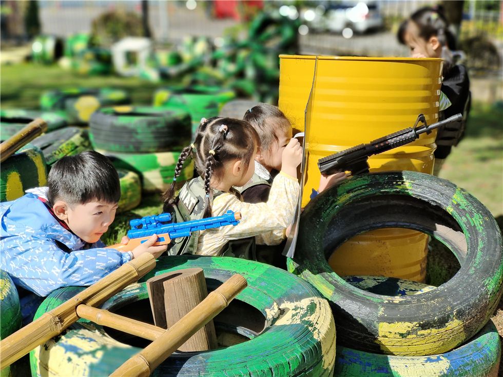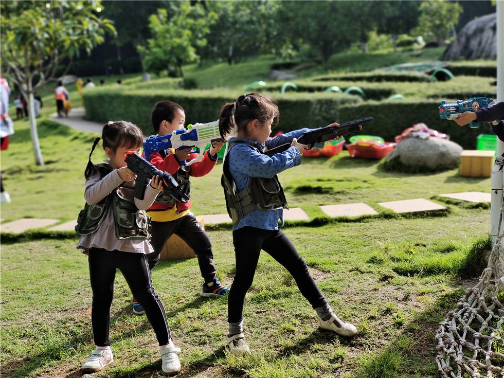 野战基地里,穿上“防弹衣”,带上武器,个个都是神气的“小战士”。