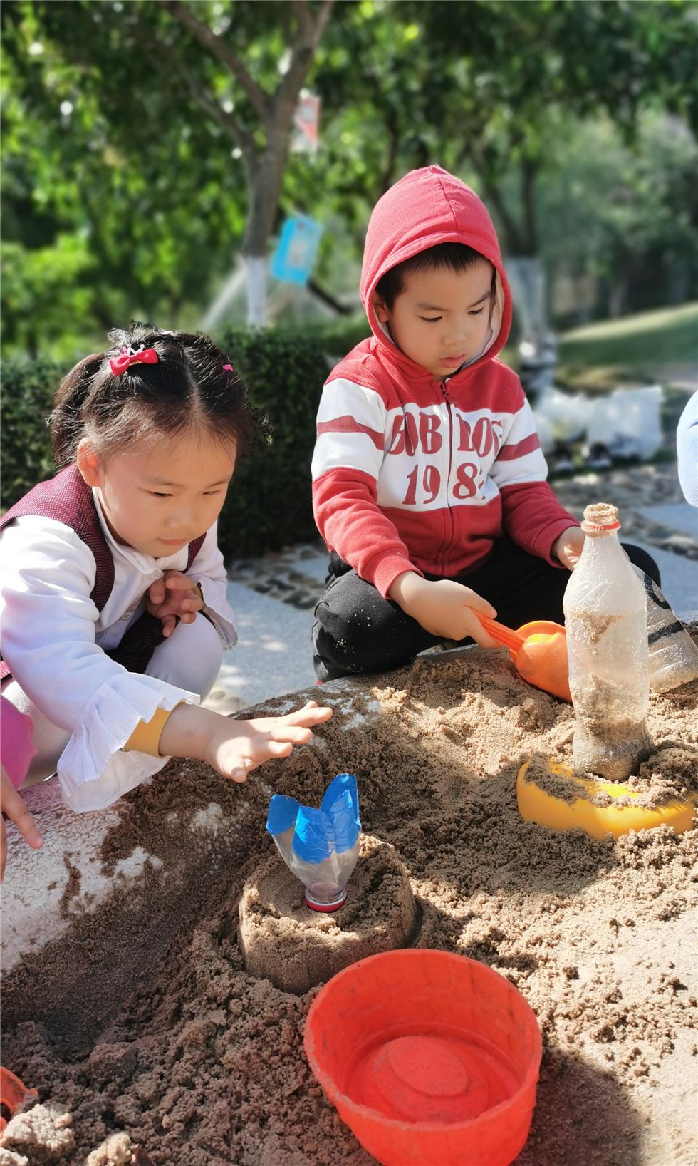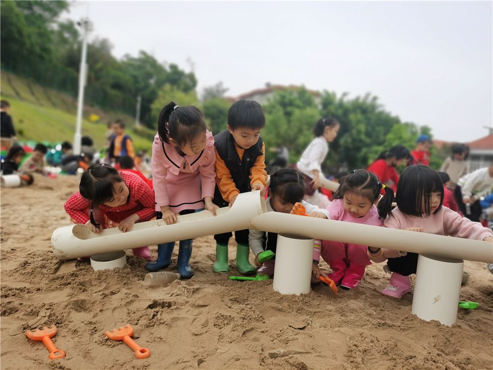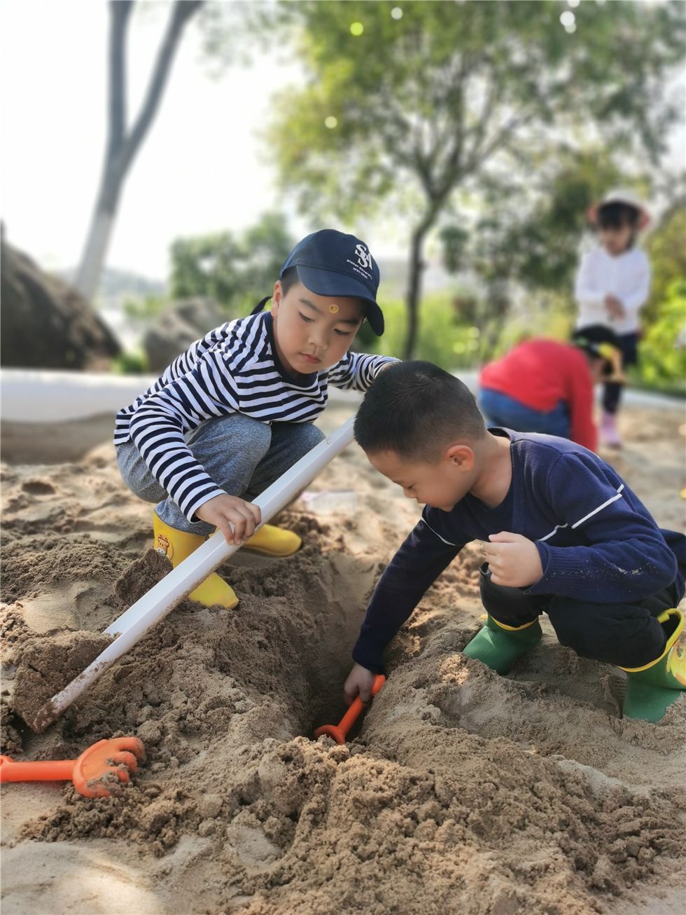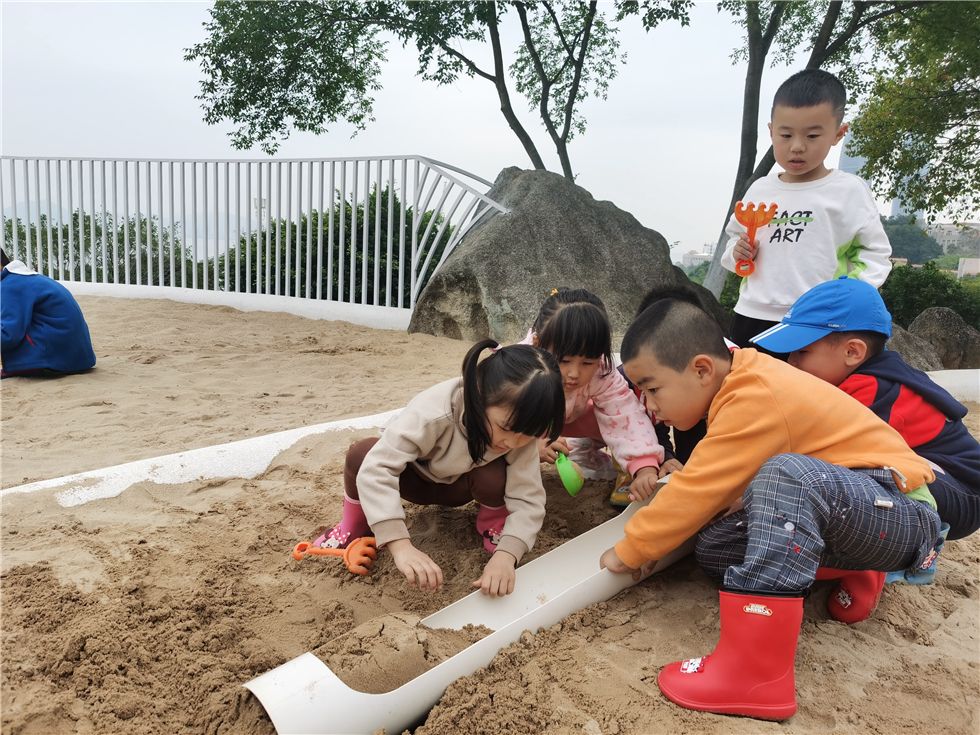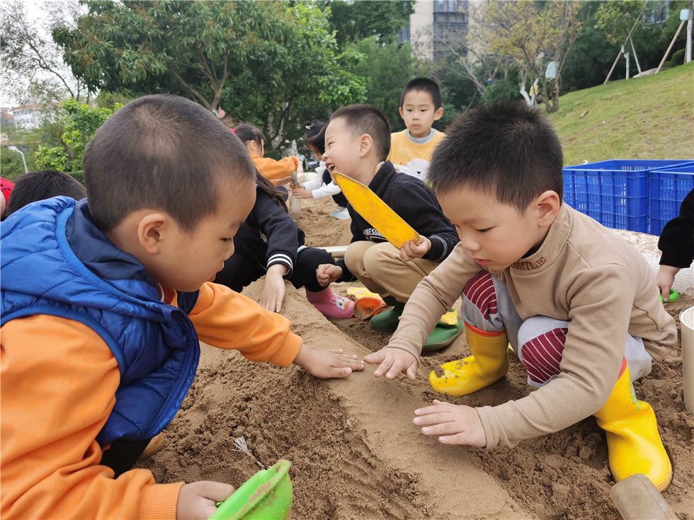 “玩沙”是极受孩子们喜欢的一项游戏。瞧,孩子们穿上雨鞋,带上丰富的工具来到了沙池。三个一群、两个一伙地,有的用铲子挖沙、有的把沙拍平、有的在搭城堡、有的在建桥、有的挖隧道……津津有味地建构着自己的乐园。