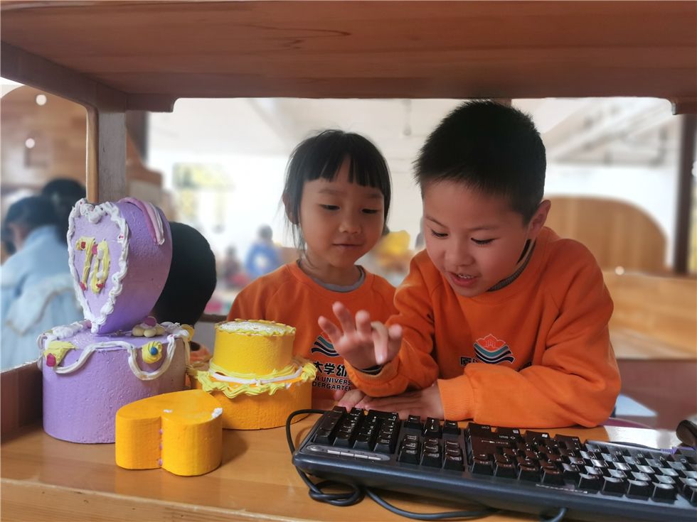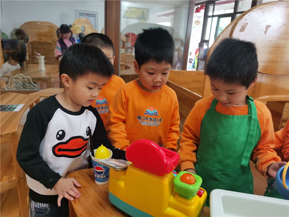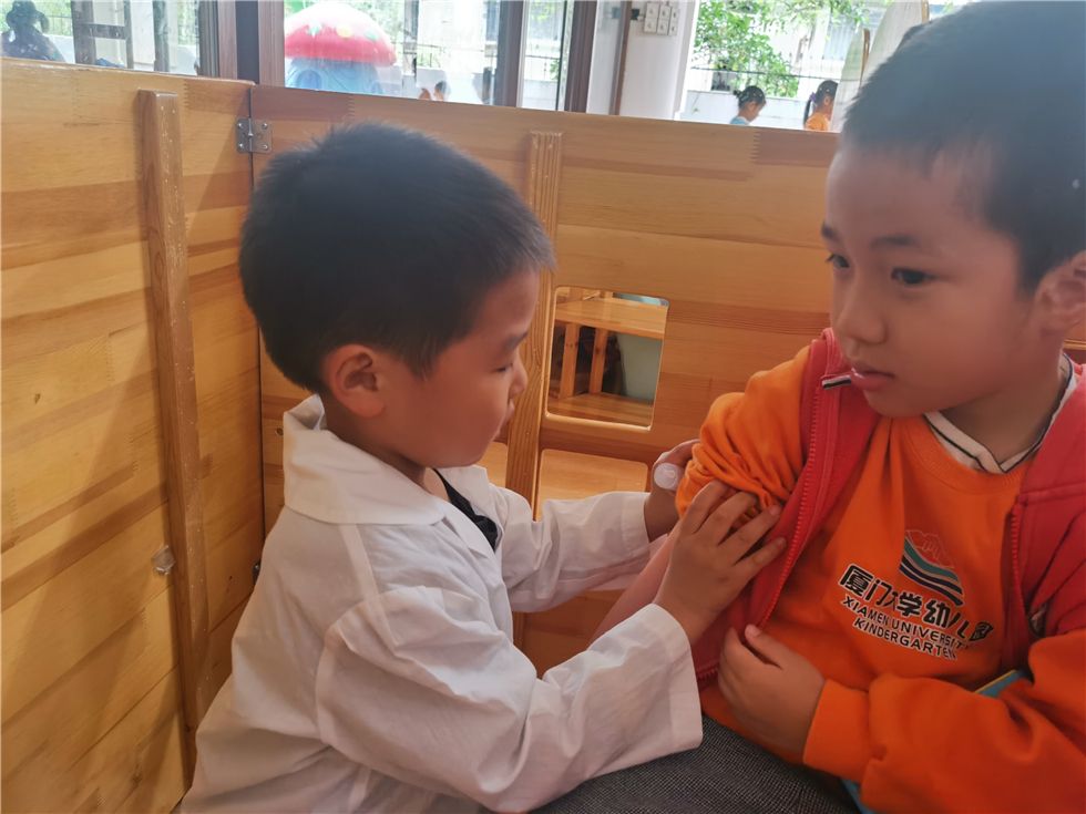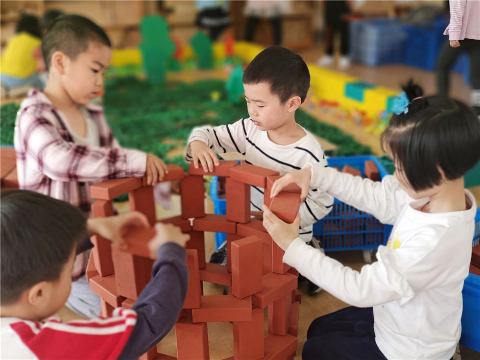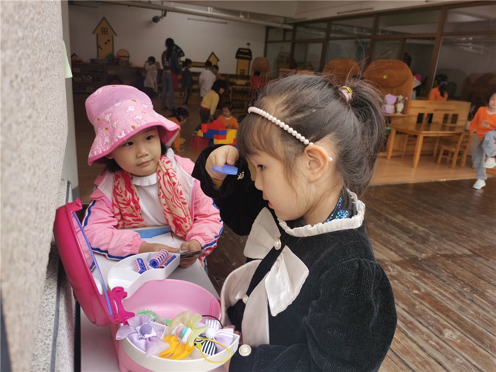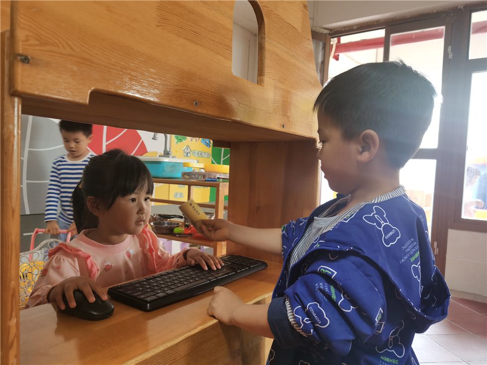 孩子们在角色游戏中,模拟扮演生活中的各种角色,共同布置场地,在合作游戏中体验快乐。
