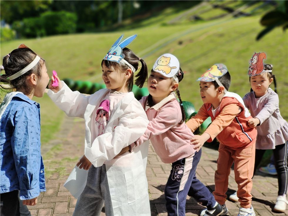 “我要扮演红蝴蝶。”“我能到黄花下面躲躲雨吗?”“哎呦,我的牙齿好痛啊!”“一起来帮助小熊拔牙!”……原来,这是孩子们在小山坡自己布置环境玩表演游戏,用动作和语态表现动物特征,与同伴合作将故事完整表现出来。