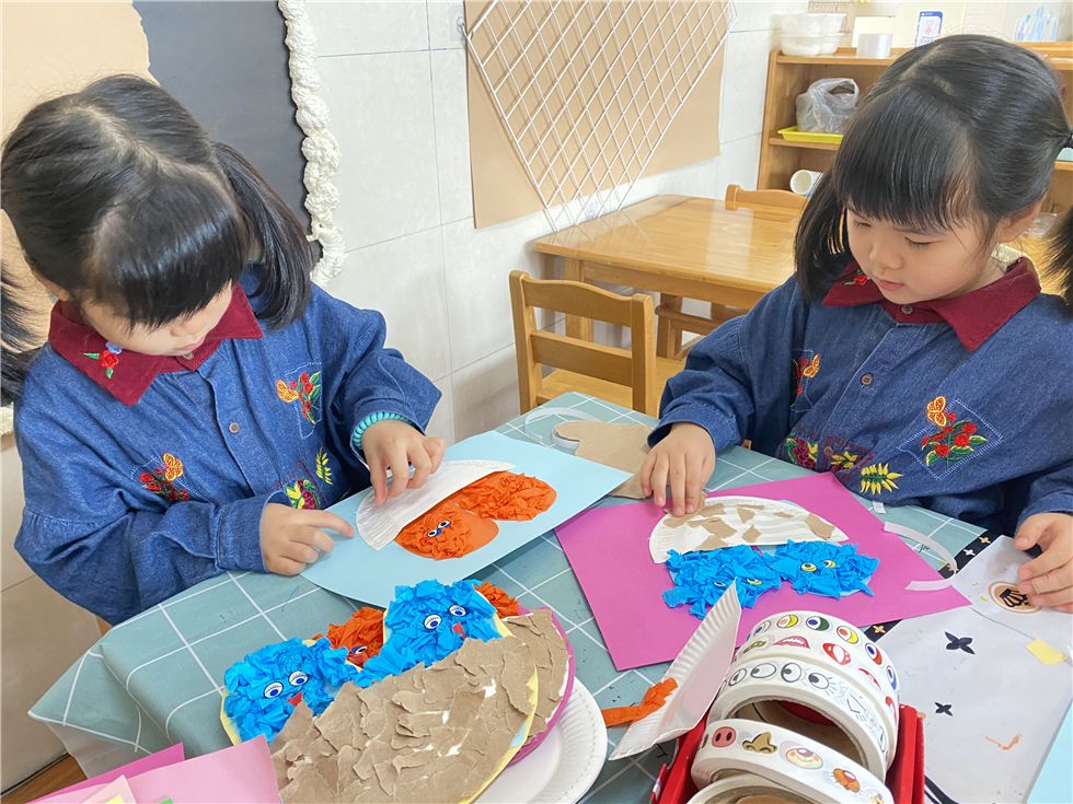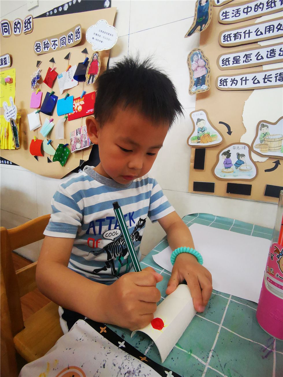 美工区为提供一个自由欣赏和创作让幼儿感受美,表现美的小天地。在这个小天地里,幼儿按照自己的意愿和兴趣来表达自己的体验和情感,任意享受创造活动的快乐。