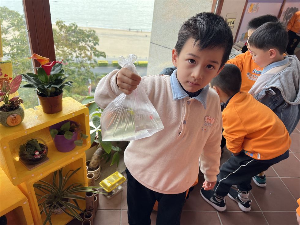 “我带来了好几条小鱼呢,有小黑、小红还有小白,哈哈。”
