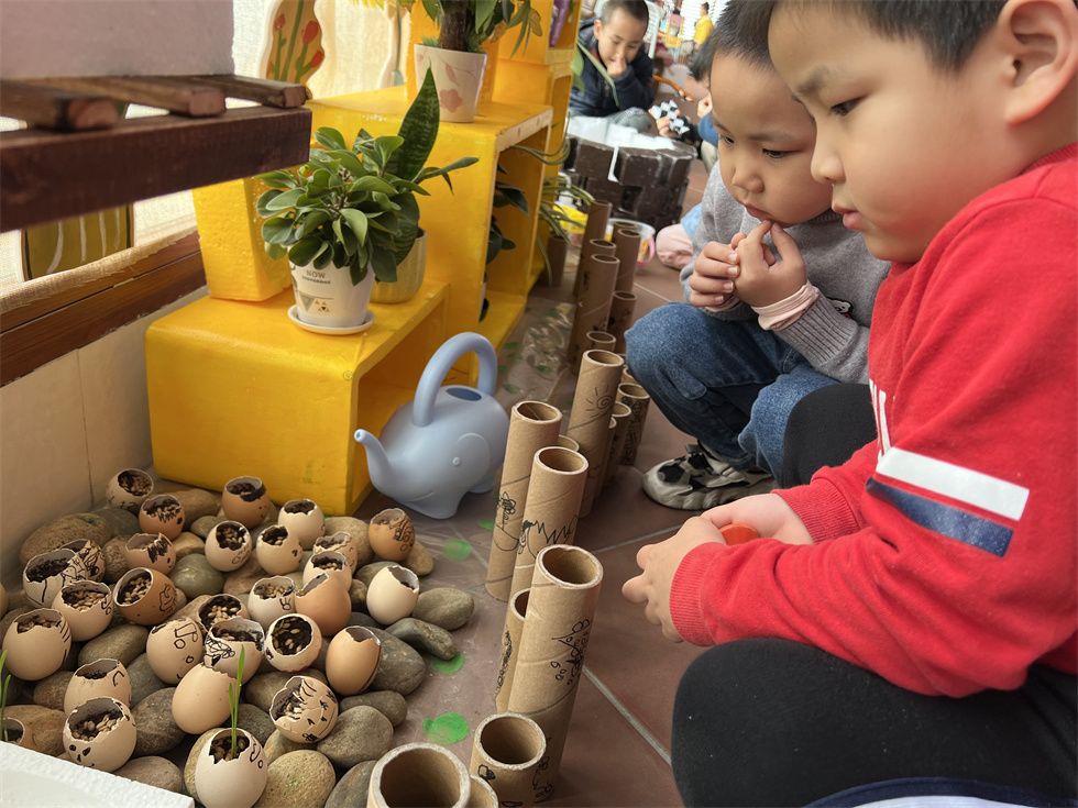 这天小朋友们好奇地聚集在一起开心地笑着,原来植物角出现了好多蛋壳,上面还有好多小表情呢!每个蛋壳宝宝的表情都不一样哦!