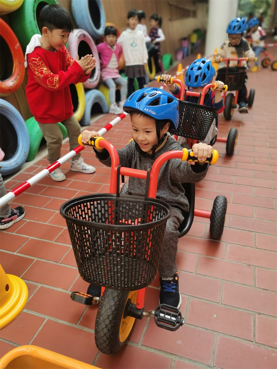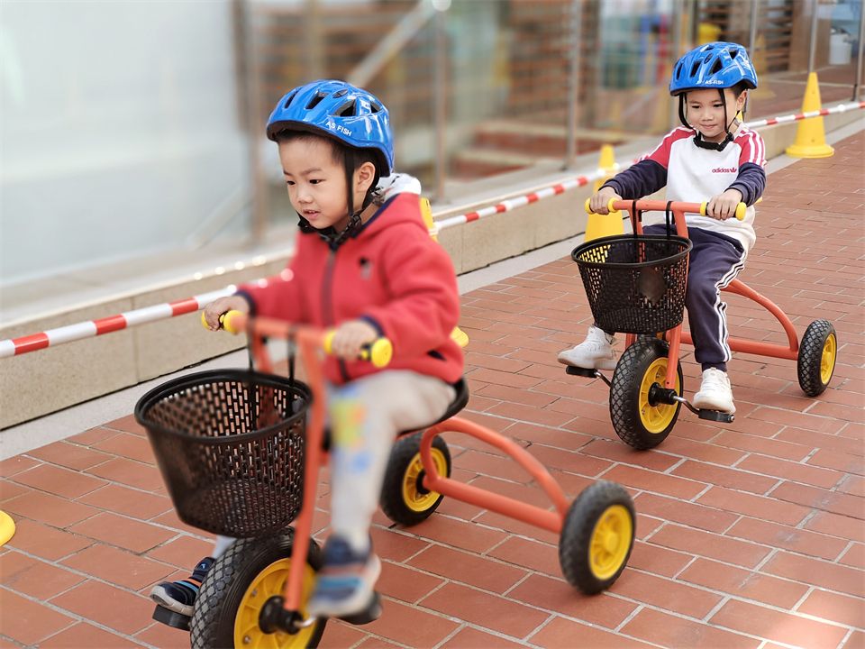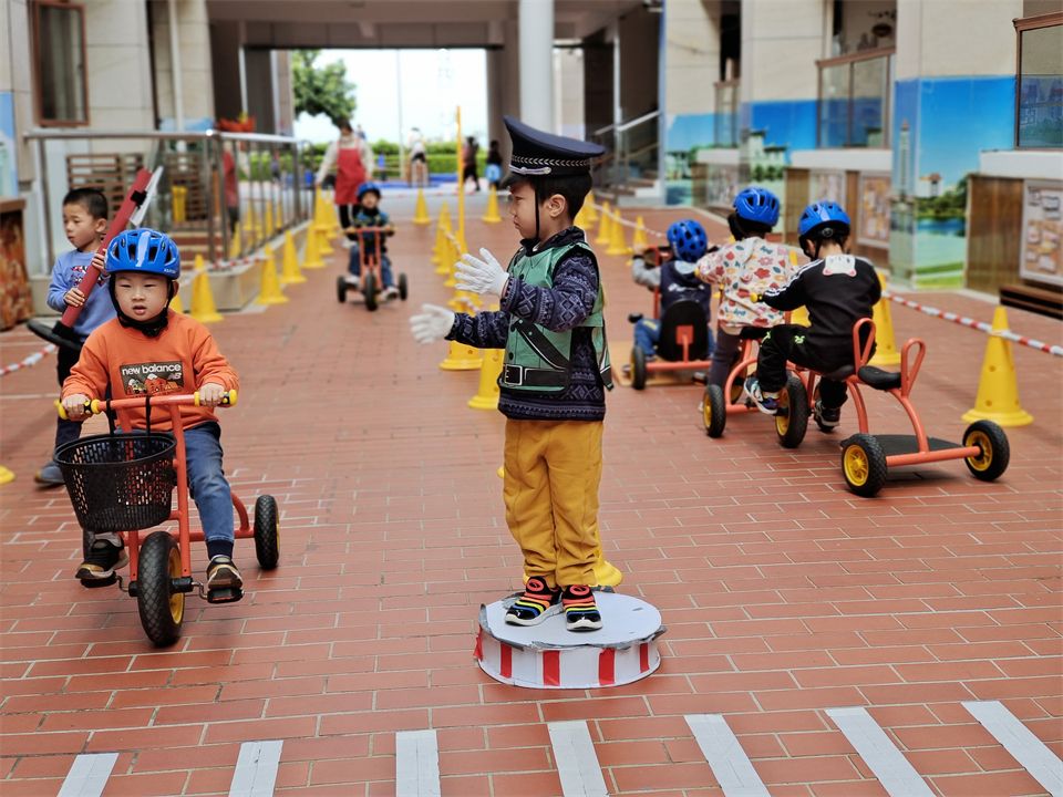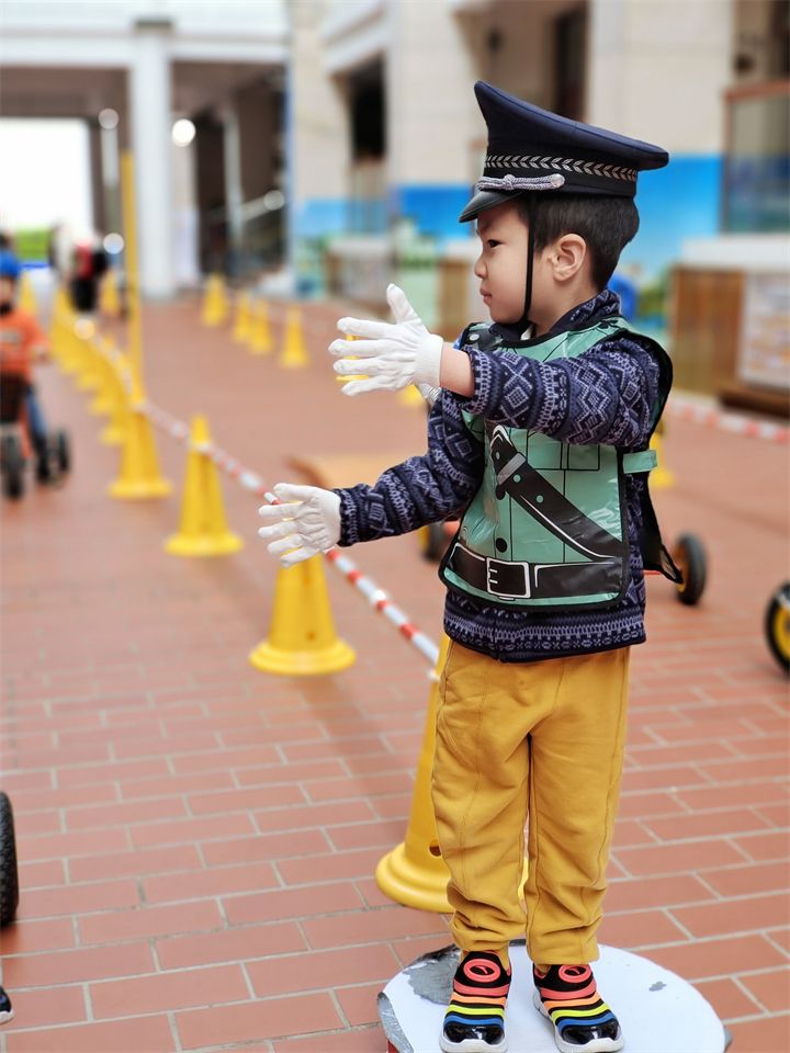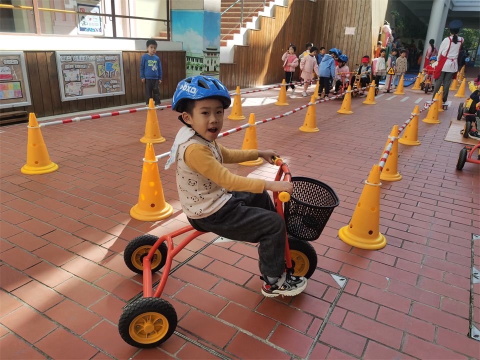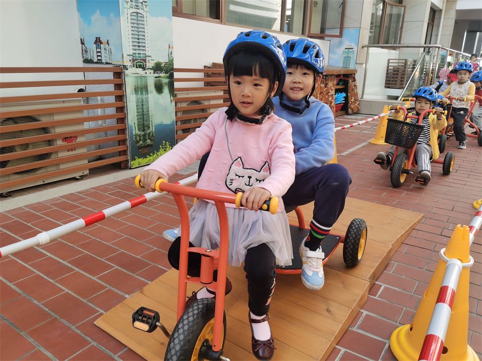 小司机们兴奋地骑着小车,小手控制车把,小脚蹬着脚蹬,用力踩,比比看看谁骑的快!记得看好小交警的指挥,遵守交通规则哦!