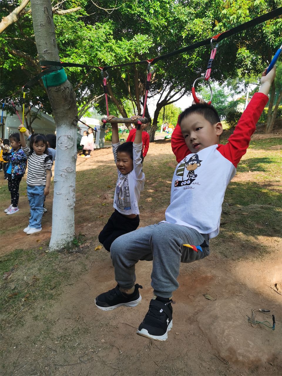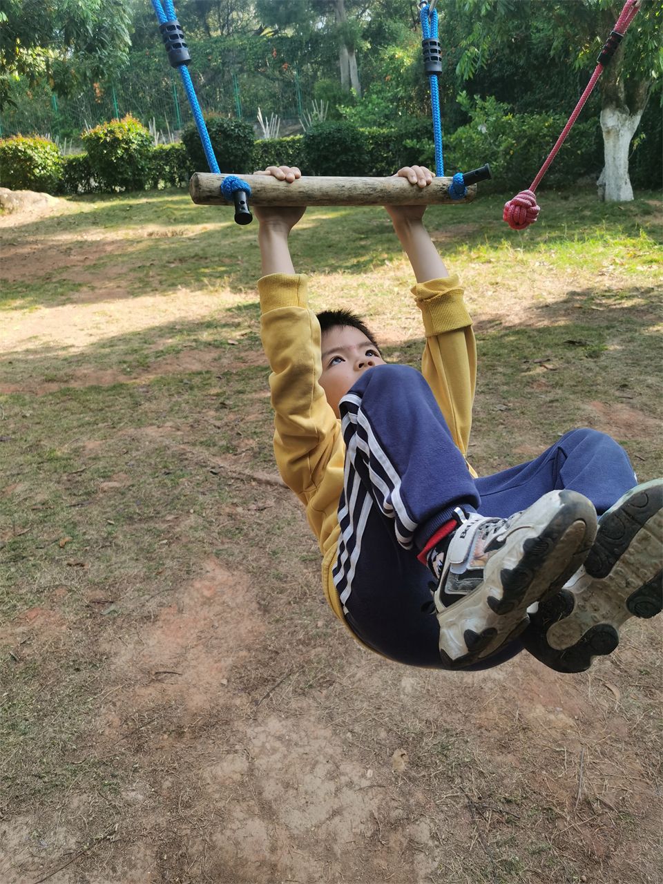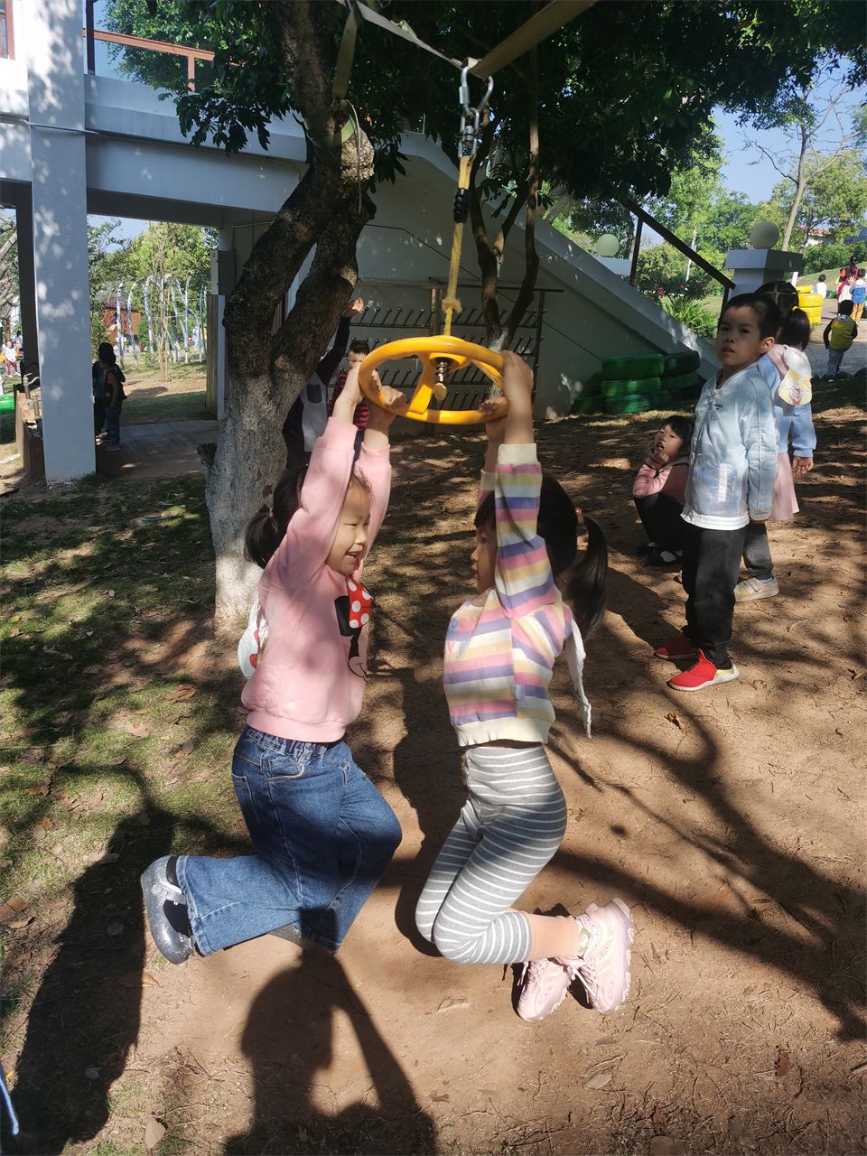 瞧,小树林里还有好几个吊环,可以训练手臂的力量。试试,跳起来,跳起来抓住吊环,哈哈,像在荡秋千。心中默数“1,2,3,4,5……”,耶,孩子们一天比一天进更步了!