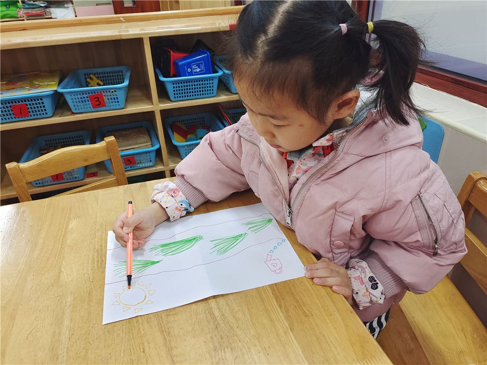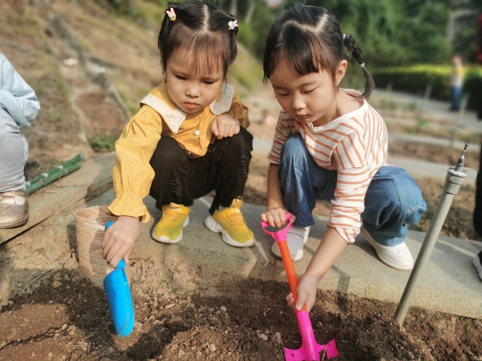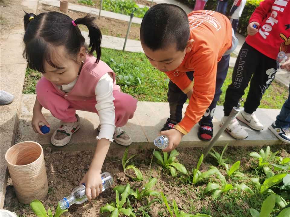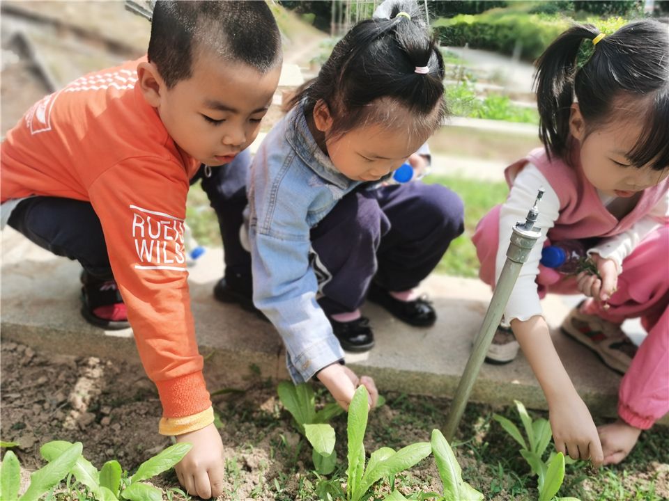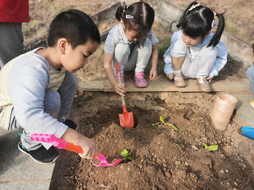 说干就干,宝贝们带着莴苣苗来到班级的菜地,拿起工具开始种莴苣苗。一个负责挖小坑,一个负责把莴苣苗轻轻地放进去,再用土把它压压紧,分工明确,有模有样;菜地里一片热火朝天的景象,宝贝们这个“小菜农”角色当得不亦乐乎。