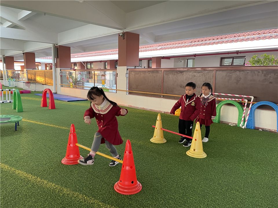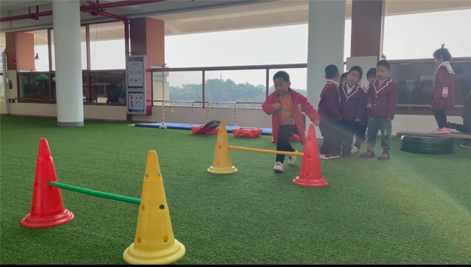 跨栏是插孔式的三角锥,小朋友挑战成功后还可以自己调整高度,增加难度呢!